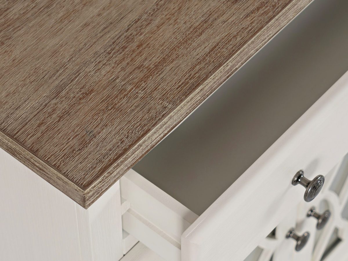 Elegancka komoda w jasnokremowym kolorze, doskonale wpasowująca się w klasyczne i nowoczesne wnętrza. Wykonana z drewna akacji, posiada jasnobrązowy blat oraz dwoje przeszklonych drzwi z ozdobnymi szprosami, które nadają jej unikalny charakter. Wygodna szuflada pozwala na przechowywanie drobnych przedmiotów, a regulowana wysokość półek zapewnia łatwą organizację przestrzeni. To idealny wybór do salonu, jadalni lub sypialni, łączący funkcjonalność z elegancją.