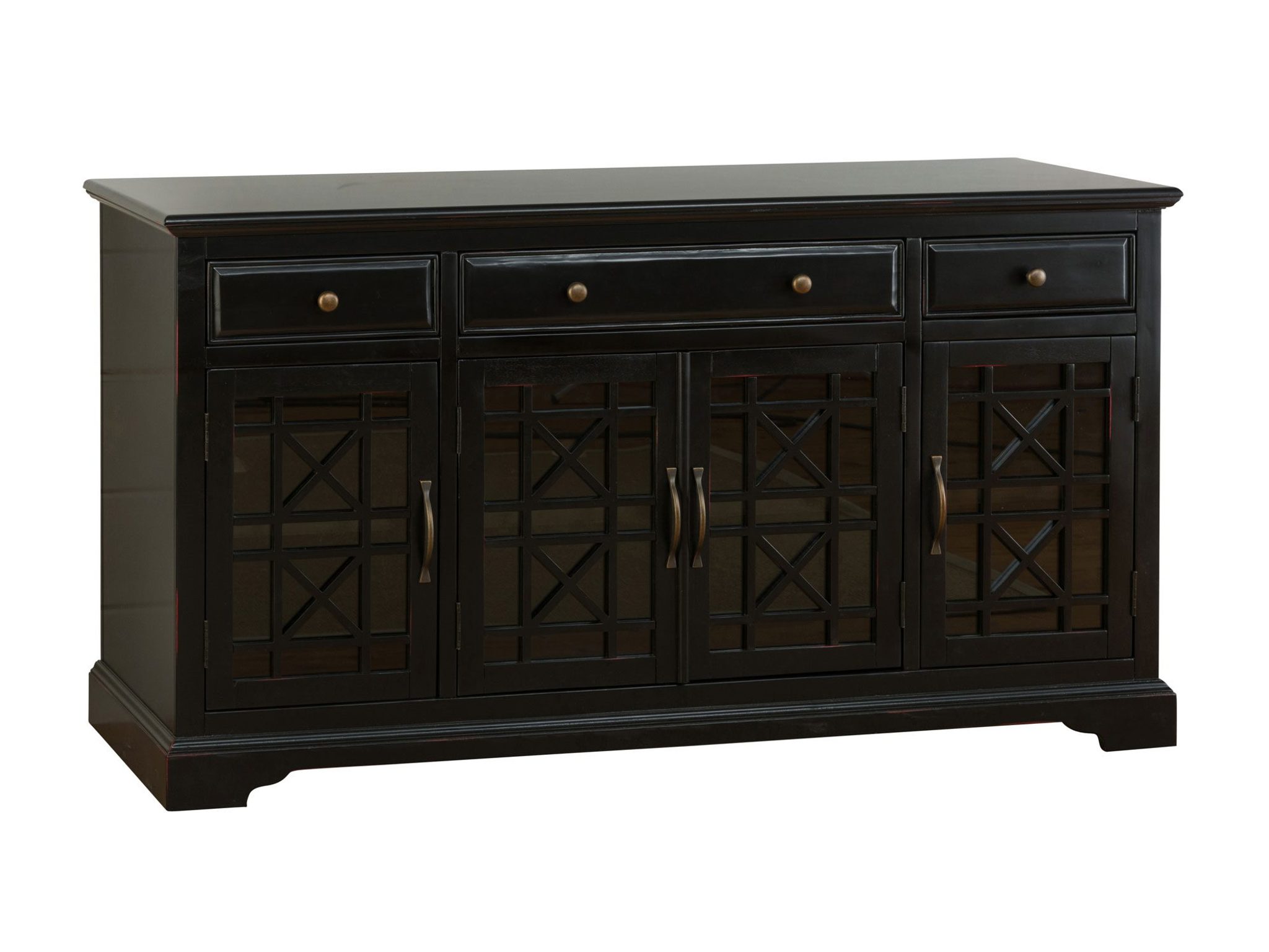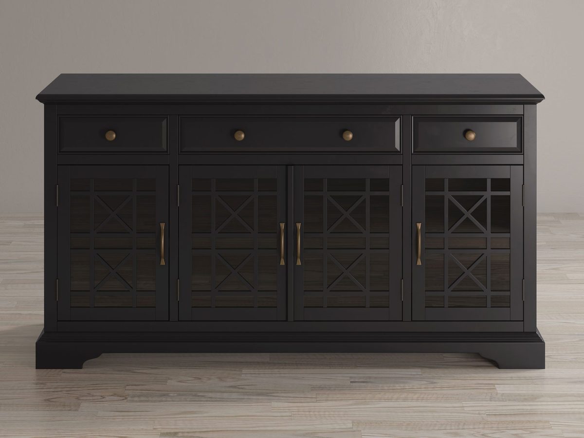 Czarna drewniana komoda z przeszklonymi drzwiami i dekoracyjnymi frontami w stylu klasycznym