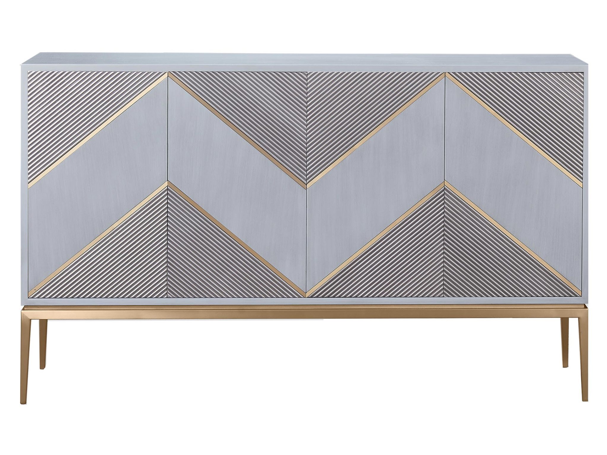 Stylowa komoda w subtelnym szarym odcieniu z eleganckimi złotymi akcentami. Ryflowane drewno połączone z gładkimi powierzchniami tworzy harmonijną bryłę, która doskonale wkomponuje się w nowoczesne i klasyczne wnętrza. Złote nogi i listwy dekoracyjne nadają całości luksusowego charakteru.