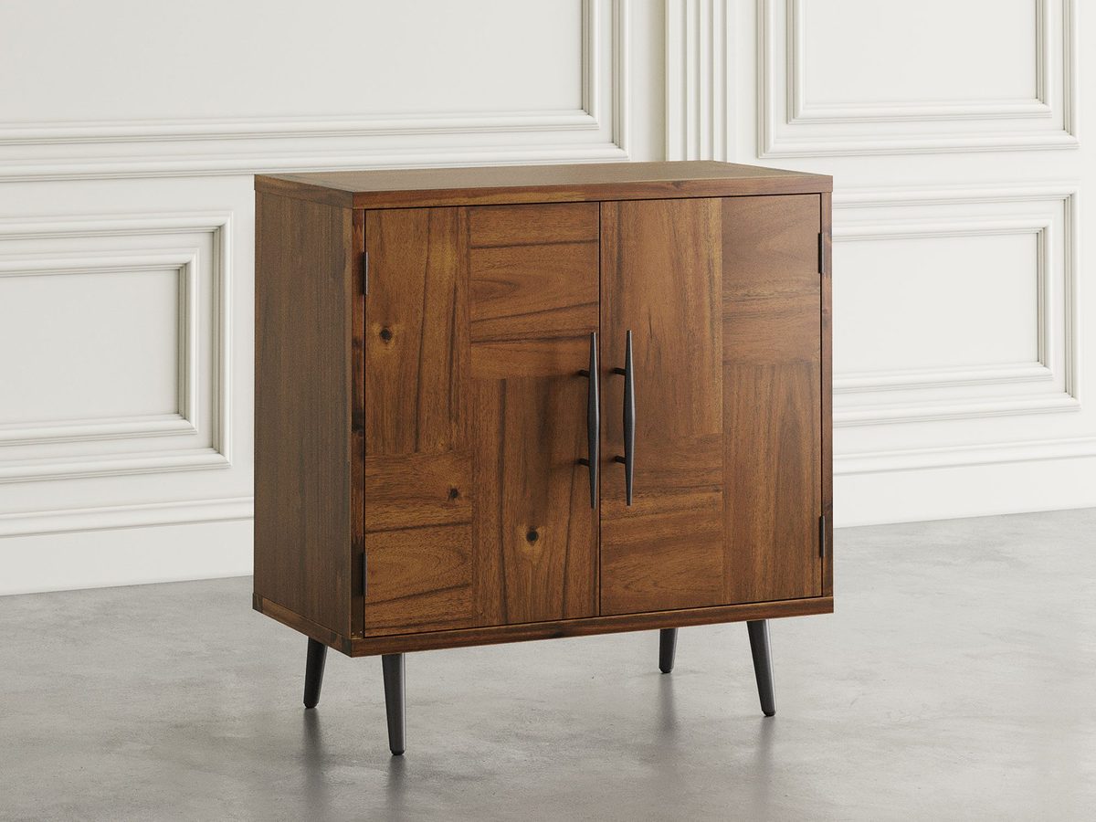 Komoda Avola w stylu Mid-Century Modern została starannie zaprojektowana z myślą o miłośnikach klasycznego, ale nowoczesnego designu. Wykonana z wysokiej jakości drewna akacji, z dodatkiem czarnych, metalowych nóżek, łączy w sobie solidność z elegancją. Fronty komody zostały ozdobione unikalną intarsją, która nawiązuje do wzoru parkietowego, co dodaje jej wyrafinowanego charakteru. Dzięki regulowanej wysokości półek, komoda jest bardzo funkcjonalna, pozwalając na wygodne przechowywanie różnych przedmiotów. Jej prosta forma oraz ciepły cedrowy kolor drewna sprawiają, że mebel doskonale komponuje się w wielu stylach aranżacji – od klasycznego, przez retro, po nowoczesny.