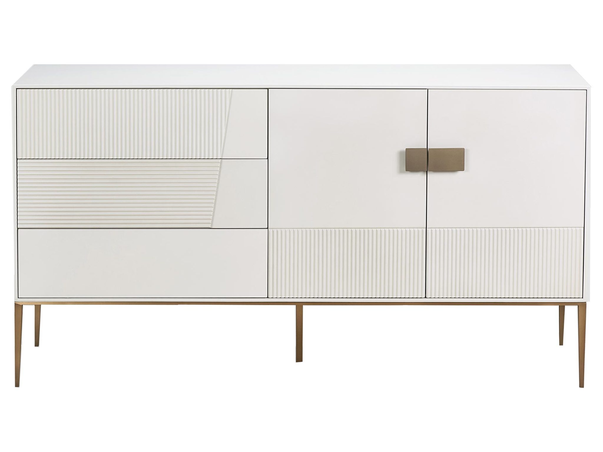 Elegancka komoda w subtelnym odcieniu złamanej bieli, wzbogacona złotymi akcentami i nóżkami. Prosty design uzupełniają gładkie fronty, które współgrają z delikatnymi ryflowaniami, nadając meblowi wyjątkowy charakter.