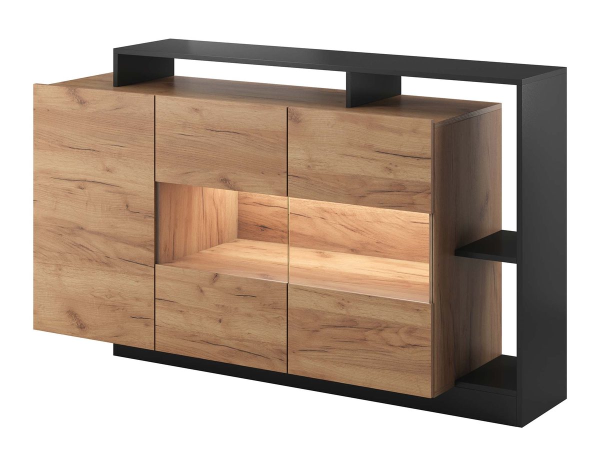 Komoda z drzwiczkami została wyposażona segment trzydrzwiowy i świetnie pasujące, bardzo nowoczesne półki. Dzięki temu komoda doskonale przyda się do przechowywania różnych przedmiotów i utrzymania ładu w domu czy mieszkaniu. Ponadto mebel wyróżniają stabilny korpus oraz piękne, przyjazne dla oka oświetlenie. Dodatkowo na dużym blacie z powodzeniem można ustawić rodzinne zdjęcia lub inne drobiazgi. Elegancki design i przeszklone części dodają komodzie stylu natomiast dodatkowe półki wyglądają niespotykanie elegancko i gustownie. Funkcjonalna komoda została wyprodukowana z materiałów najwyższej jakości, laminowanych płyt meblowych. Komodę w dodatku zabezpieczono obrzeżem ABS, które sprawia, że jest ona odporna na zniszczenia, wzmacnia trwałość i zabezpiecza przed wilgocią, a także uszkodzeniami mechanicznymi.