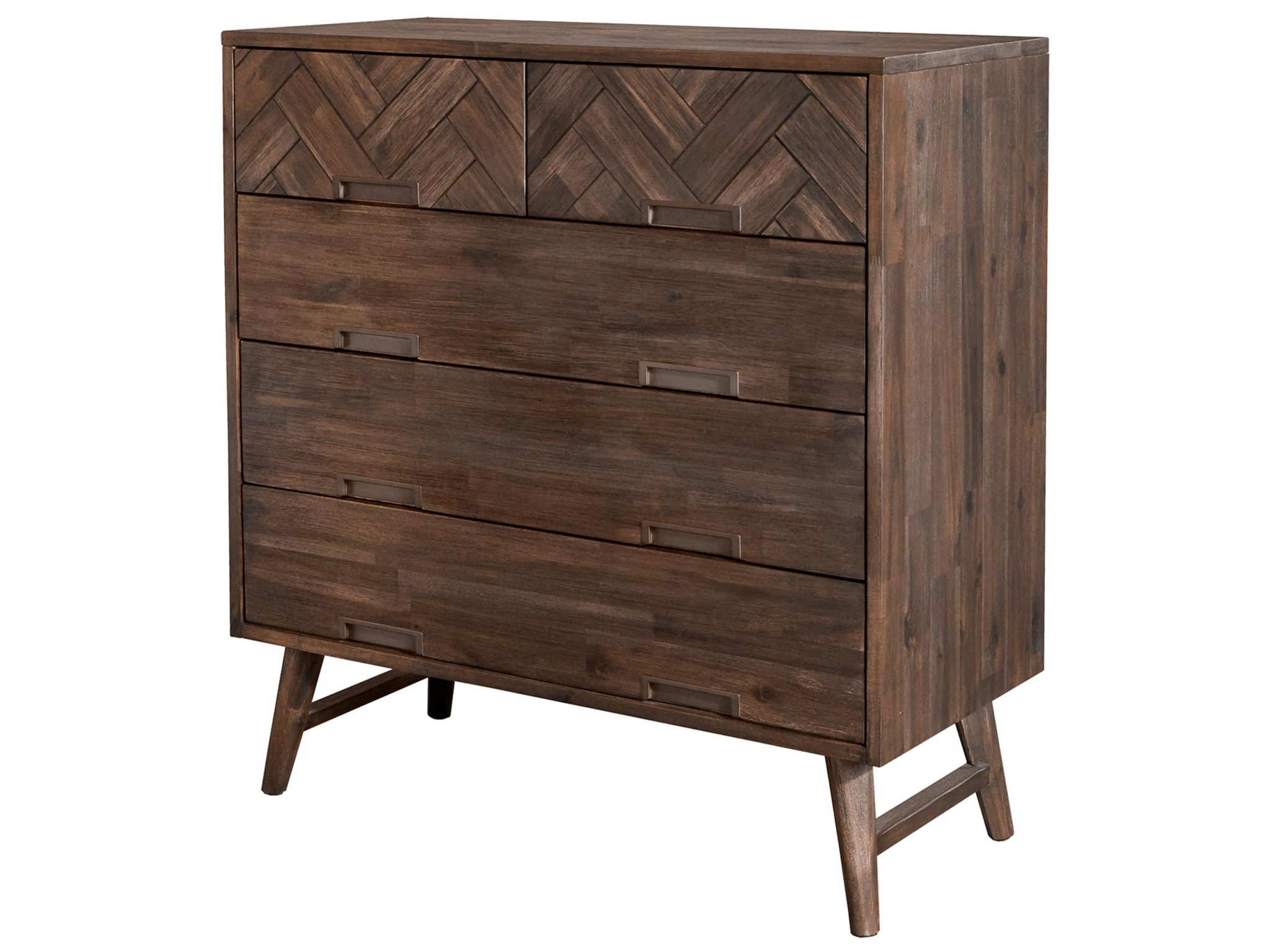 Komoda Willowbrook łączy klasyczny urok stylu retro z funkcjonalnością i nowoczesnymi detalami. Wykonana z litego drewna akacji o ciepłym ciemnobrązowym zabarwieniu, doskonale wpisuje się w styl vintage i boho. Fronty komody z intarsją w jodełkę oraz metalowe uchwyty w kolorze mosiądzu nadają jej elegancki charakter. Posiada pięć przestronnych szuflad, w tym jedną z dekoracyjną intarsją, zapewniając odpowiednią ilość miejsca na przechowywanie. Ta w pełni drewniana komoda z solidną konstrukcją jest doskonałym wyborem do wnętrz urządzonych w tradycyjnym lub klasycznym stylu.