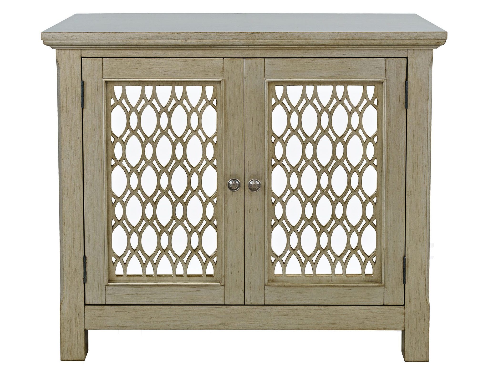 Elegancka komoda w złotym kolorze z ozdobnymi szprosami i lustrzanymi drzwiami. Wykonana z drewna akacji, wyróżnia się gładkim wykończeniem powierzchni, nadając wnętrzu klasy i stylu.