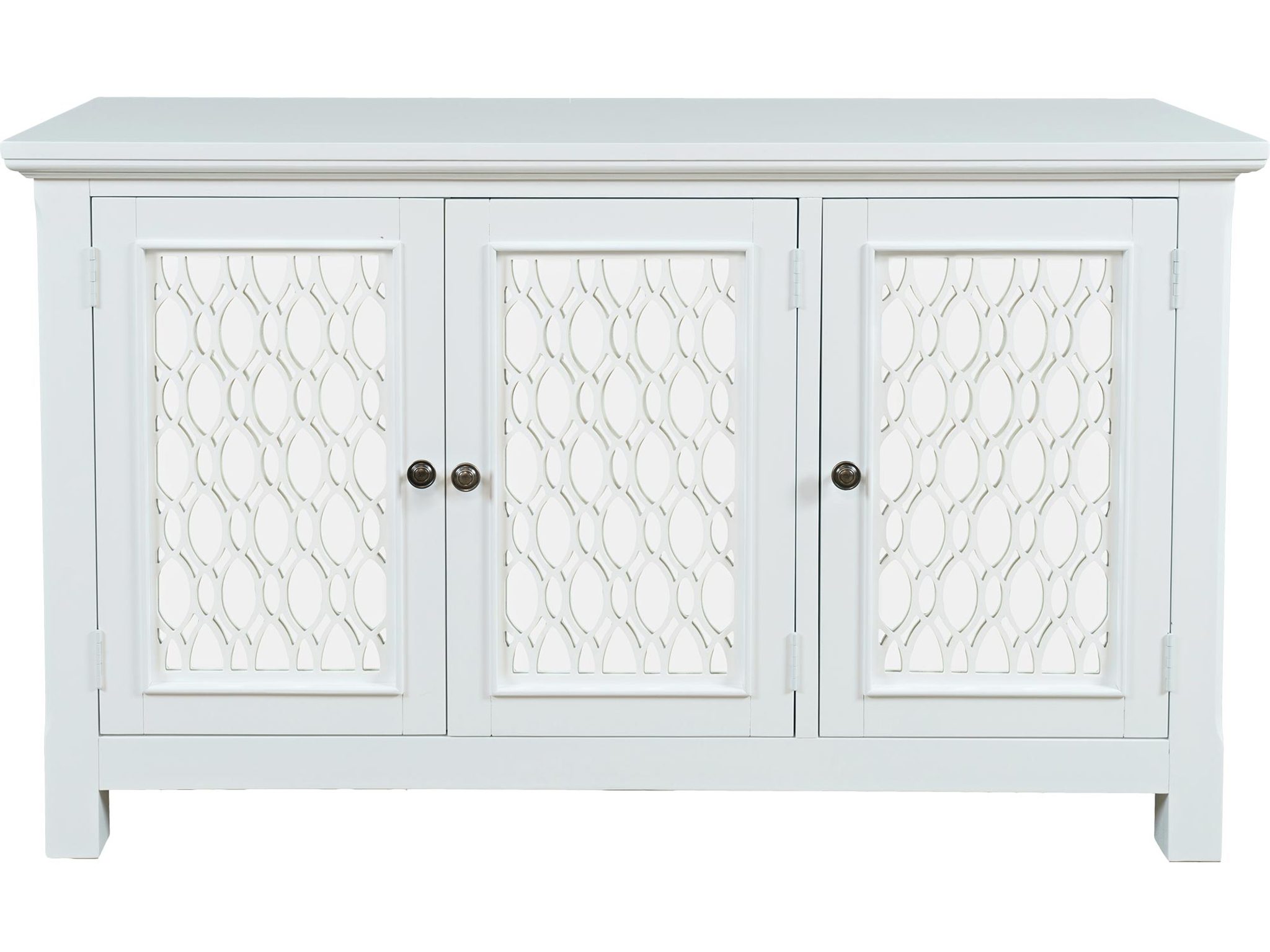 Elegancka komoda w kolorze białym z lustrzanymi drzwiami wykończonymi ozdobnymi szprosami. Mebel wykonany z drewna akacji z gładkim wykończeniem powierzchni.