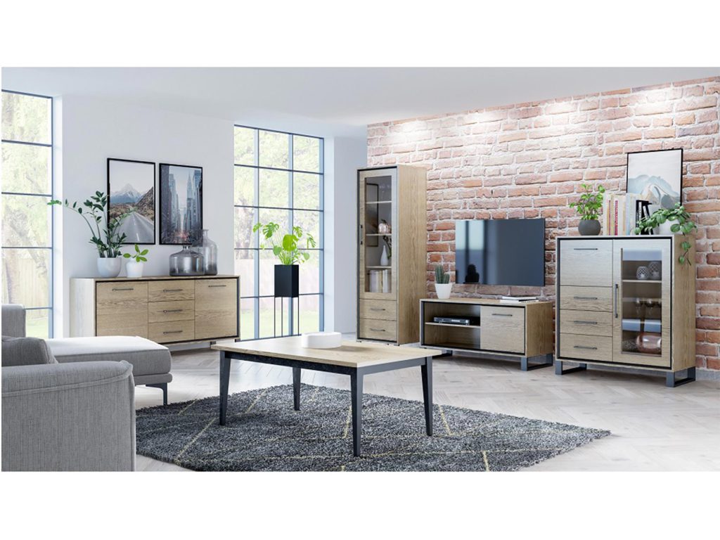 Zestaw mebli do salonu z drewnianymi frontami, styl industrialny