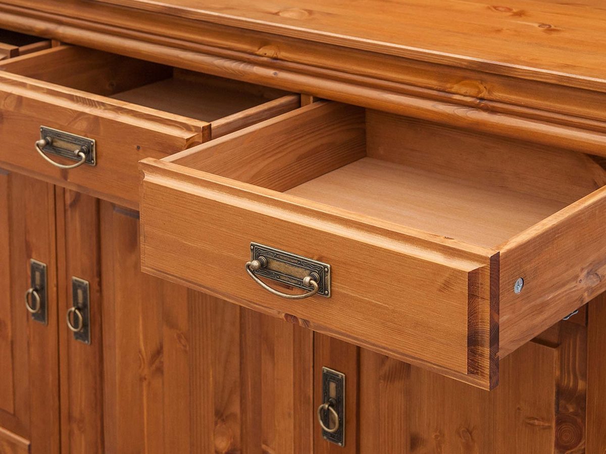 Co najistotniejsze, mała komoda ANADI z szufladami została wykonana z litego drewna sosnowego. Niewątpliwie gwarantuje to solidność wykonania i doskonałą trwałość. W połączeniu z ozdobnym cokołem, subtelnymi frezami na drzwiczkach i wieńcem na styl prowansalski, tworzy elegancki, schludny i ponadczasowy mebel na pokolenia. Co więcej dostępność kilku wybarwień pozwala na dopasowanie mebla do każdego wnętrza, znajdzie się wariant dla fanów klasyki i prostoty jak i nieszablonowości. Dodatkowo uchwyty stylizowane na stare złoto dodają meblu charakteru i unikatowości. Ponadto szuflady komody oparte są na prowadnicach z systemem cichego domyku, co umila użytkowanie i dodatkowo chroni mebel przed uszkodzeniami.