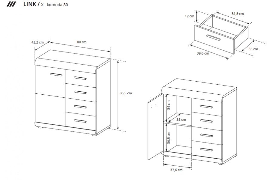 Nowocześnie urządzone wnętrze to takie, które uwzględnia nie tylko estetykę, ale również funkcjonalność. Przede wszystkim stylowa komoda 80 LINK jest doskonałym przykładem mebla na miarę naszych czasów. Z pewnością Subtelna, delikatna linia komody dąb sonoma sprawia, że mebel idealnie pasuje nie tylko do salonu, czy pokoju młodzieżowego, ale również domowego biura, czy przedpokoju. Ponadto całość stylistyki mebla dopełniona została przez proste, subtelne uchwyty, dzięki temu nie ma również problemu z doborem dekoracji do wnętrza. Dodatkowo bazą dla komody jest wysokiej klasy płyta laminowana, dzięki której jest to wyrób trwały i odporny na uszkodzenia. Wraz z pozostałymi elementami serii, komoda LINK 80 tworzy spójną i harmonijną całość. Zobacz również dostępne w naszym sklepie komody drewniane.