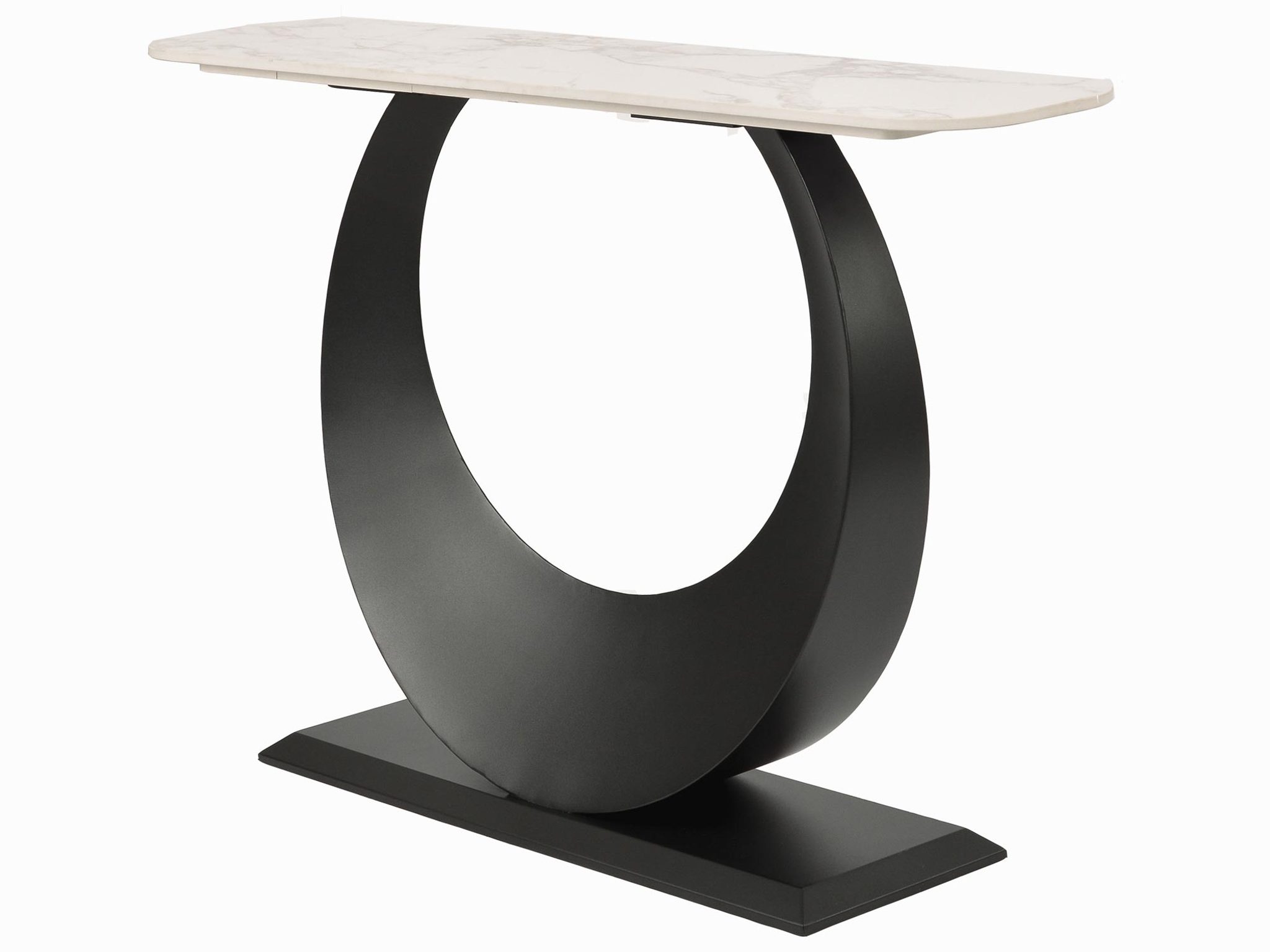 Nietuzinkowa konsola wykonana z żelaza w kolorze czarnym z białym blatem imitującym marmur. Konstrukcja konsoli ma kształt księżyca osadzonego na prostokątnej podstawie z blatem o zaokrąglonych brzegach.