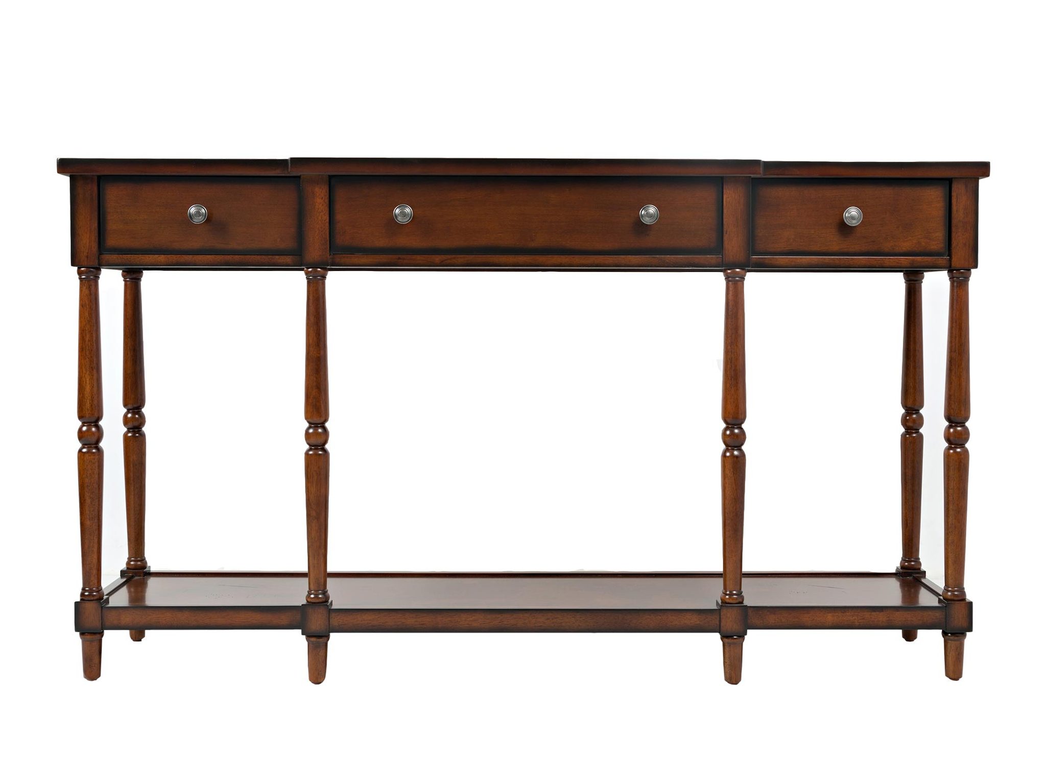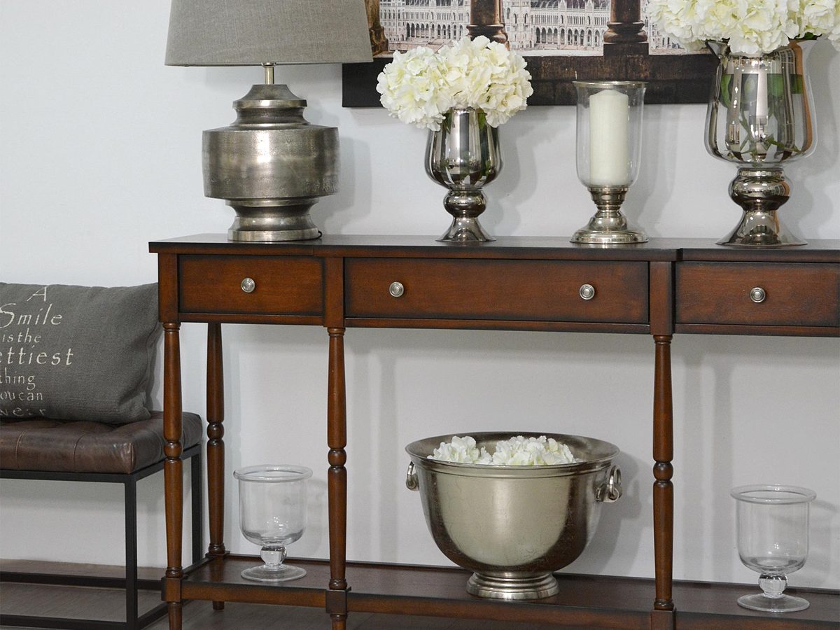 Elegancka konsola w stylu Hampton, która łączy funkcjonalność z unikalnym designem. Wykonana z drewna kauczukowca, wyróżnia się subtelnymi, ale charakterystycznymi postarzeniami w postaci kornikowania na blacie, półce i frontach. Stylowe toczone nóżki oraz prostokątne uchwyty dodają jej klasycznego charakteru, a praktyczne szuflady i półka oferują dodatkową przestrzeń do przechowywania. Kolor antycznego mahoniu w połączeniu z postarzanymi detalami sprawia, że mebel idealnie pasuje do wnętrz w stylu rustykalnym, vintage czy Hampton.
