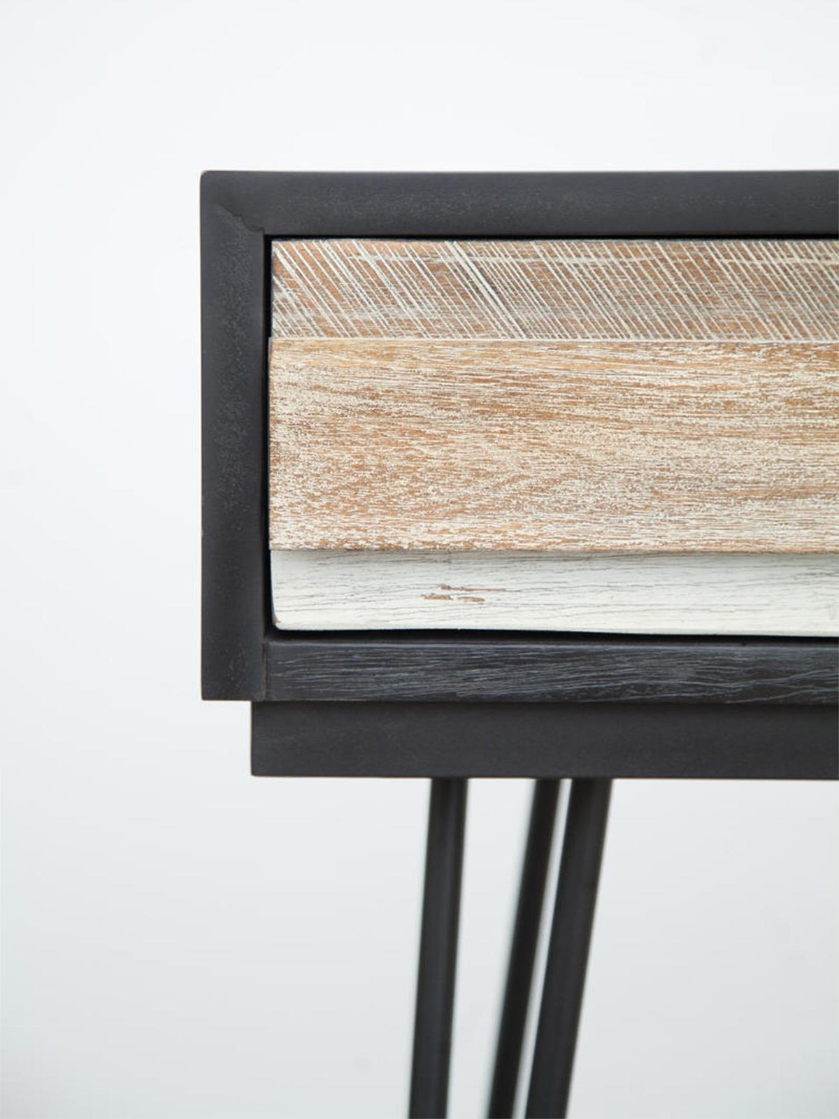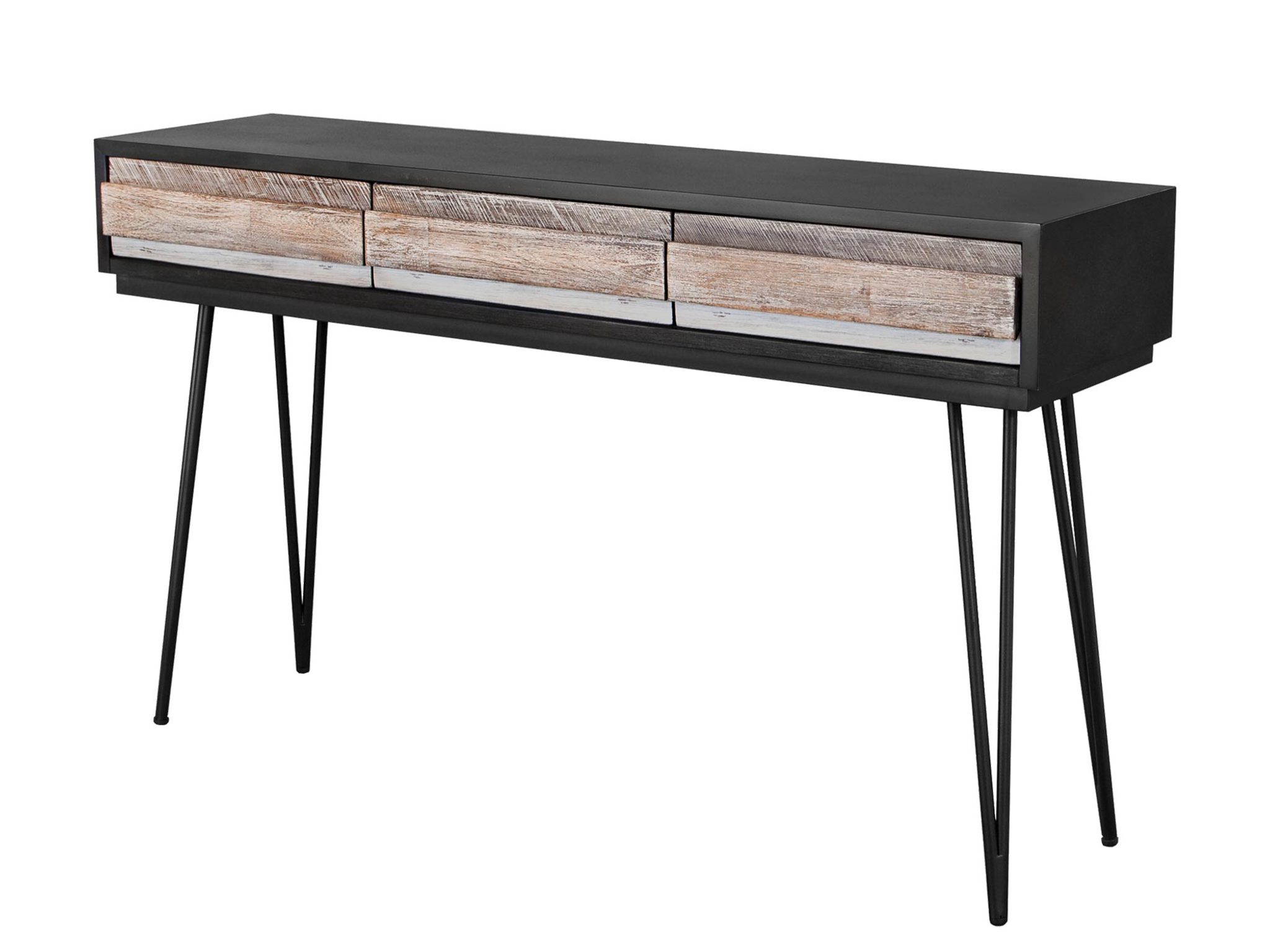 Konsola z litego drewna w stylu retro z oryginalnymi frontami. Na frontach struktura 3D. Komoda posiada metalowe nogi w kolorze czarnym. Czarny korpus z płyty MDF idealnie współgra z frontami w odcieniach szarości i beżu. Szuflady wyłożone aksamitem.