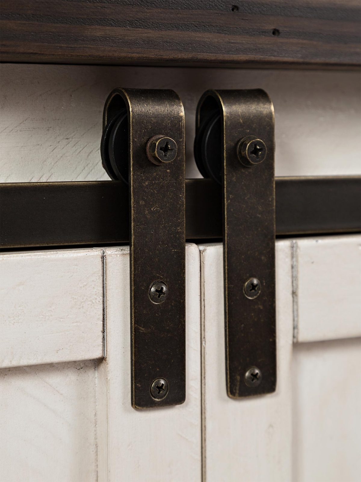 Antyczna biel, w połączeniu z brązowym blatem, stanowi elegancką paletę kolorystyczną, która doskonale współgra z naturalnym usłojeniem drewna. Metalowe okucia oraz przesuwne drzwi dodają meblowi charakterystycznego, surowego wyglądu, który będzie pasować do loftowych, wiejskich, czy skandynawskich wnętrz.