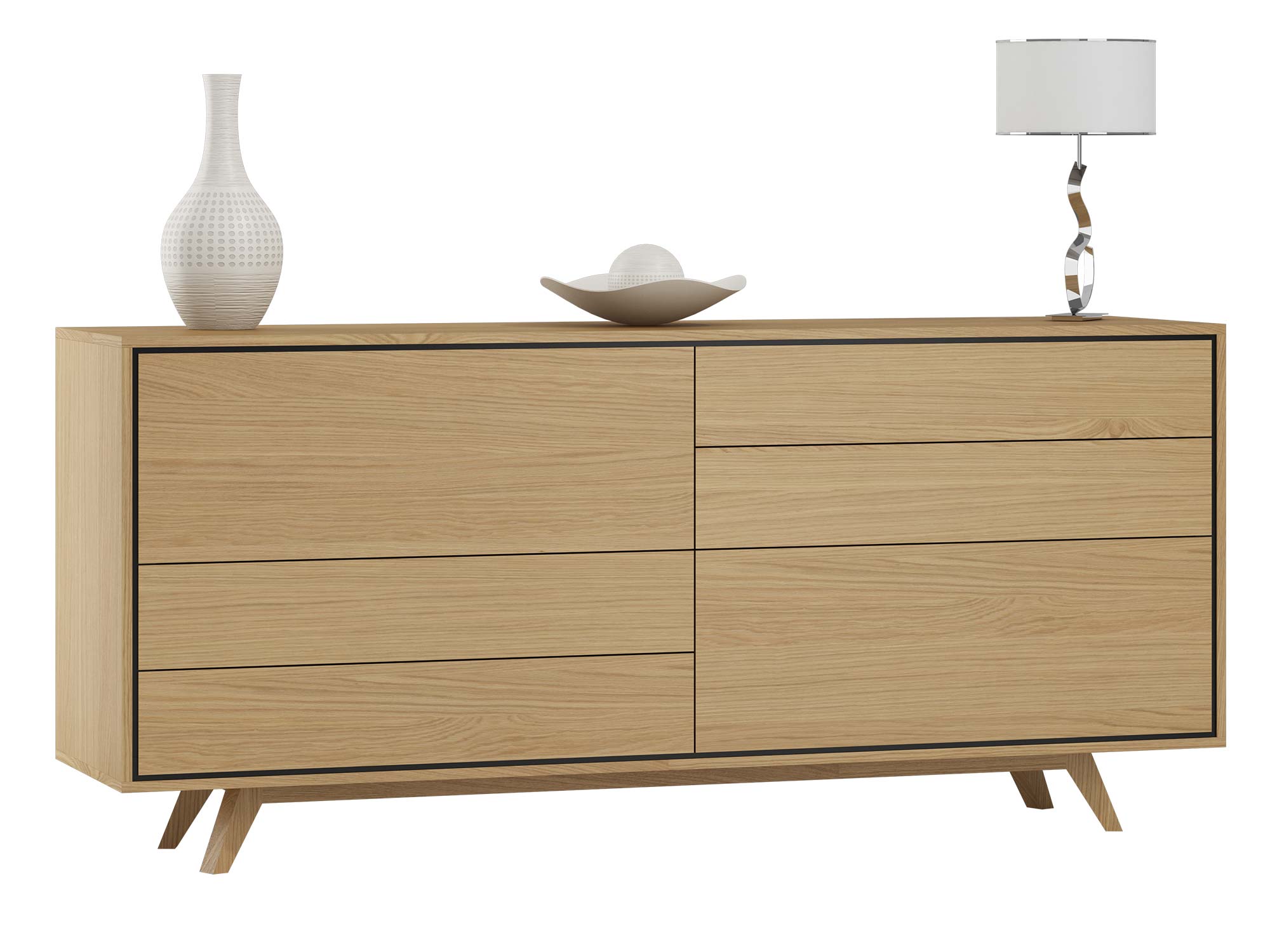 Kredens Saviero to mebel, który zachwyca już od pierwszego spojrzenia. Geometryczne kształty, inspirowane nowoczesnym wzornictwem, tworzą harmonijną bryłę, która jednocześnie jest praktyczna i designerska. Wykończenie w naturalnym dębowym fornirze podkreśla szlachetność drewna, a czarne wstawki dodają kontrastu i charakteru, czyniąc z tego kredensu mebel nietuzinkowy.