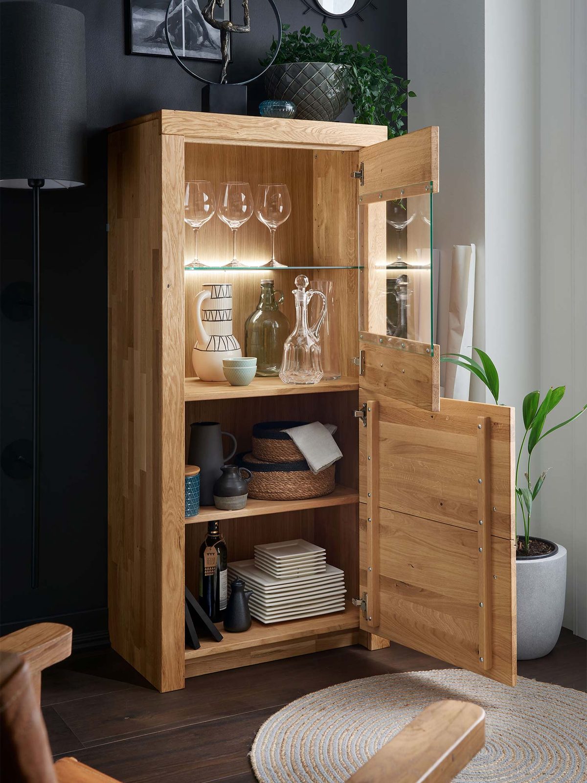 Kredens IV to harmonia przechowywania i dekoracji w jednym. Jego design składający się z szafki oraz przeszklonej części, pozwoli Ci nie tylko elegancko przechowywać różne przedmioty, ale również wyeksponować ulubione dekoracje.