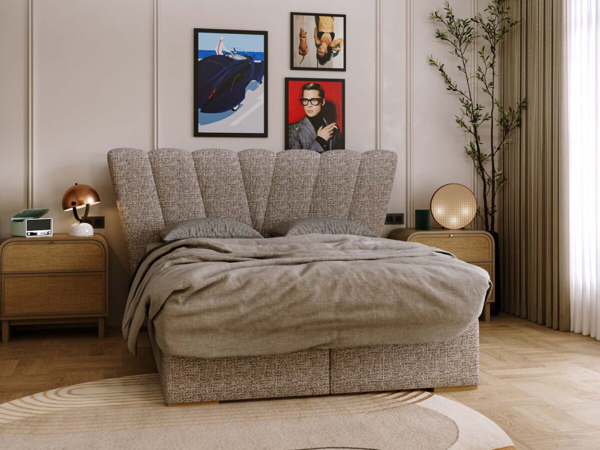 Łóżko kontynentalne beżowe z wachlarzowym zagłówkiem przód