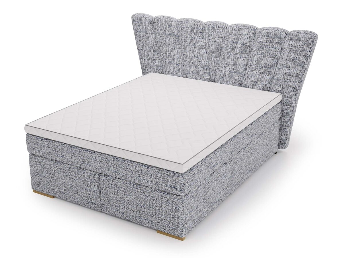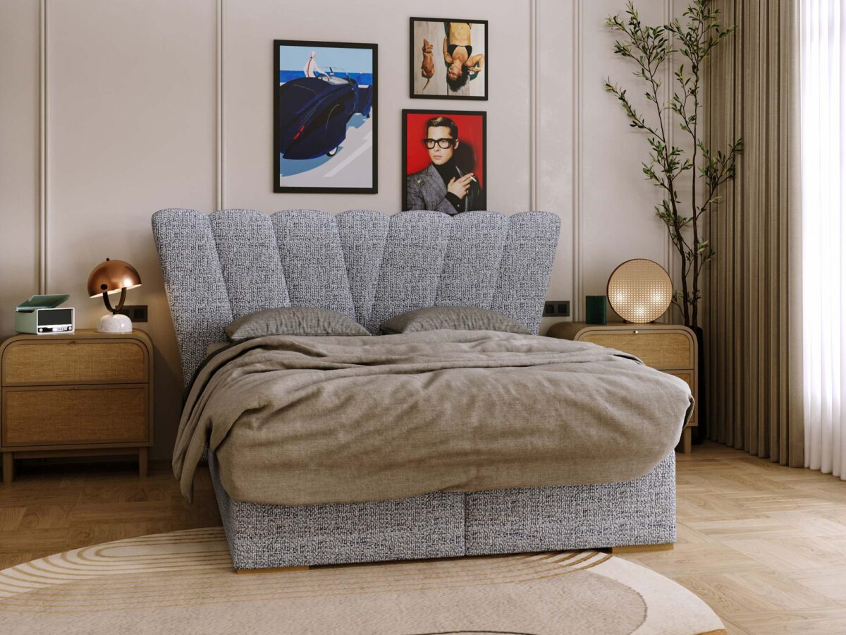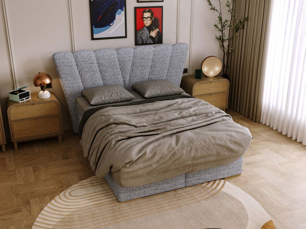 Łóżko szare kontynentalne wachlarzowe z materacem pikowanym