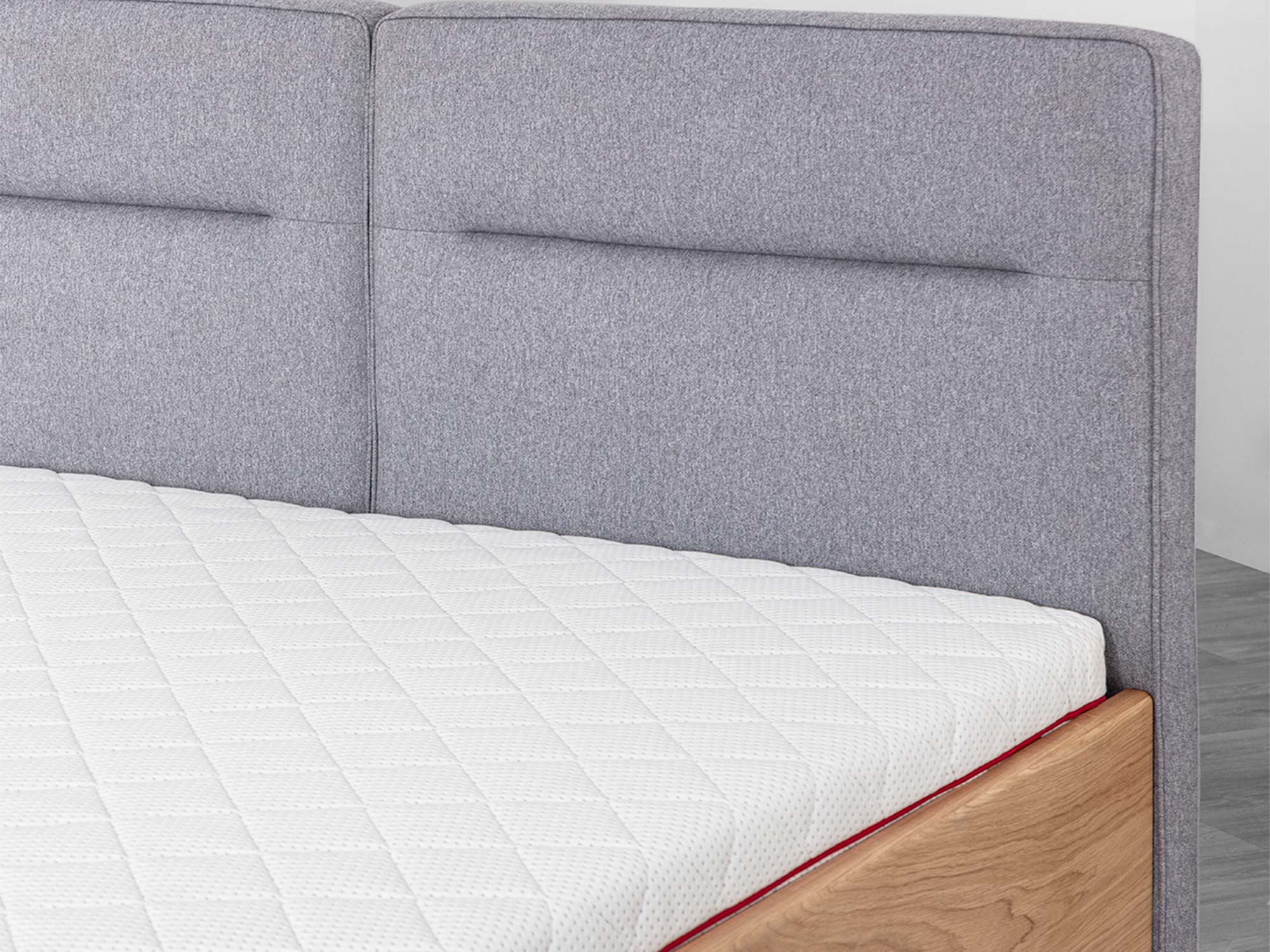 Tapicerowany zagłówek – oryginalna forma i wygoda. Jasnoszary melanż, elegancki grafit lub inny wybrany kolor z próbnika – szeroka paleta umożliwia dopasowanie do zasłon, pościeli czy dywanu. Dwuelementowa kompozycja z ozdobnym przeszyciem subtelnie porządkuje kompozycję i zapewnia miękkie, sprężyste oparcie do czytania i pracy z laptopem.