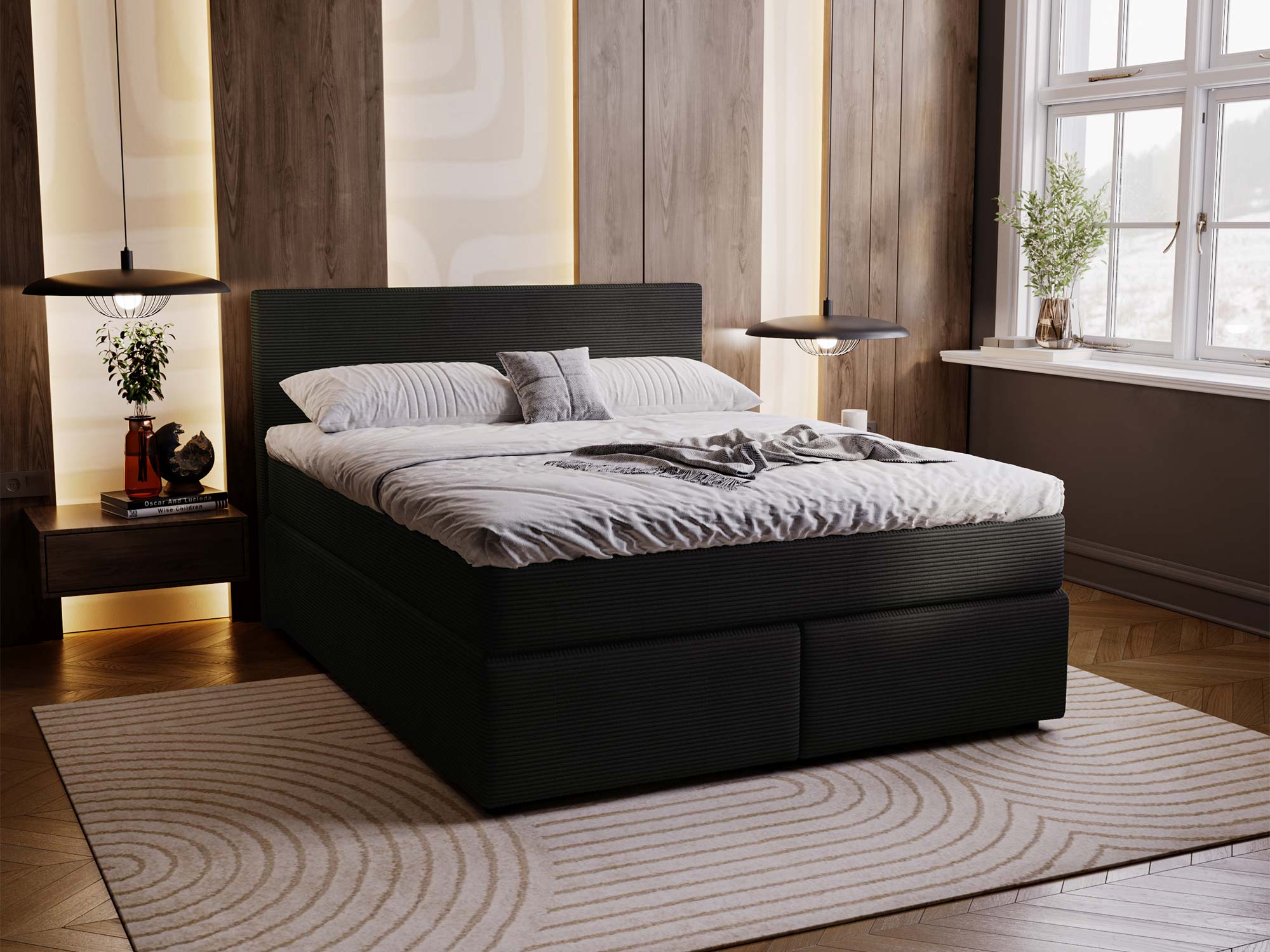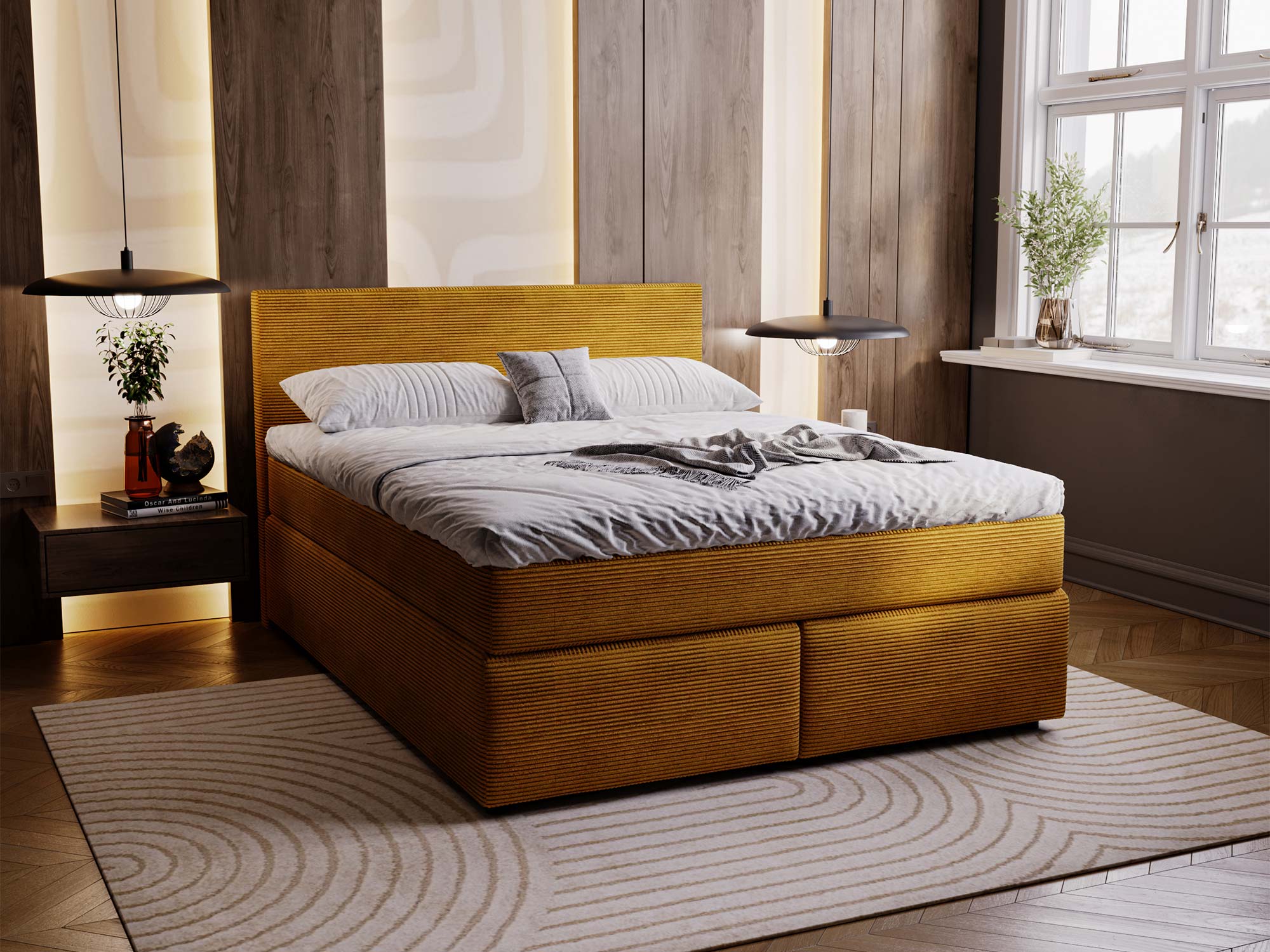 Łóżko AVIST wyróżnia się eleganckim, prostokątnym zagłówkiem, który dodaje sypialni klasy i stylu. Jego prosta forma doskonale wpisuje się w minimalistyczne wnętrza, ale jednocześnie podkreśla elegancję i wyrafinowanie pomieszczenia. Stonowana kolorystyka tapicerki sprawia, że łóżko AVIST staje się centralnym punktem sypialni, nadając jej subtelny urok i spokój.