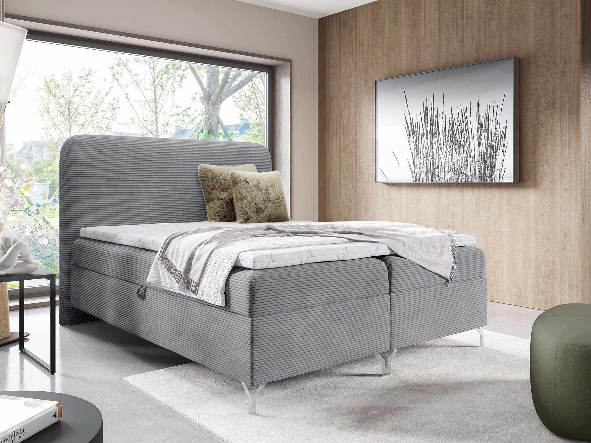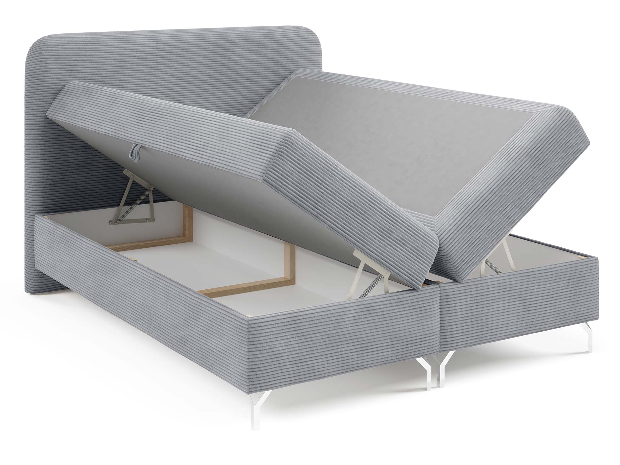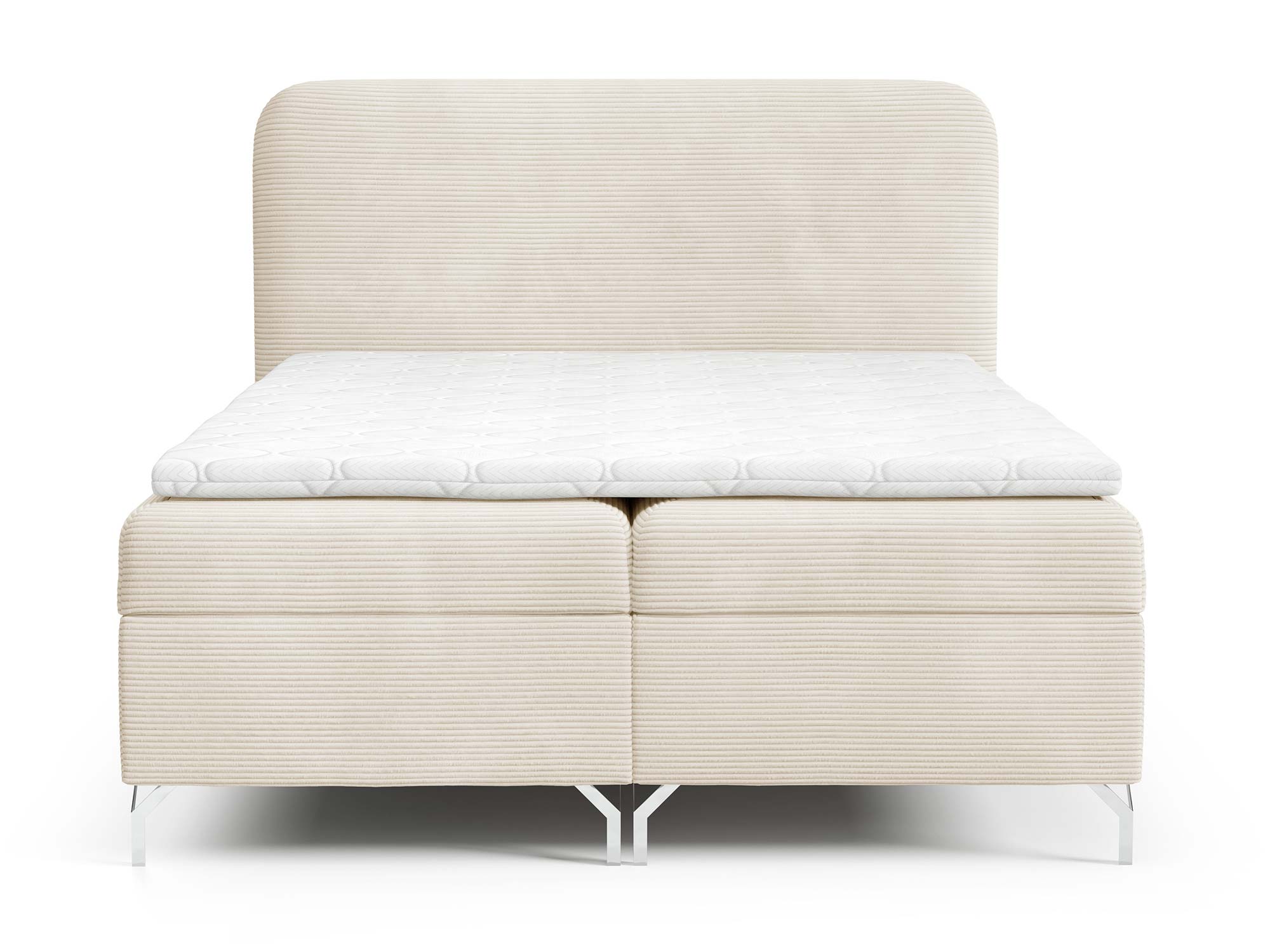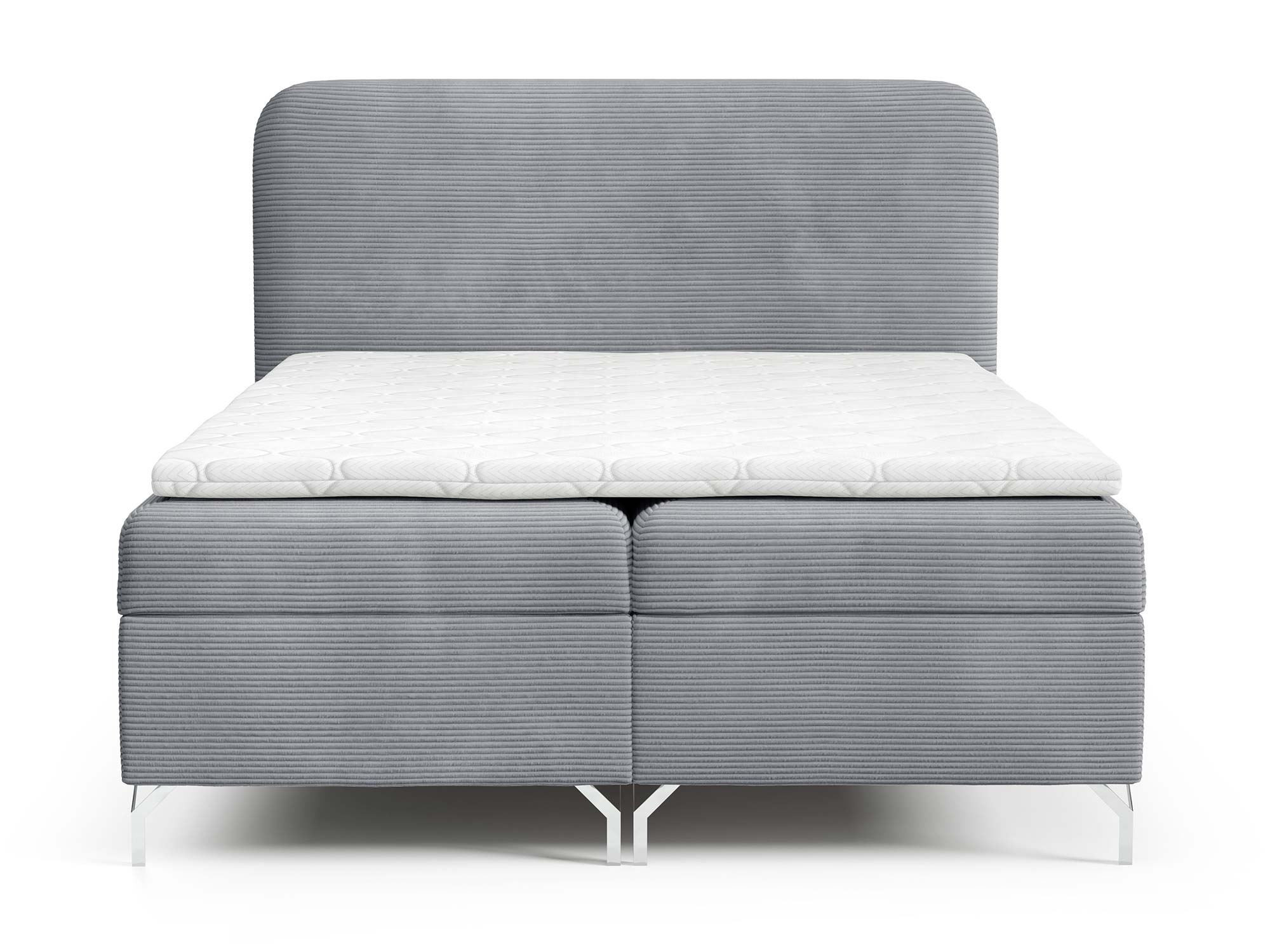 Nowoczesnego charakteru dodają srebrne metalowe nóżki, które nie tylko stabilizują konstrukcję, ale również wprowadzają loftowy akcent do całości. Eleganckie przeszycia na zagłowiu i tapicerowanych materacach podkreślają staranność wykonania i dodają łóżku indywidualnego stylu.