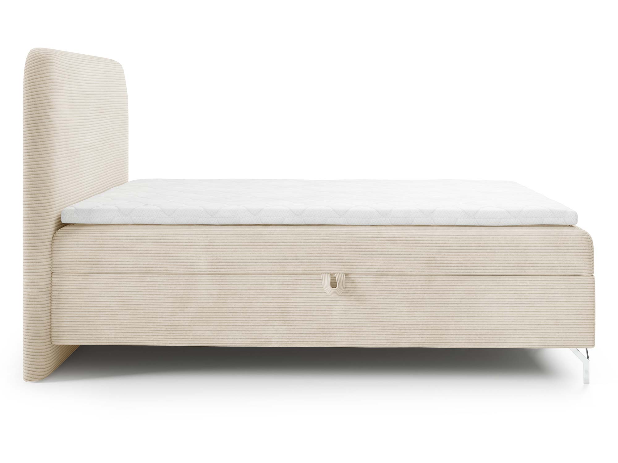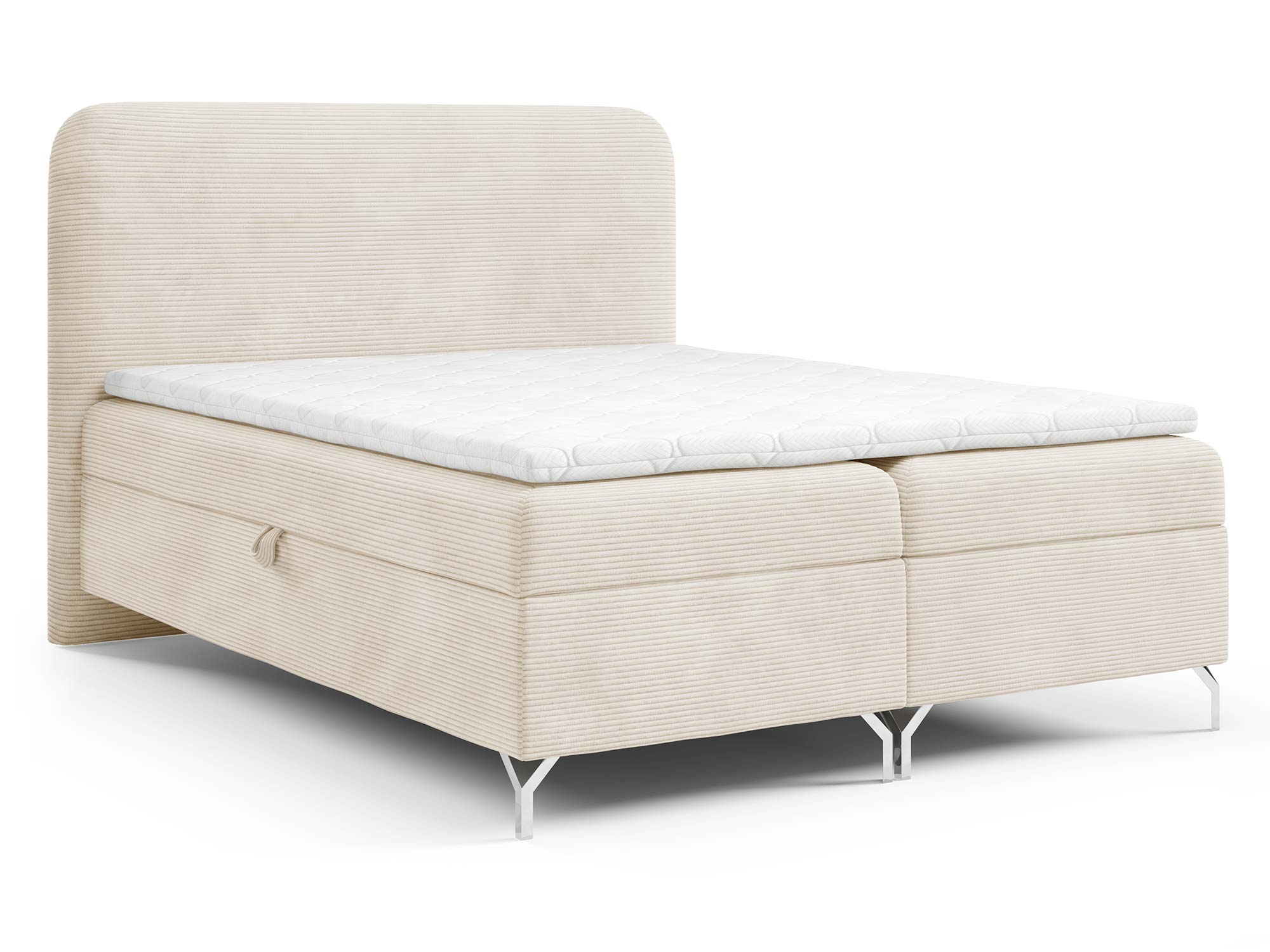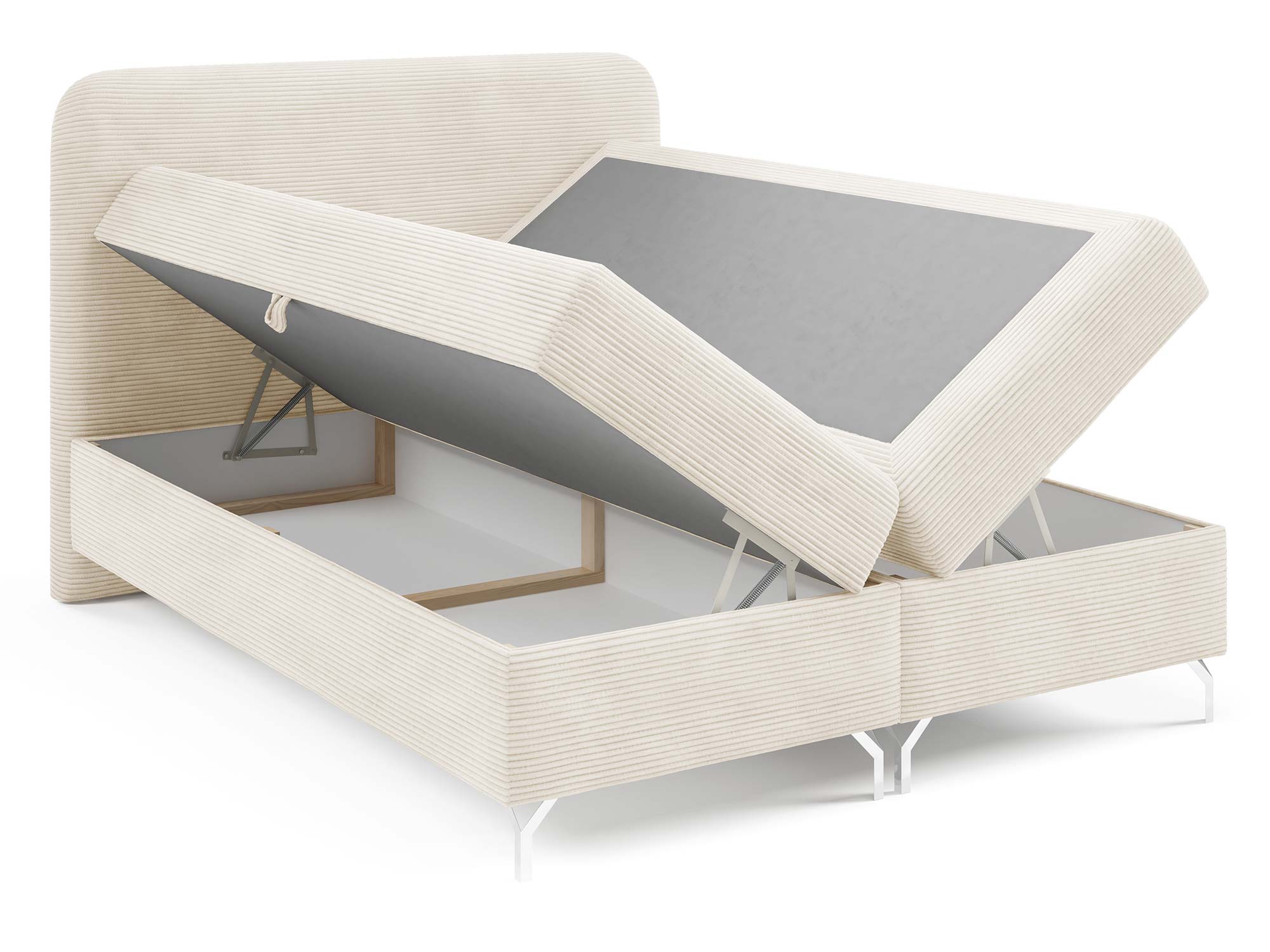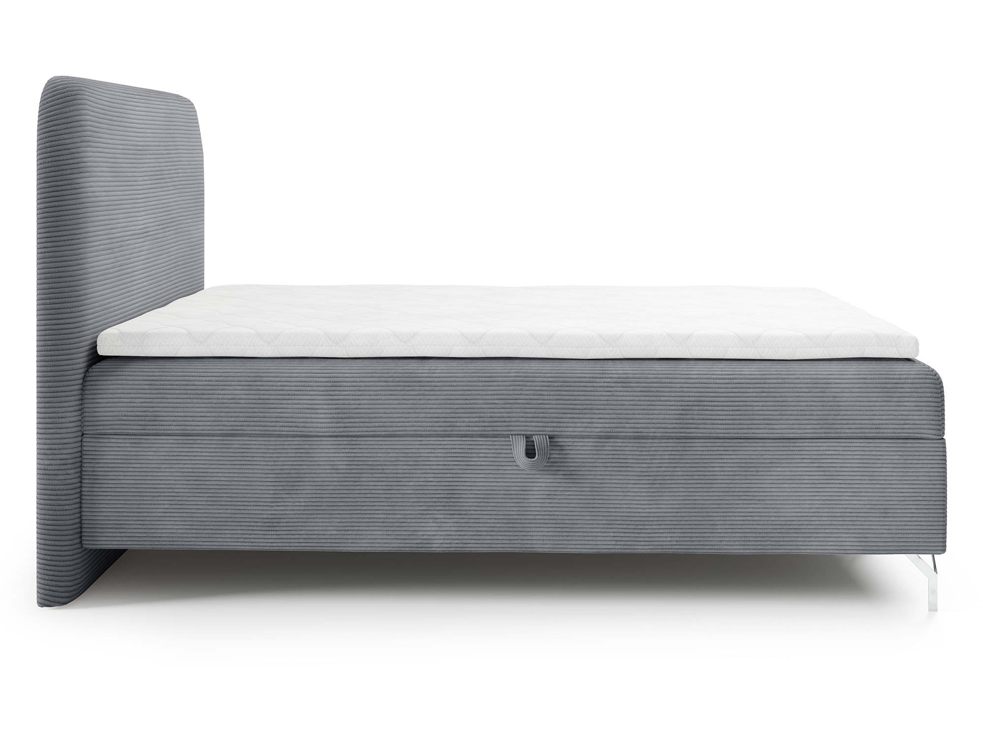 Nowoczesnego charakteru dodają srebrne metalowe nóżki, które nie tylko stabilizują konstrukcję, ale również wprowadzają loftowy akcent do całości. Eleganckie przeszycia na zagłowiu i tapicerowanych materacach podkreślają staranność wykonania i dodają łóżku indywidualnego stylu.