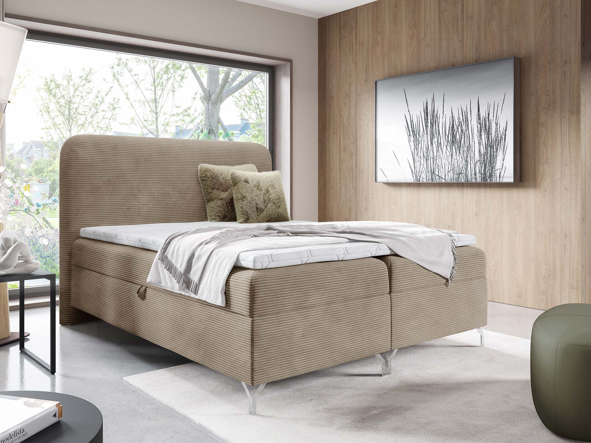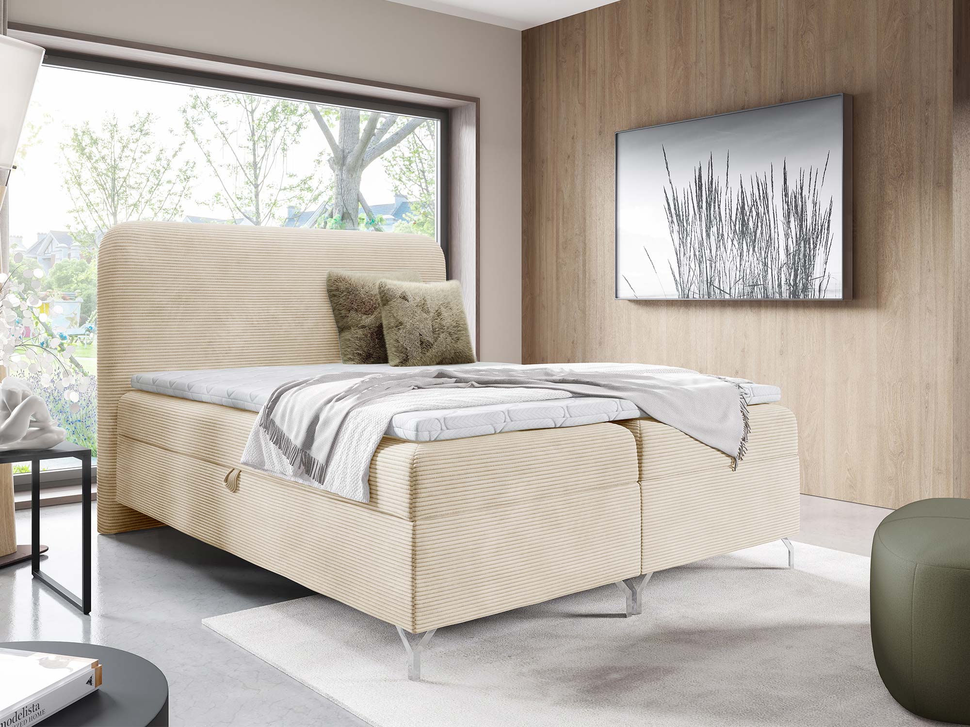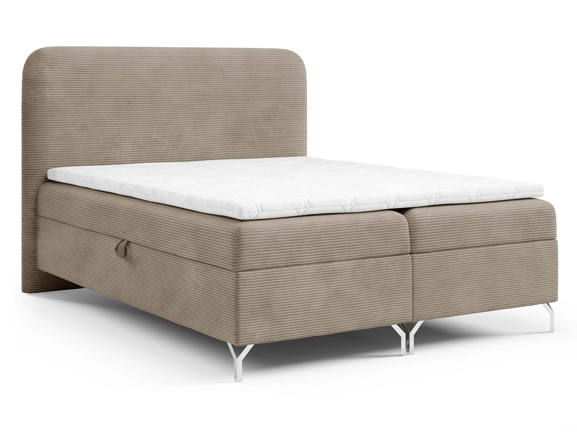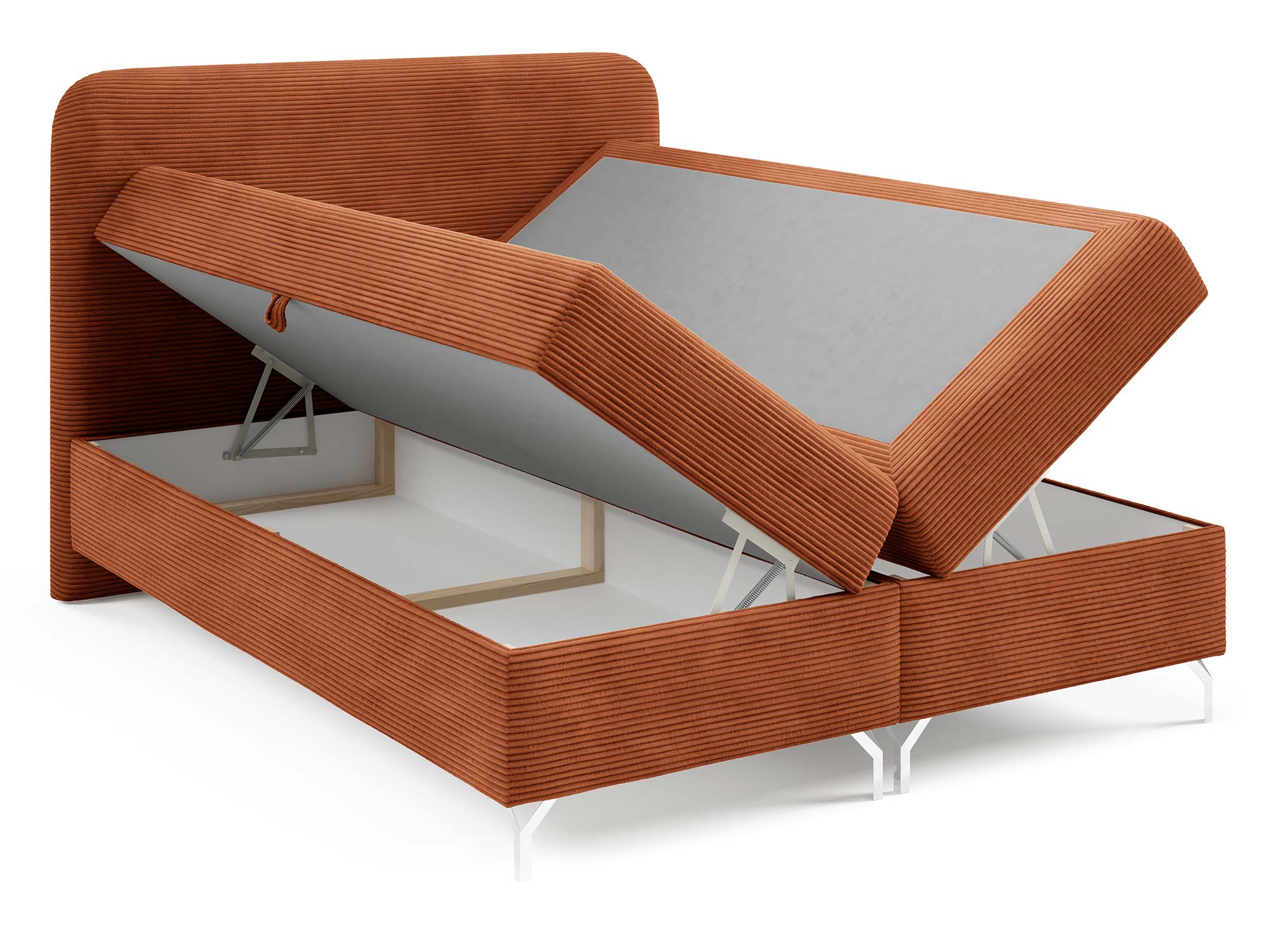 Nowoczesnego charakteru dodają srebrne metalowe nóżki, które nie tylko stabilizują konstrukcję, ale również wprowadzają loftowy akcent do całości. Eleganckie przeszycia na zagłowiu i tapicerowanych materacach podkreślają staranność wykonania i dodają łóżku indywidualnego stylu.