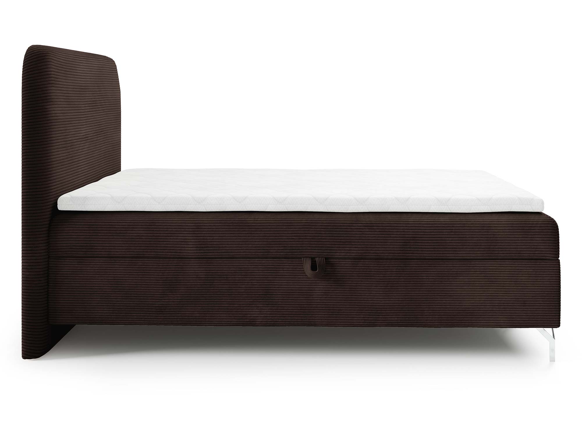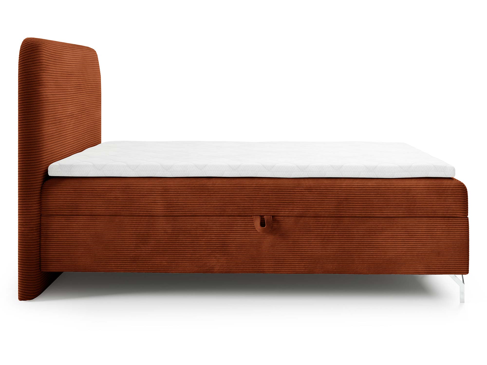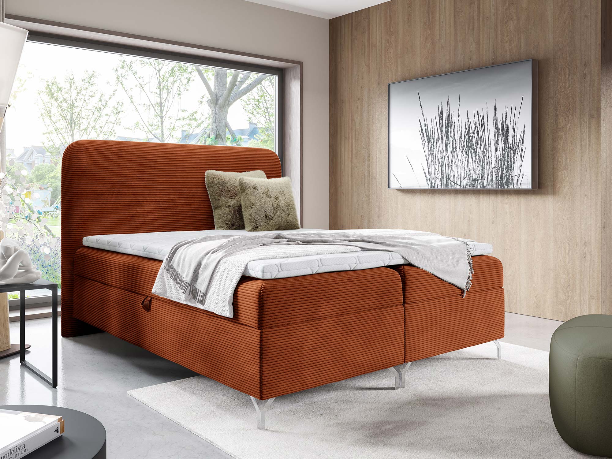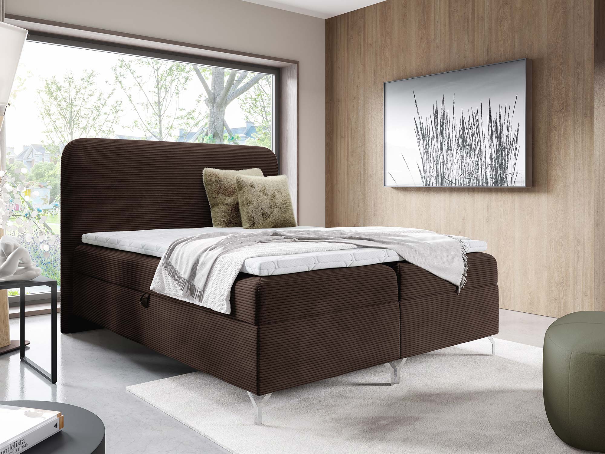 Nowoczesnego charakteru dodają srebrne metalowe nóżki, które nie tylko stabilizują konstrukcję, ale również wprowadzają loftowy akcent do całości. Eleganckie przeszycia na zagłowiu i tapicerowanych materacach podkreślają staranność wykonania i dodają łóżku indywidualnego stylu.