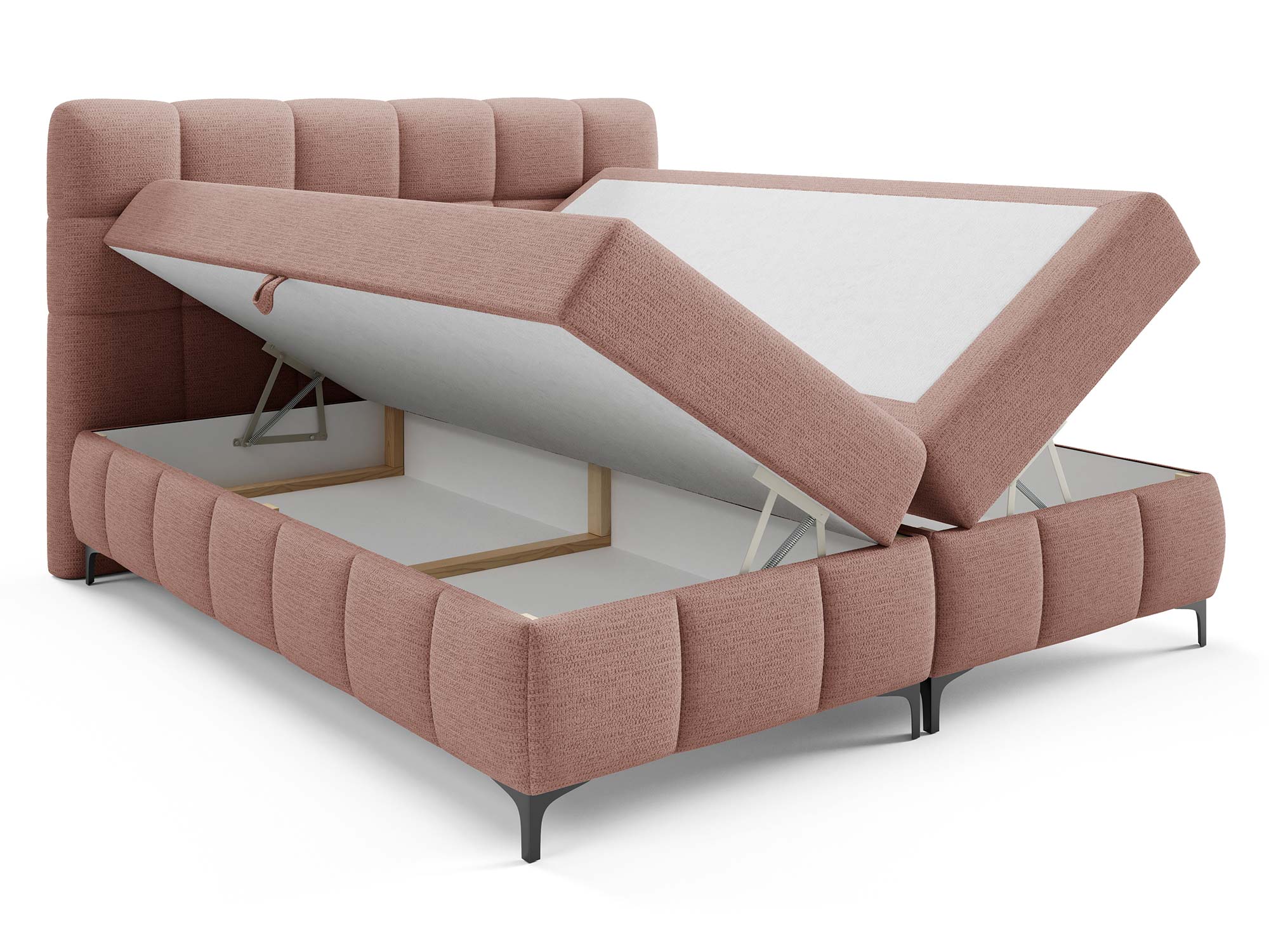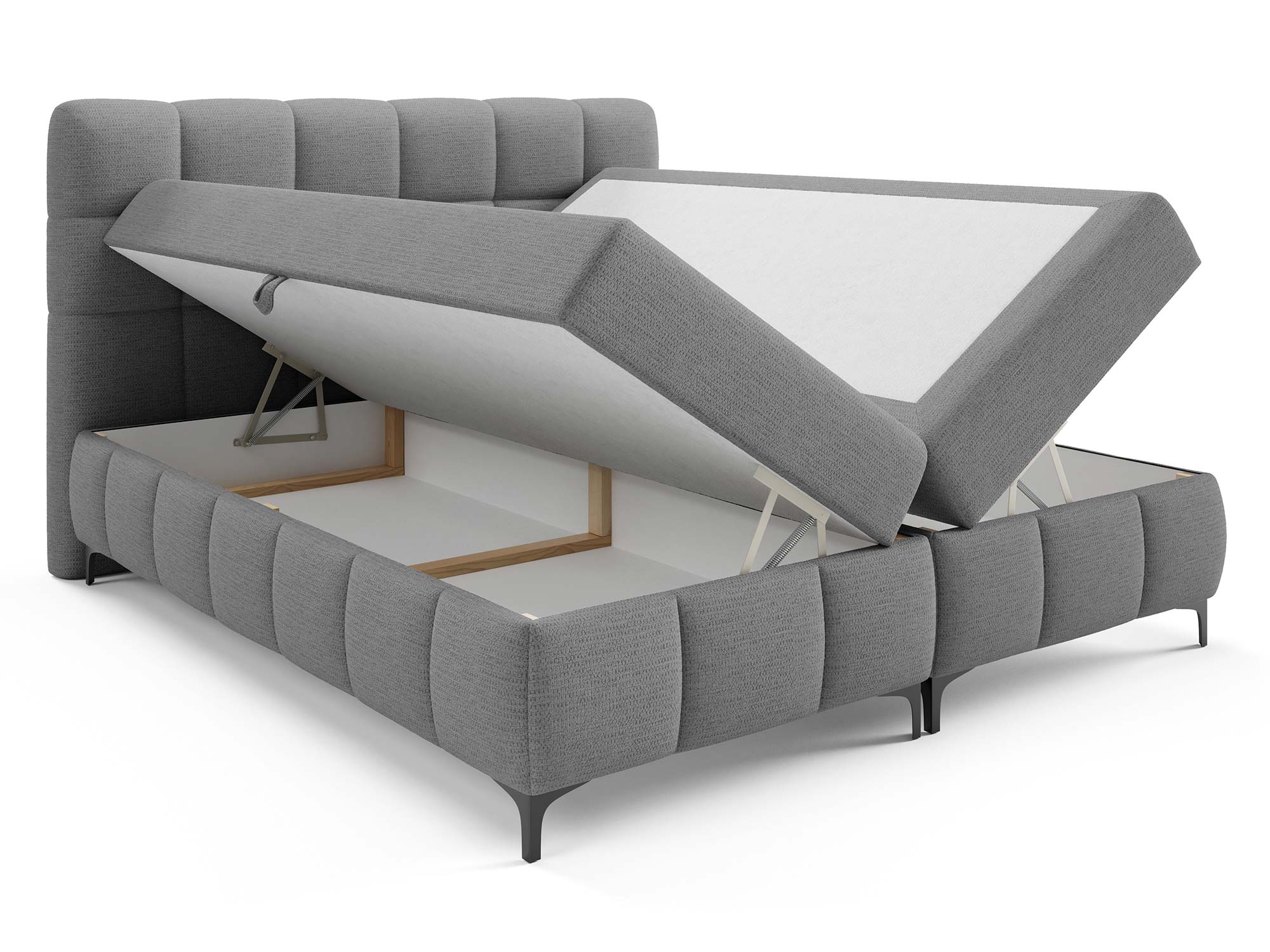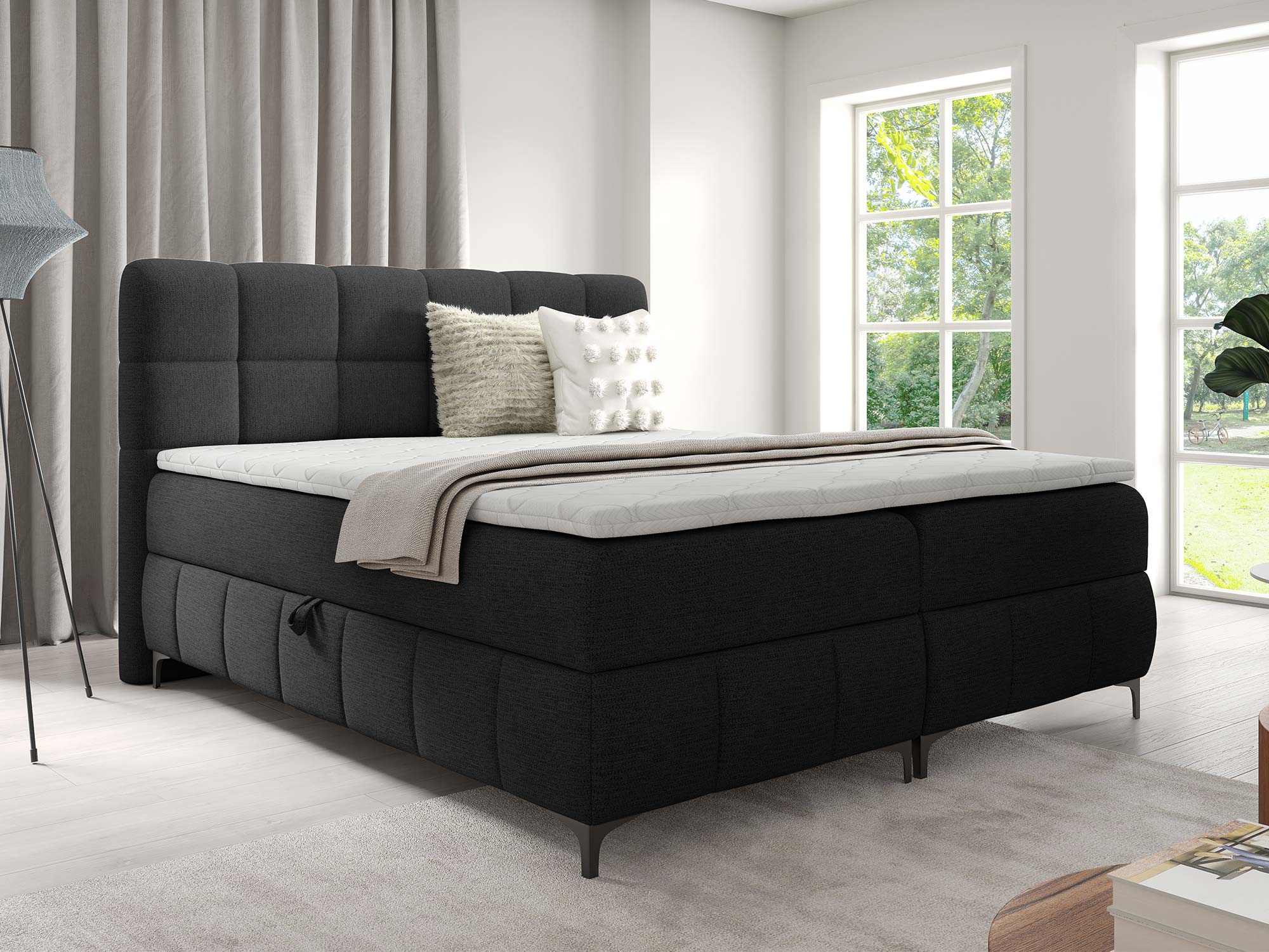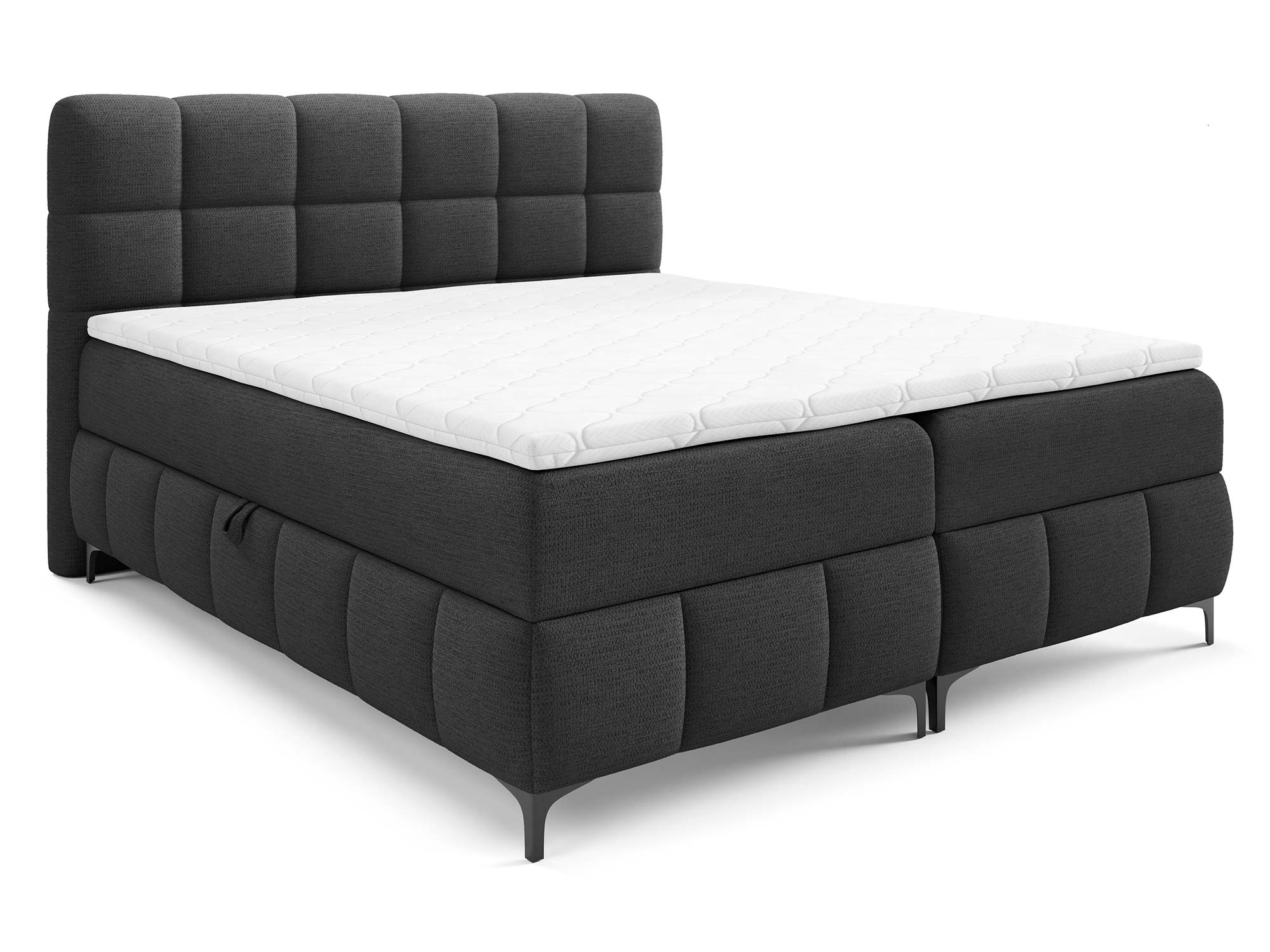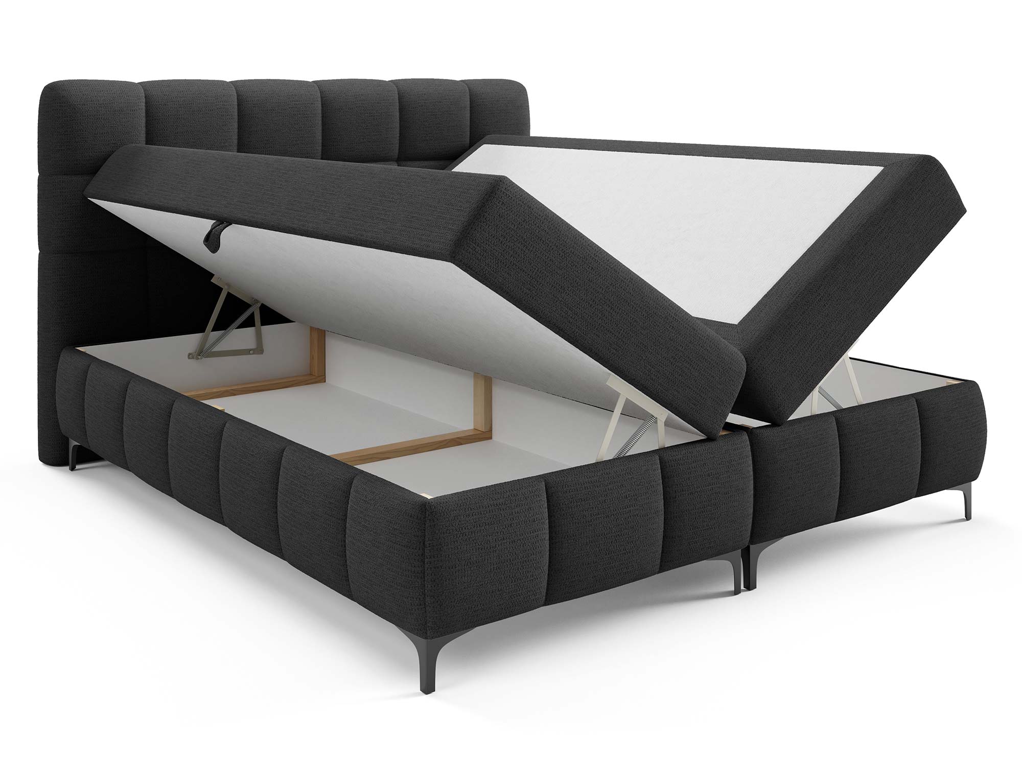 Ozdobne przeszycia na zagłowiu i skrzyniach nadają eleganckiego charakteru, a czarne metalowe nóżki wprowadzają loftowy akcent, który doskonale wpisuje się we współczesne aranżacje wnętrz. To łóżko jest stworzone dla osób, które cenią wygodę, funkcjonalność i design na najwyższym poziomie.