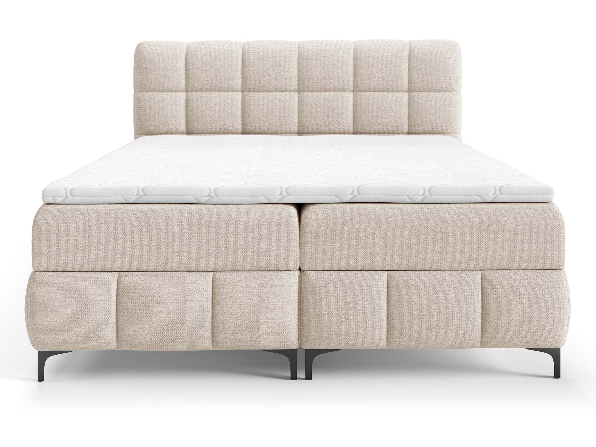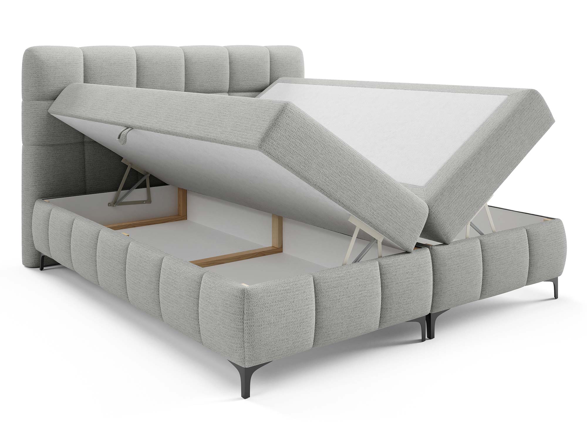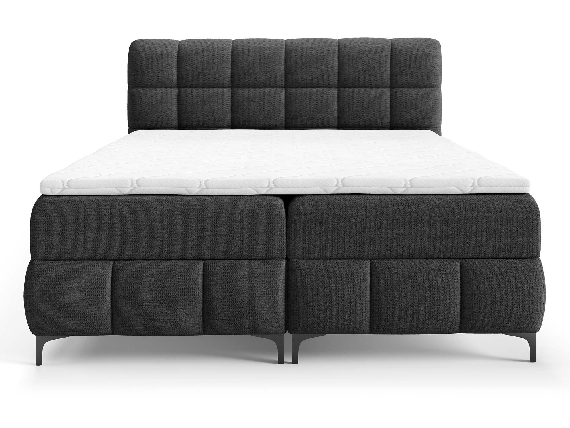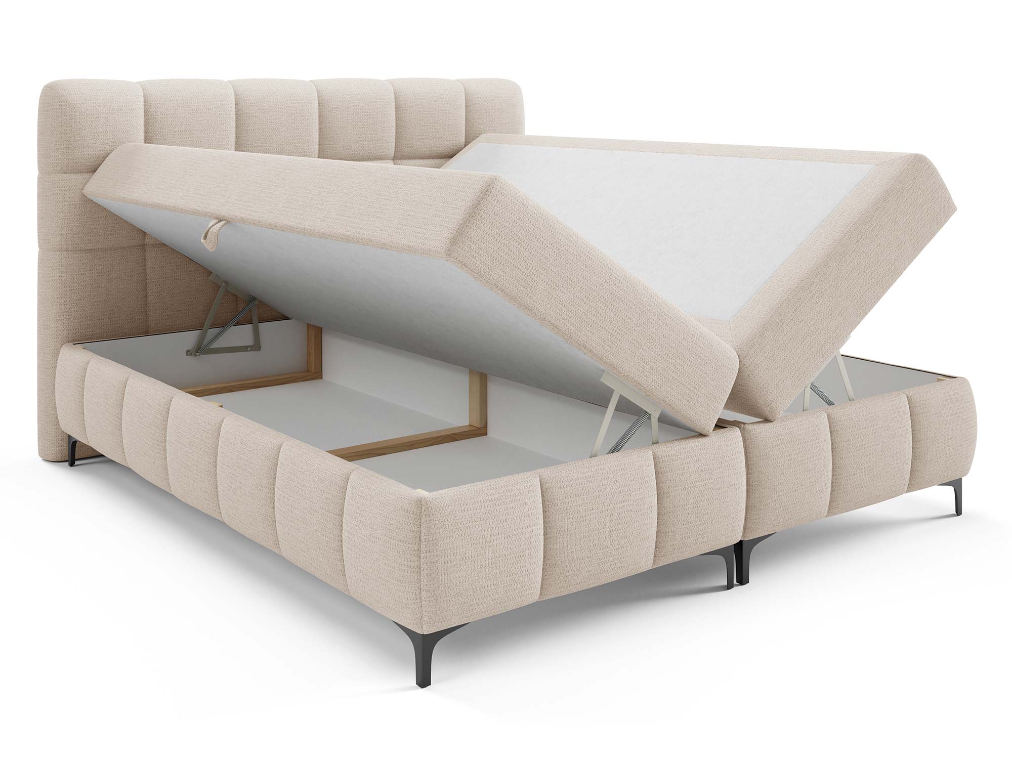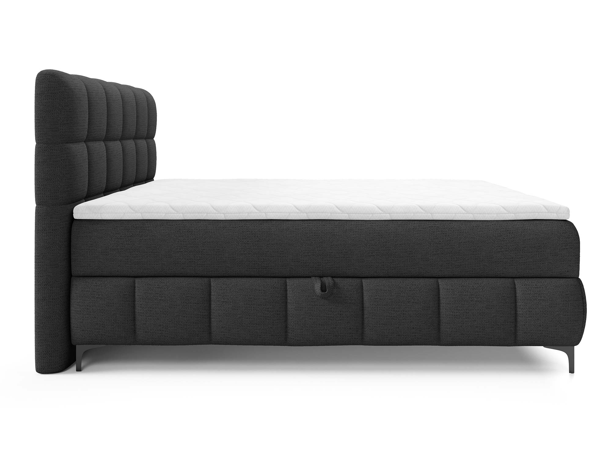 Ozdobne przeszycia na zagłowiu i skrzyniach nadają eleganckiego charakteru, a czarne metalowe nóżki wprowadzają loftowy akcent, który doskonale wpisuje się we współczesne aranżacje wnętrz. To łóżko jest stworzone dla osób, które cenią wygodę, funkcjonalność i design na najwyższym poziomie.