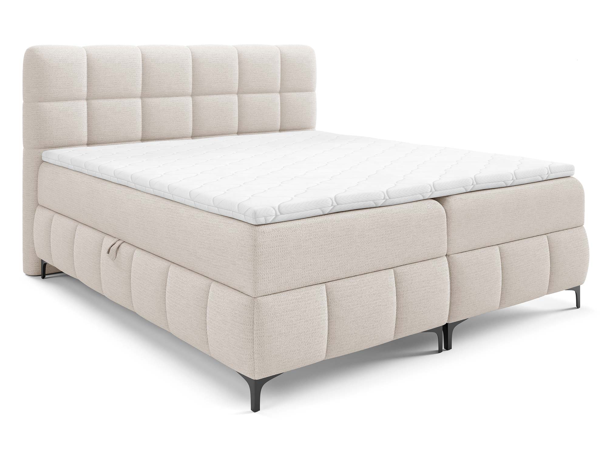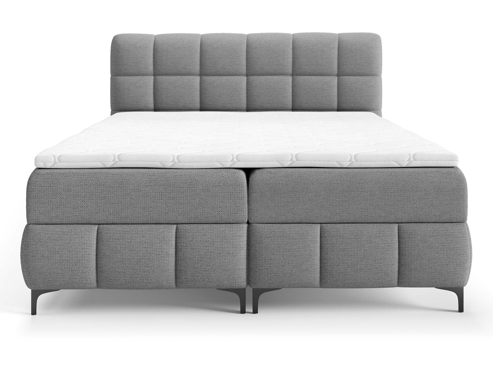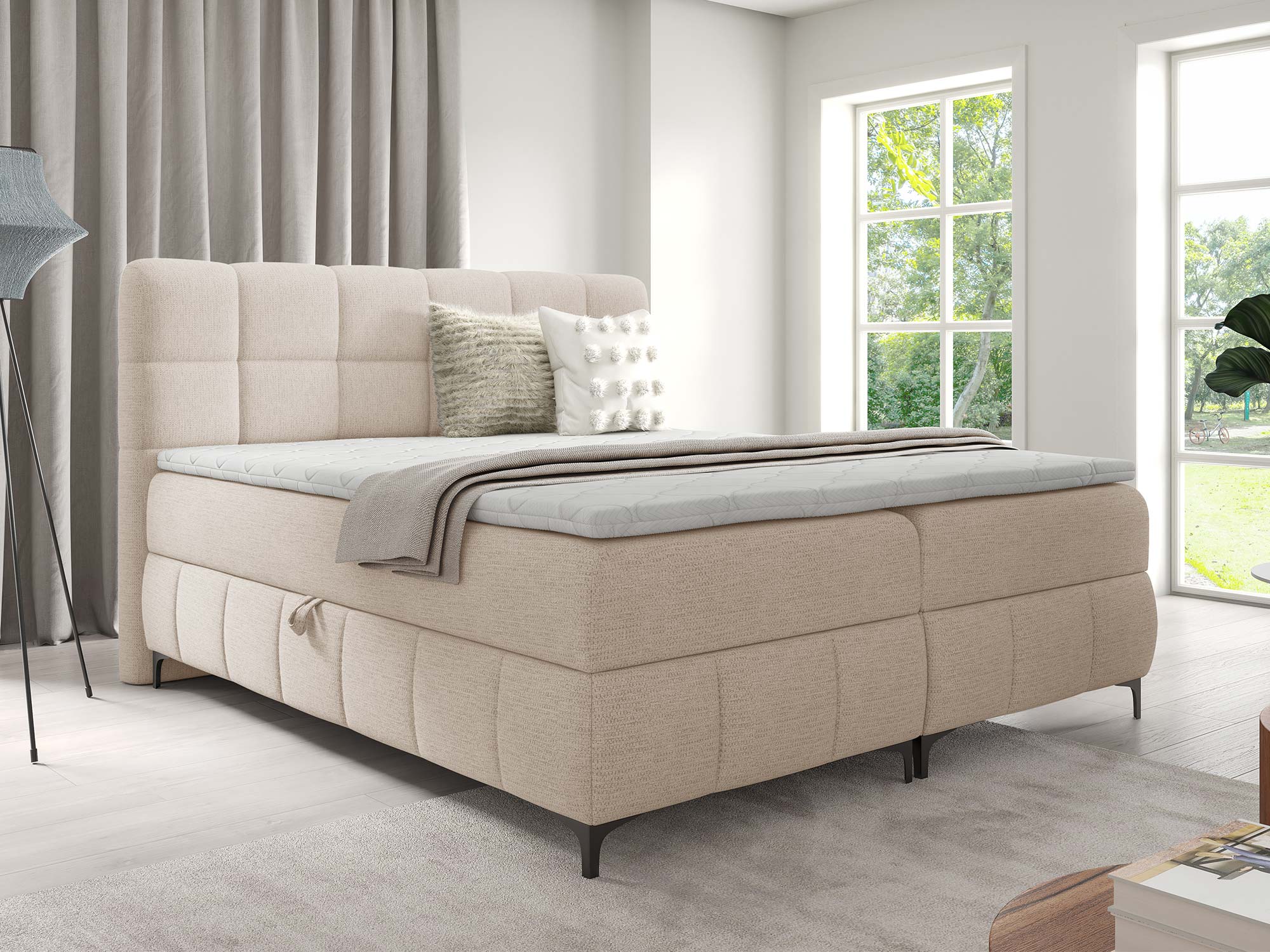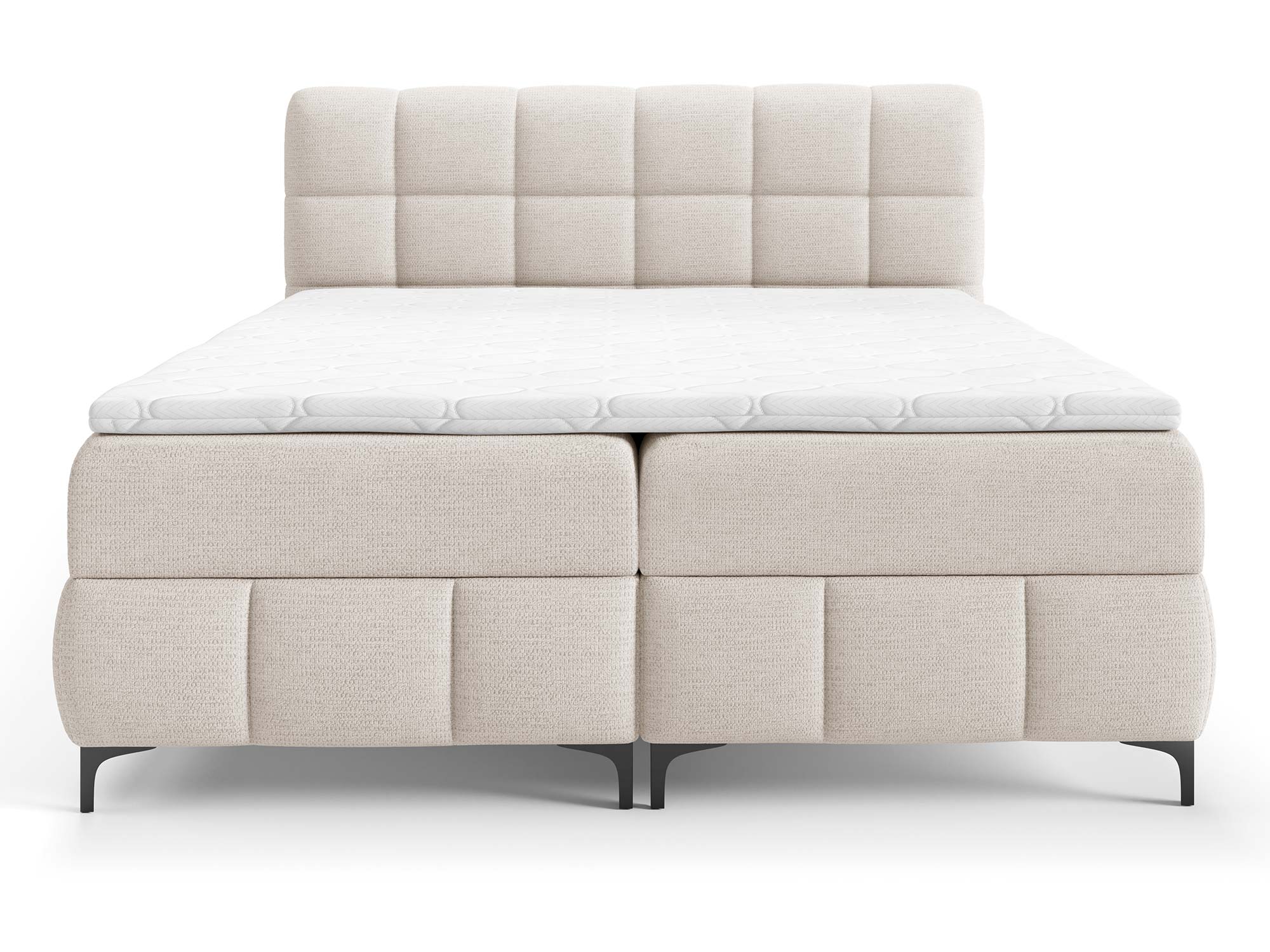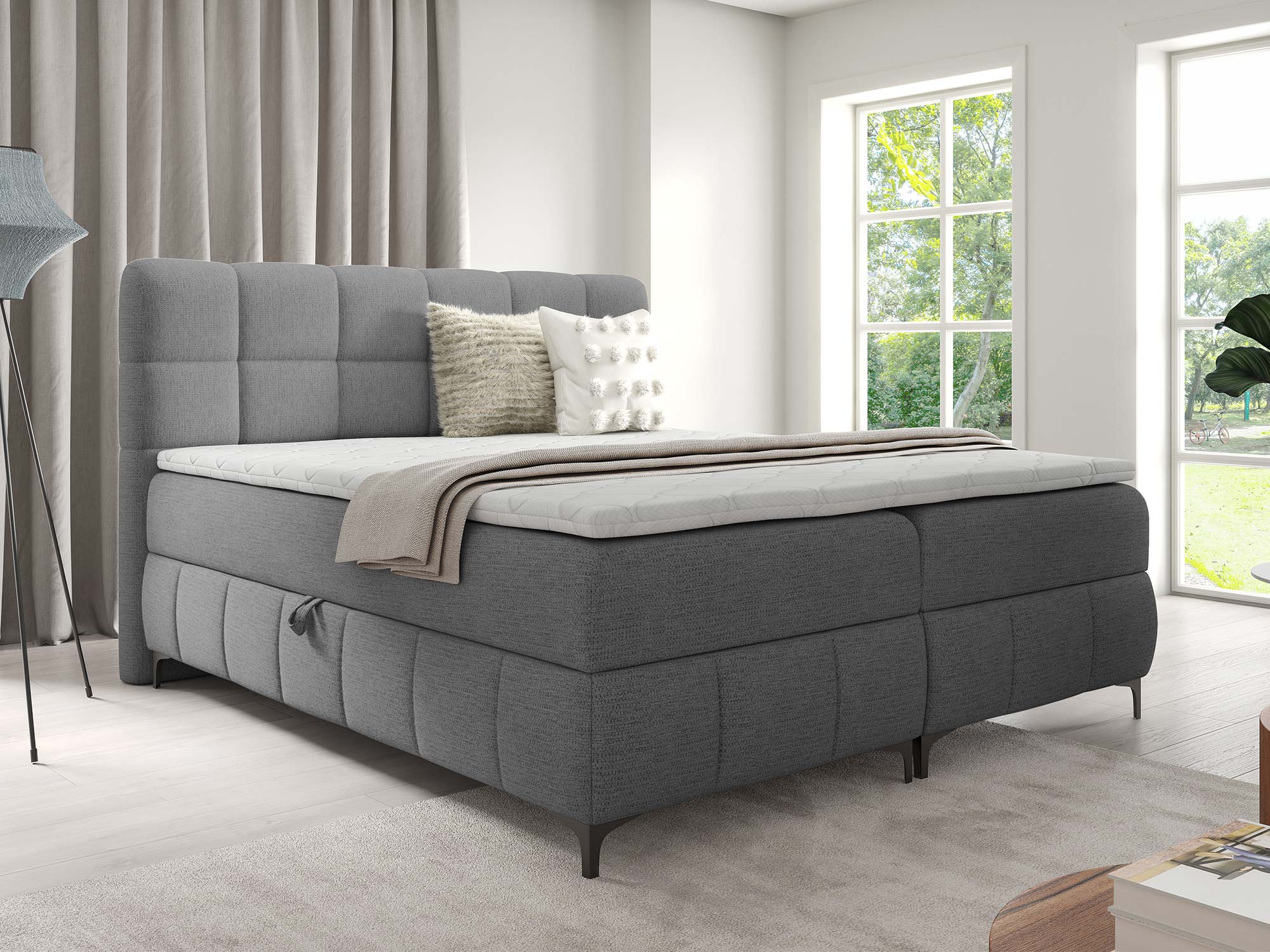 Ozdobne przeszycia na zagłowiu i skrzyniach nadają eleganckiego charakteru, a czarne metalowe nóżki wprowadzają loftowy akcent, który doskonale wpisuje się we współczesne aranżacje wnętrz. To łóżko jest stworzone dla osób, które cenią wygodę, funkcjonalność i design na najwyższym poziomie.