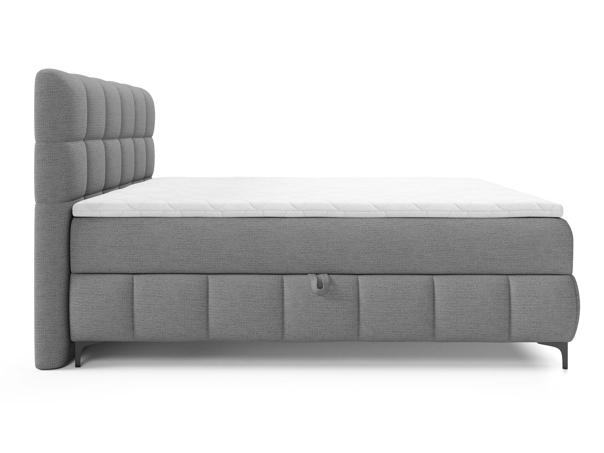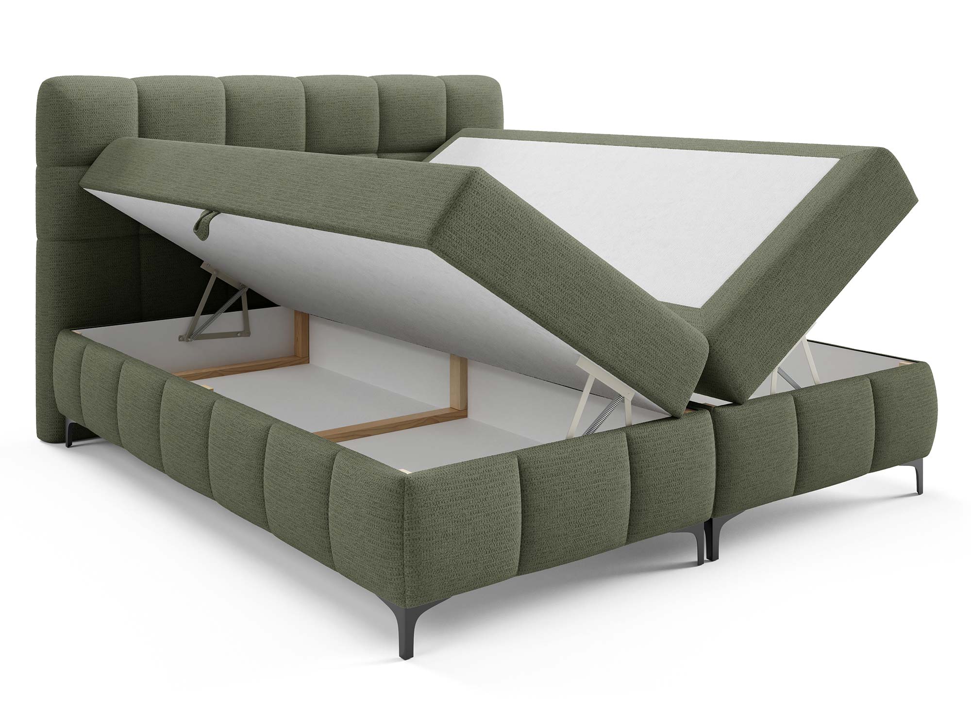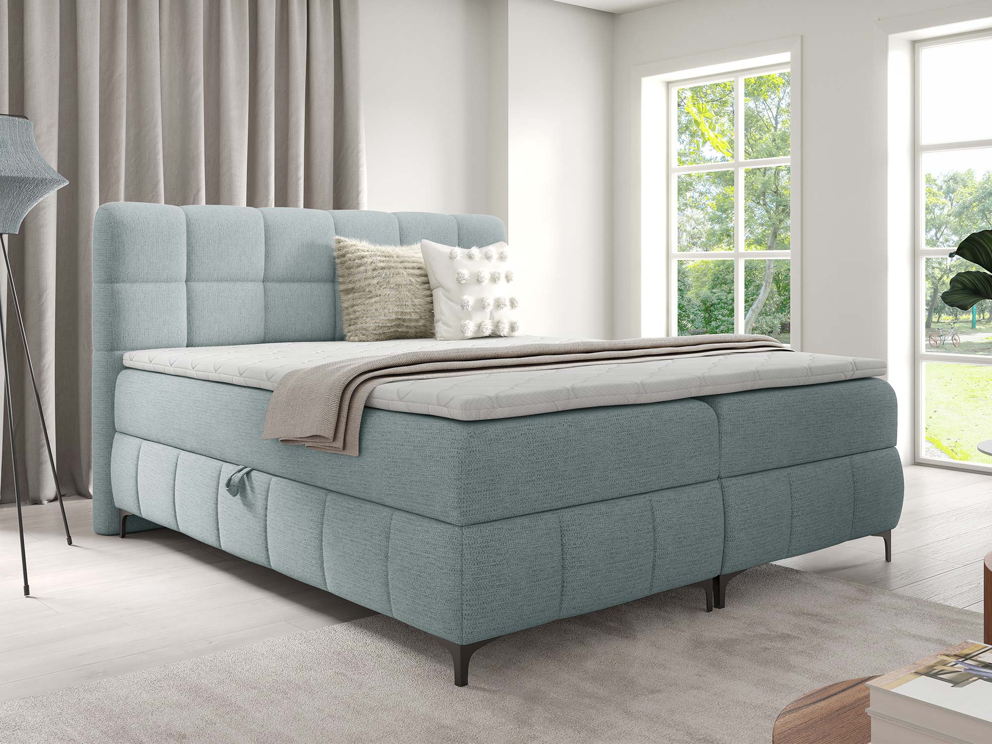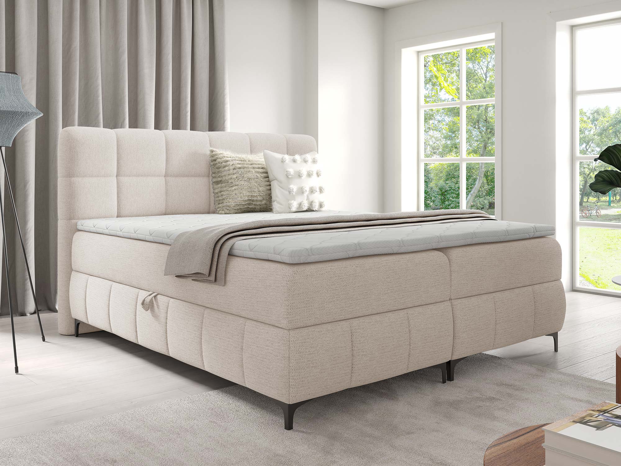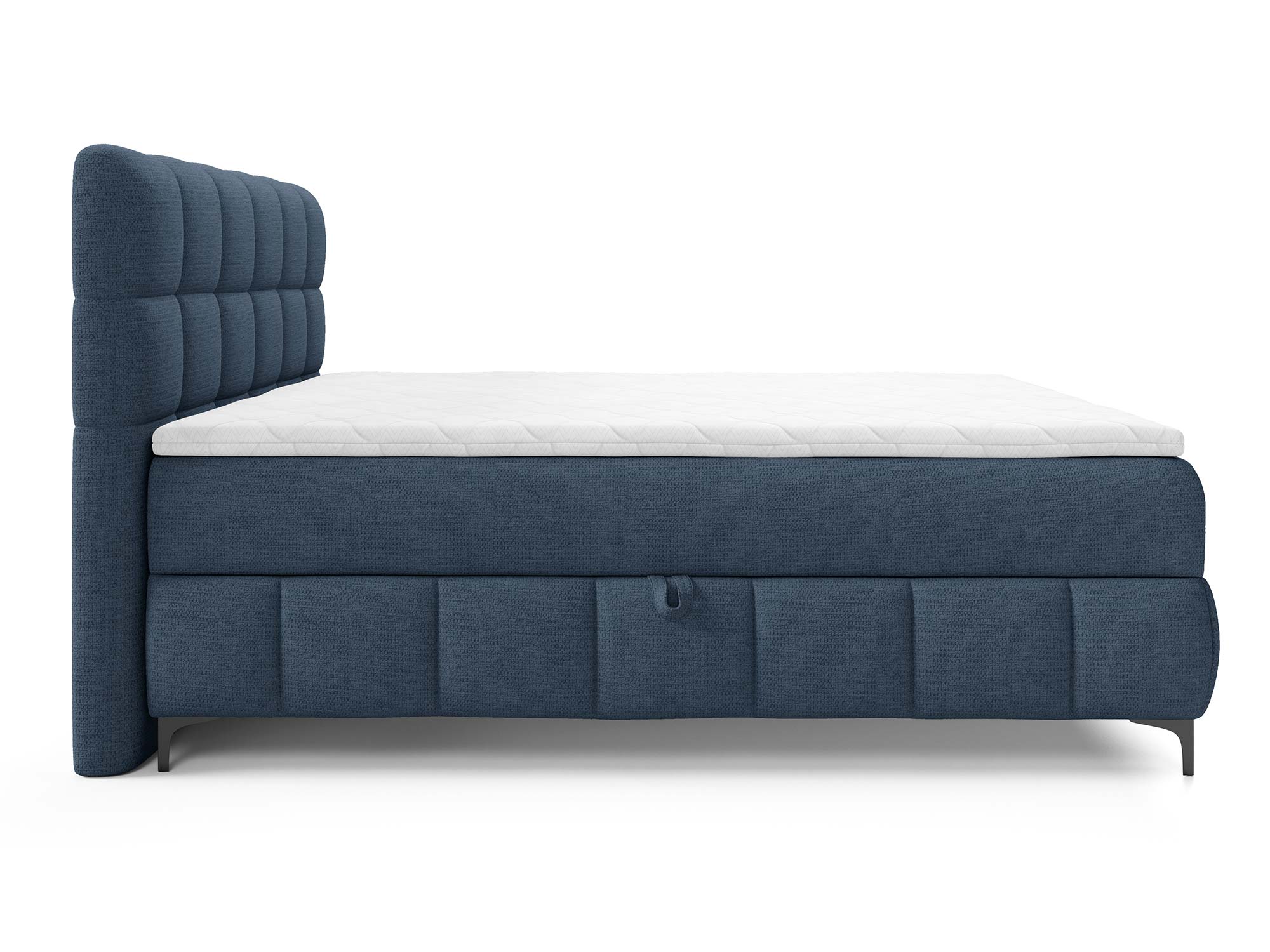 Ozdobne przeszycia na zagłowiu i skrzyniach nadają eleganckiego charakteru, a czarne metalowe nóżki wprowadzają loftowy akcent, który doskonale wpisuje się we współczesne aranżacje wnętrz. To łóżko jest stworzone dla osób, które cenią wygodę, funkcjonalność i design na najwyższym poziomie.