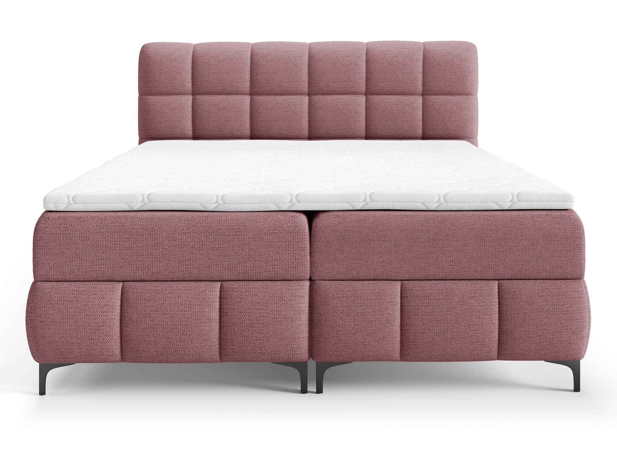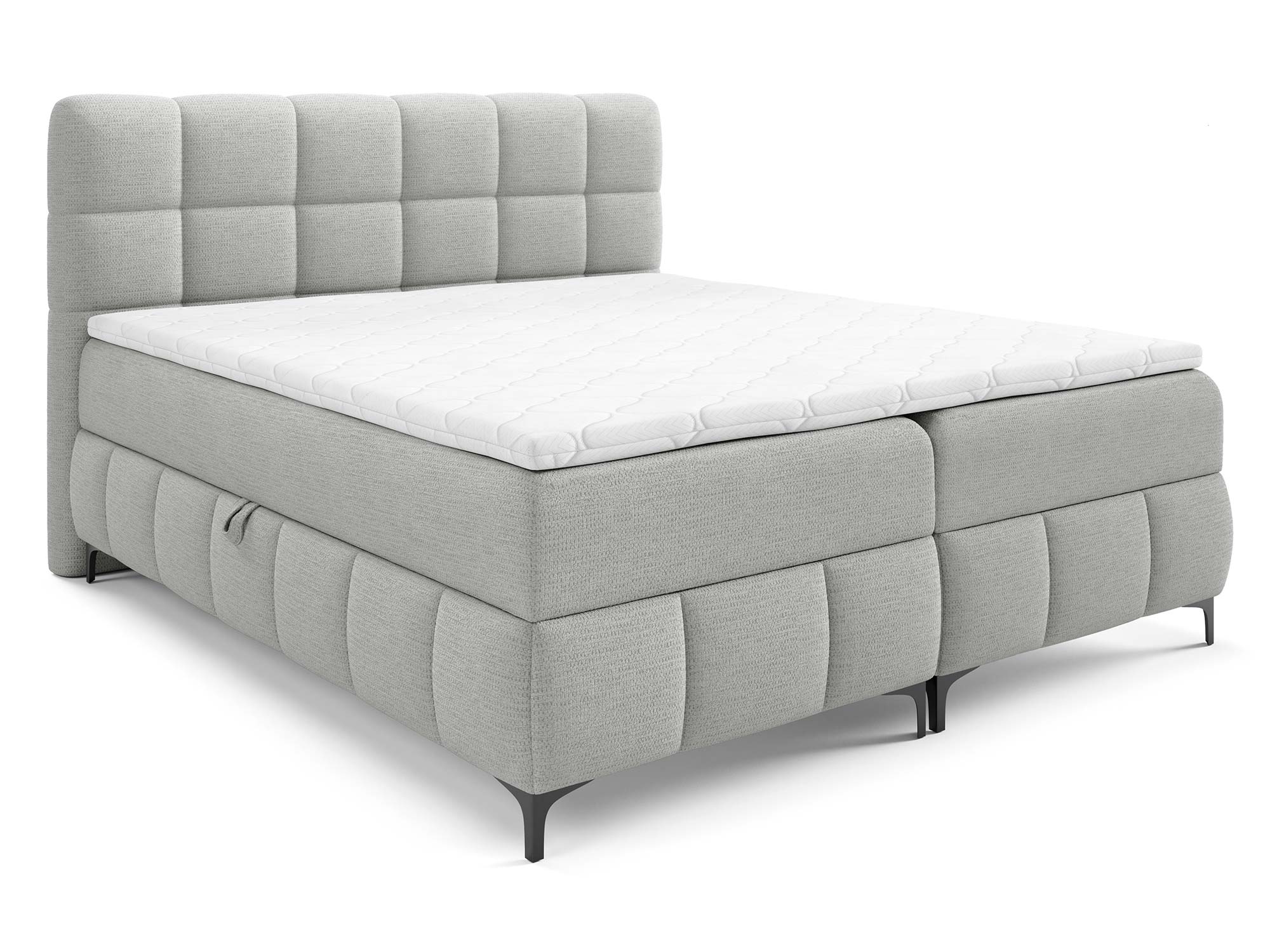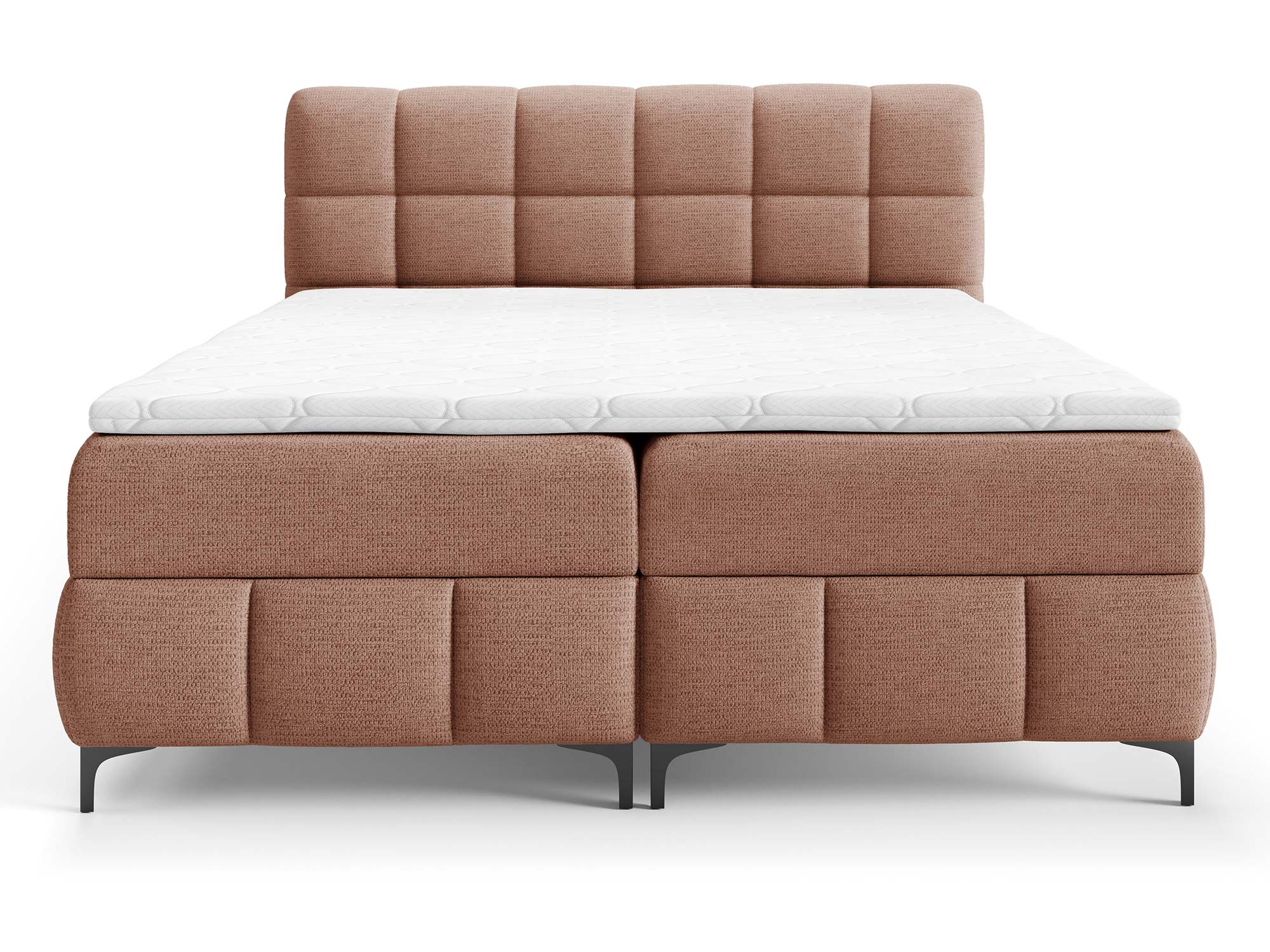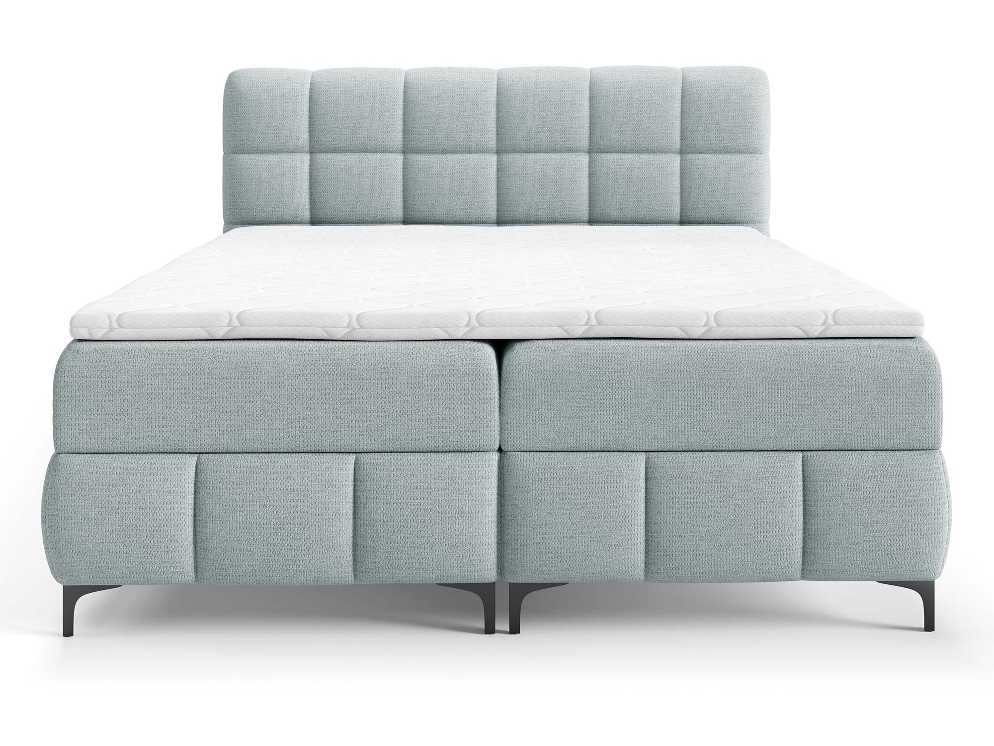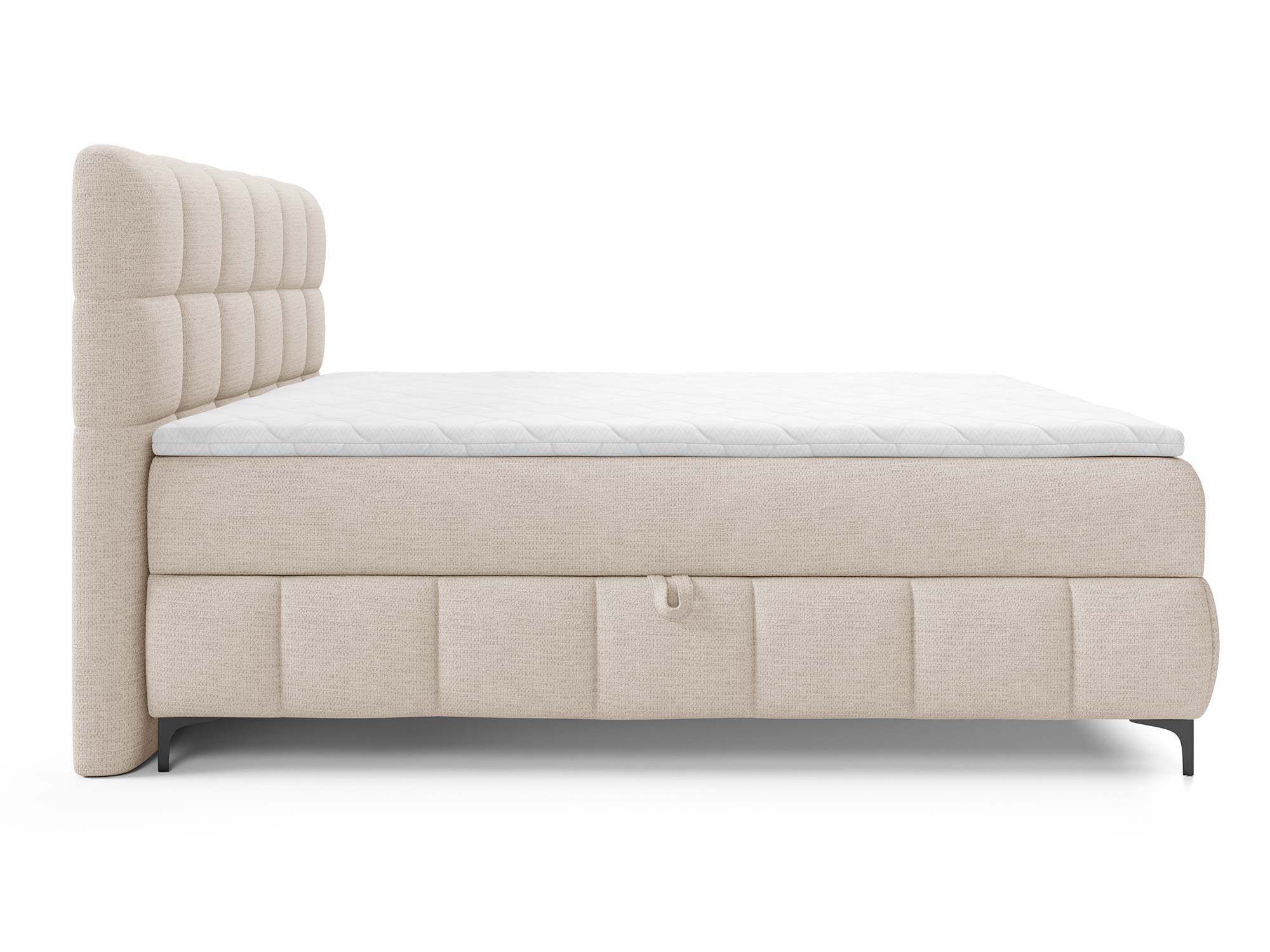 Ozdobne przeszycia na zagłowiu i skrzyniach nadają eleganckiego charakteru, a czarne metalowe nóżki wprowadzają loftowy akcent, który doskonale wpisuje się we współczesne aranżacje wnętrz. To łóżko jest stworzone dla osób, które cenią wygodę, funkcjonalność i design na najwyższym poziomie.