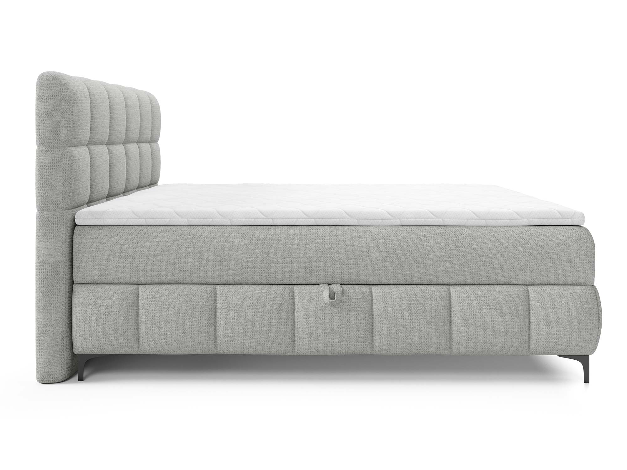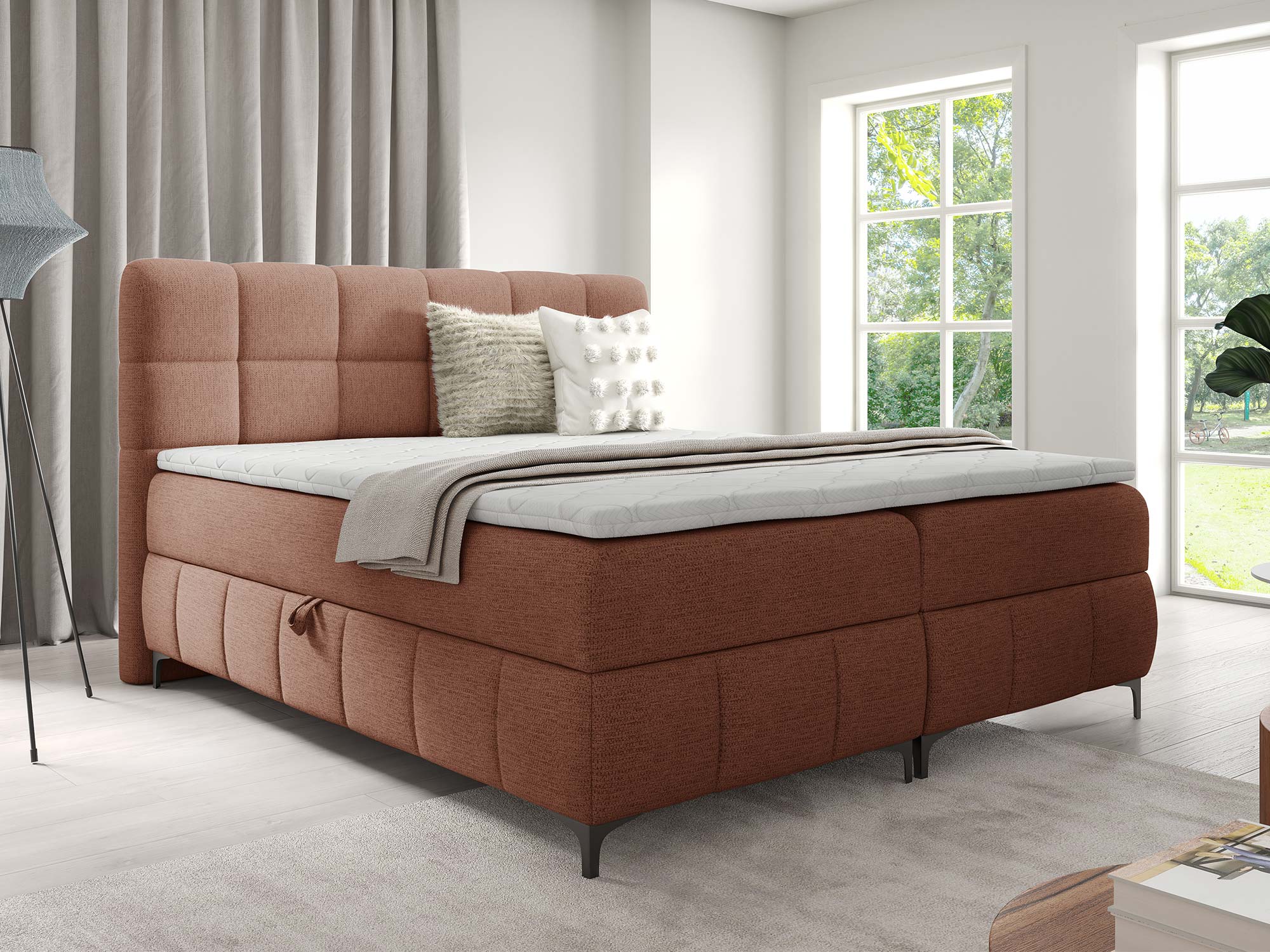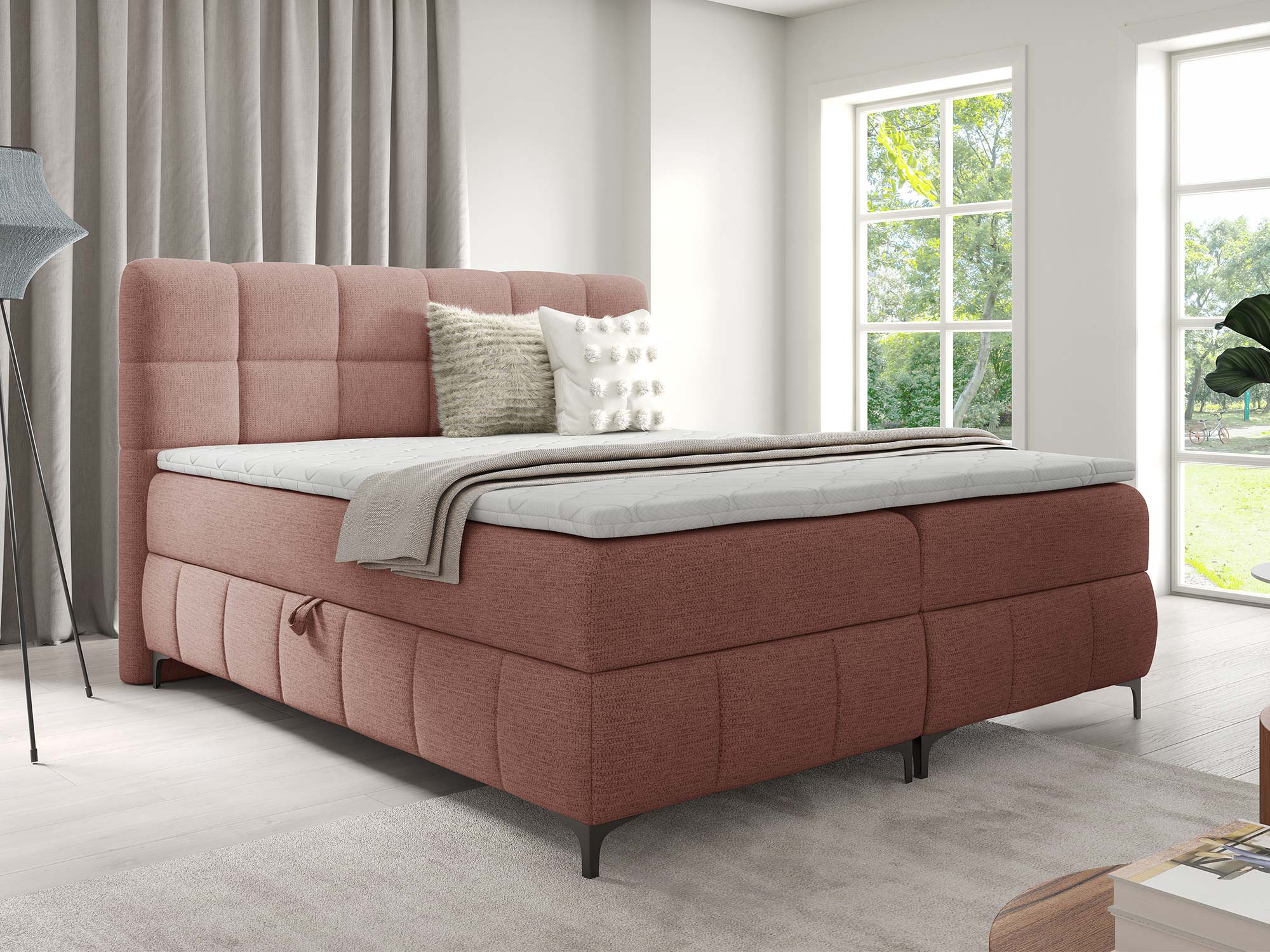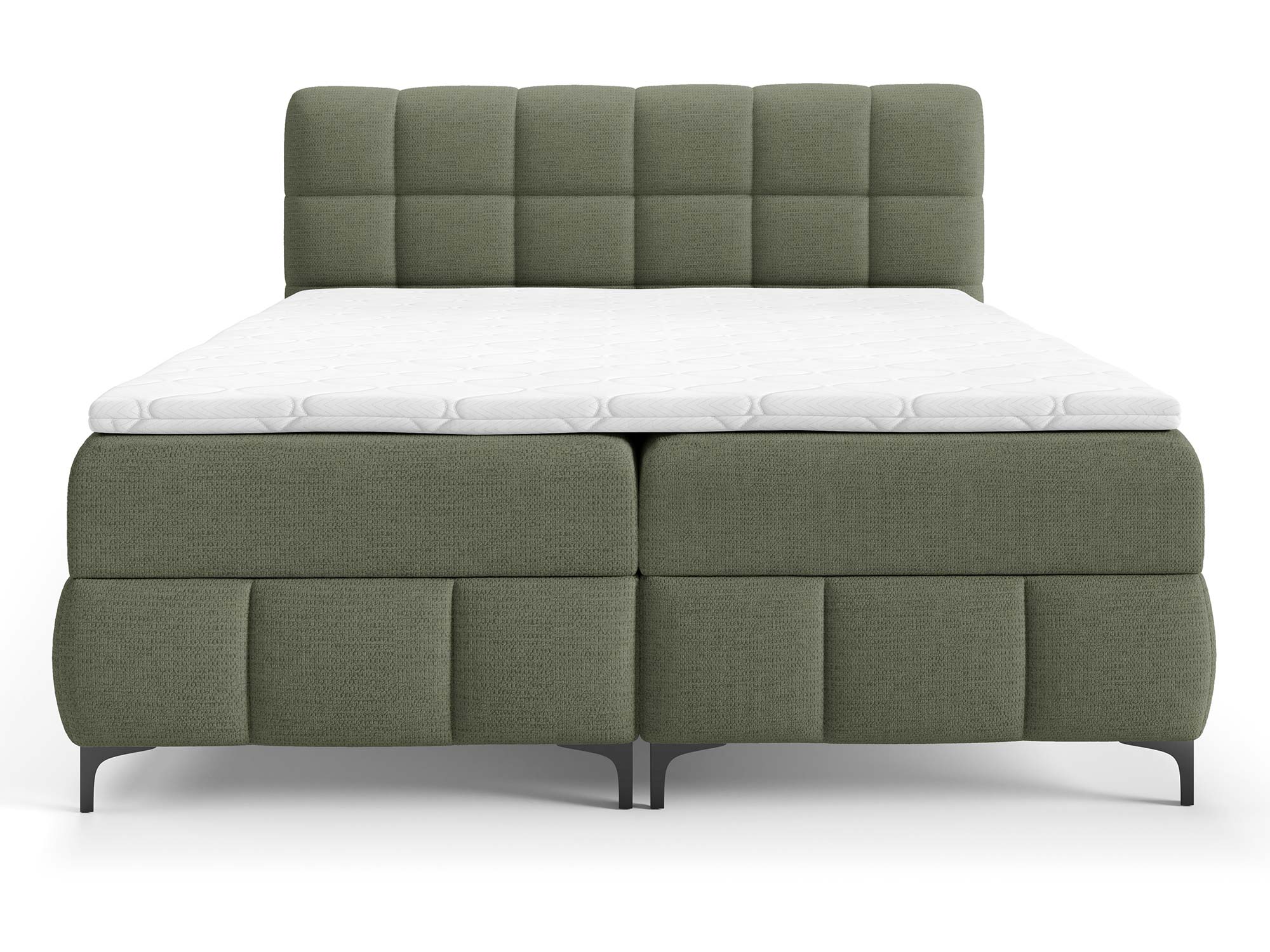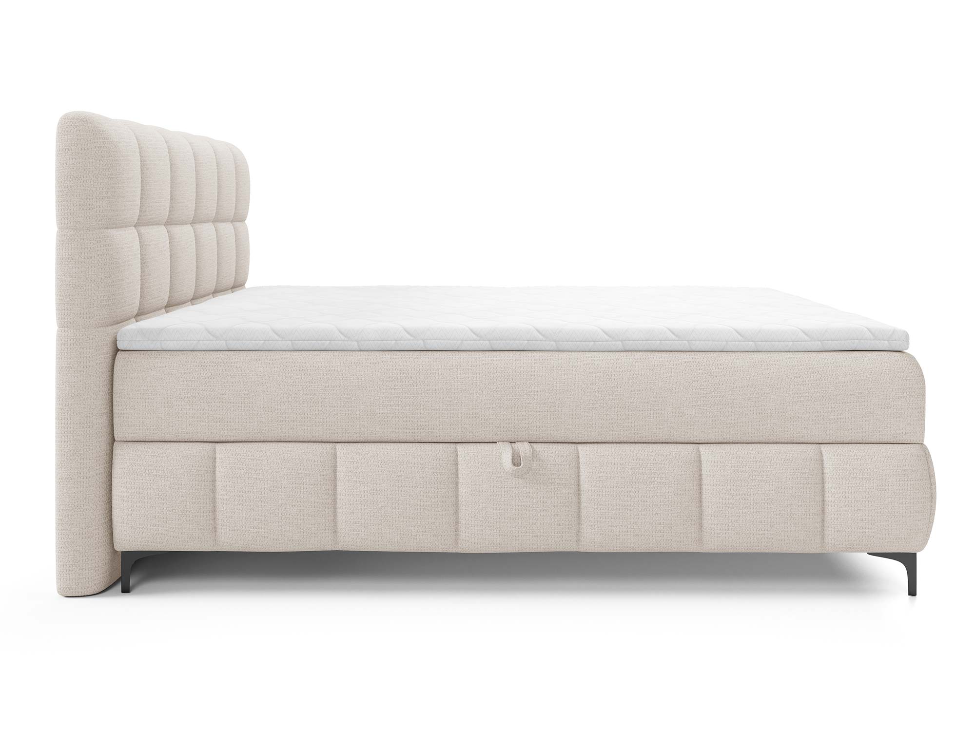 Ozdobne przeszycia na zagłowiu i skrzyniach nadają eleganckiego charakteru, a czarne metalowe nóżki wprowadzają loftowy akcent, który doskonale wpisuje się we współczesne aranżacje wnętrz. To łóżko jest stworzone dla osób, które cenią wygodę, funkcjonalność i design na najwyższym poziomie.