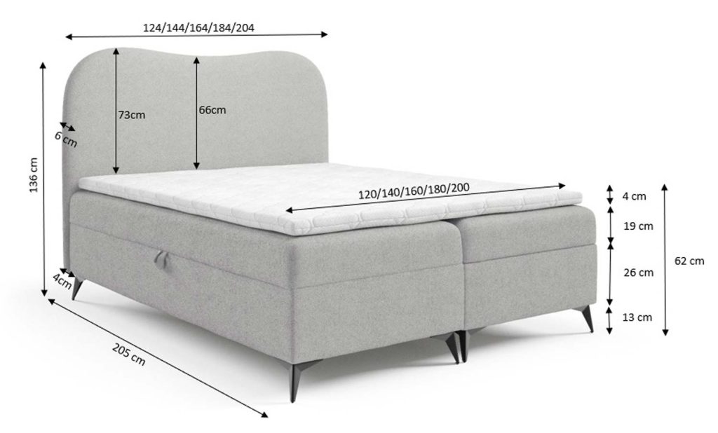 • Łóżko 200×200: Szer. 204 cm, Dł. 206 cm, Wys. zagłowia 128,5–136 cm, Pow. spania 63,5 cm, Waga: 151 kg