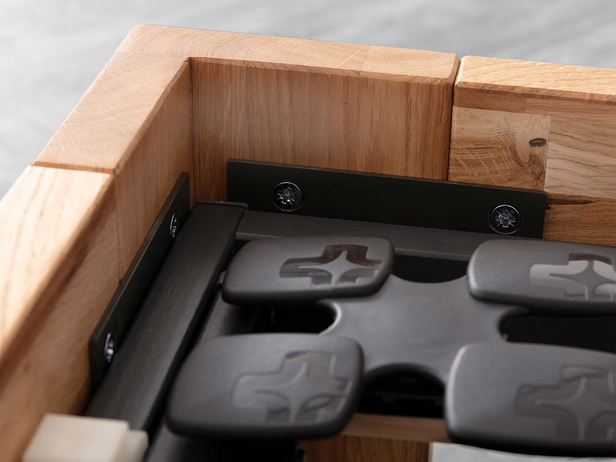 Solidna konstrukcja, cicha praca. Masywna rama, precyzyjne łączenia i wysokiej jakości okucia przekładają się na stabilność bez skrzypienia. Łóżko zachowuje sztywność również przy wyższych materacach.