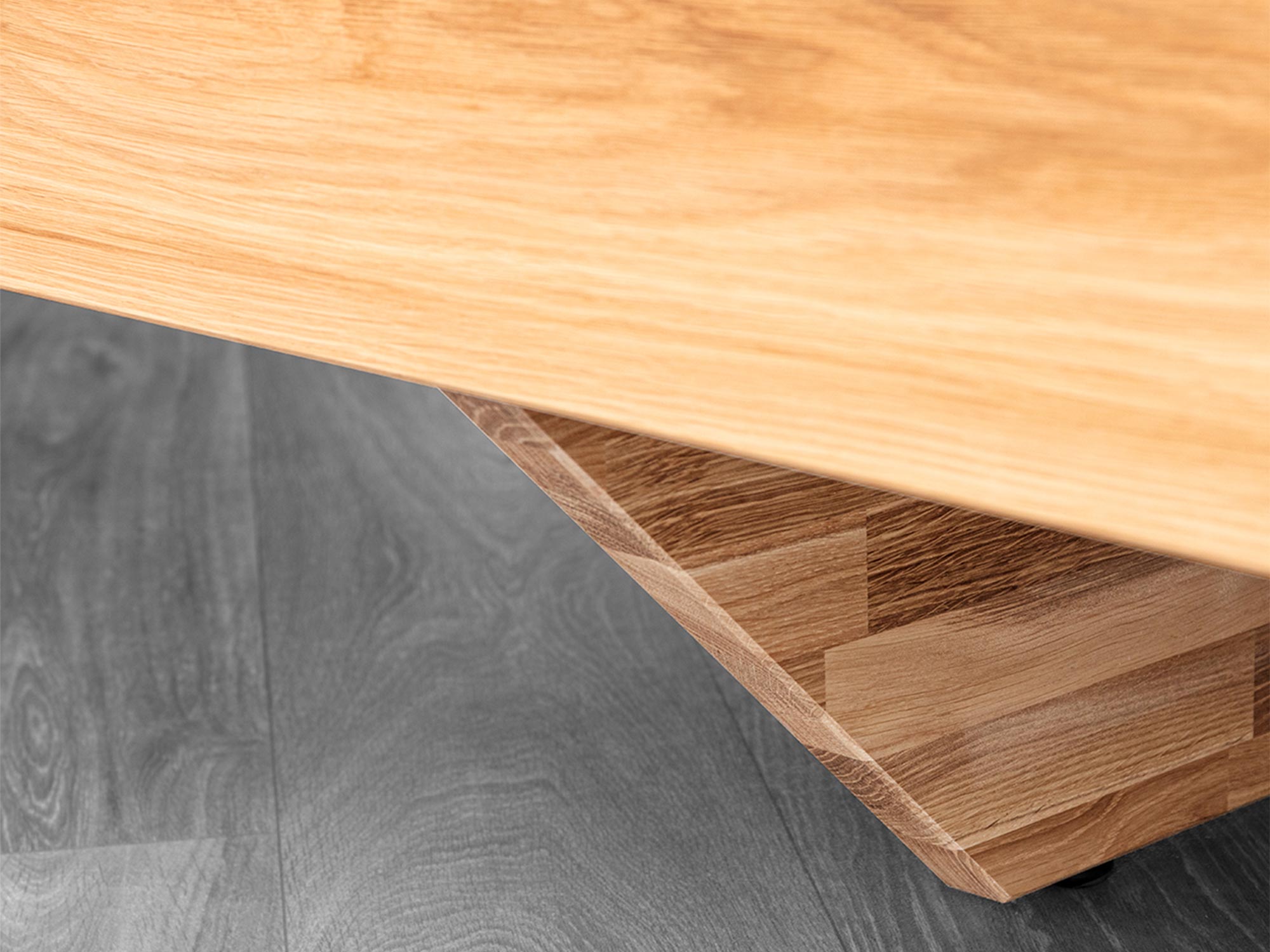 Prostota, która robi wrażenie. Garo A zachwyca czystą geometrią i spokojną linią, w której każdy milimetr ma znaczenie. Cofnięte nogi unoszą bryłę optycznie nad podłogą i „odchudzają” wizualnie masywny dąb. Ten zabieg nie tylko nadaje lekkości, ale również poprawia ergonomię sprzątania i dostęp światła pod meblem.