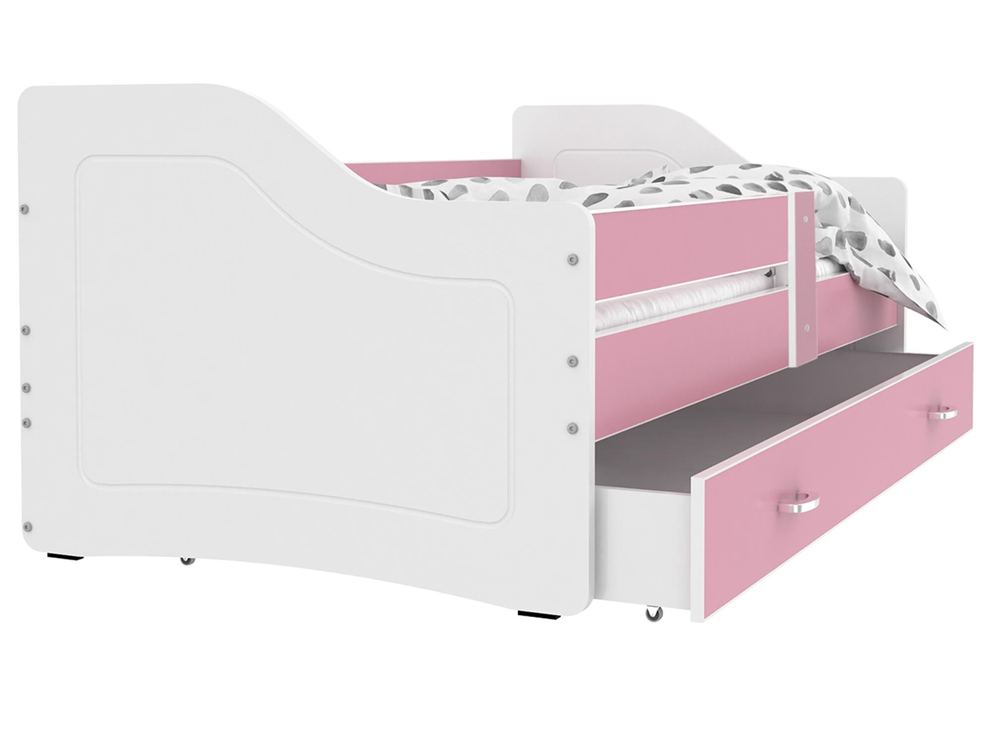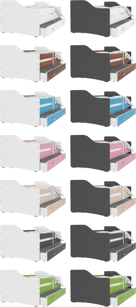 Co najważniejsze łóżko parterowe SWING to produkt, który cechuje się wygodą, bezpiecznym użytkowaniem i niepowtarzalnym designem. Wytrzymała i trwała struktura zapewniają odporność łóżka a także jego trwałość. Mebel wykonano z wysokiej jakości płyty meblowej o zaokrąglonych krawędziach i wyprofilowanymi ściankami, które mają na celu zapewnić bezpieczeństwo śpiącym dzieciom. W celu zwiększenia bezpieczeństwa korzystania z produktu został on pomalowany bezwonnym wodnym lakierem przeznaczonym do produktów dziecięcych. Łóżko wyposażono w stelaż flex wykonany z sprężynujących listw osadzonych w plastikowych kieszonkach, który zapewnia właściwą amortyzację materaca wraz z ciałem dziecka. W opcji jest też piankowy materac w pokrowcu o grubości 7 cm. Przez wzgląd na bogactwo charakterów i wykończeń w jakich urządzono dziecięce pokoje nasze produkty występują w wielu kolorach do wyboru. Do łóżka został dodany zestaw przeznaczony do montażu, który jest szybki i nieskomplikowany, jak również instrukcja.