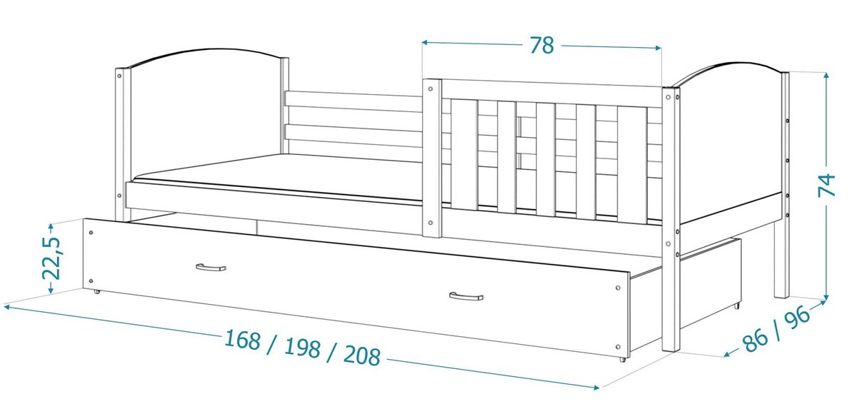 Łóżko parterowe z szufladą SONIO P to mebel, który cechuje się wygodą, bezpieczeństwem użytkowania i niepowtarzalnym charakterem. Stabilna i trwała konstrukcja gwarantują odporność łóżka a także jego trwałość. Mebel wyprodukowano z najwyższej klasy płyty meblowej z zaokrąglonymi krawędziami i profilowanymi bokami, które mają na celu zapewnić bezpieczeństwo śpiącym dzieciom. W celu zwiększenia bezpieczeństwa korzystania z produktu został on pomalowany bezwonnym wodnym lakierem przeznaczonym do produktów dziecięcych. Łóżko wyposażono w stelaż flex wykonany z osadzonych w plastikowych kieszonkach sprężynujących listw, który zapewnia właściwą amortyzację materaca wraz z ciałem dziecka. Do wyboru jest też piankowy materac w pokrowcu o grubości 7 cm. Przez wzgląd na bogactwo aranżacji i stylizacji w jakich zorganizowano sypialnie dziecięce nasze produkty są dostępne w kilku kolorach do wyboru. Do łóżka został dodany zestaw przeznaczony do montażu, który jest prosty i szybki, jak również instrukcja.