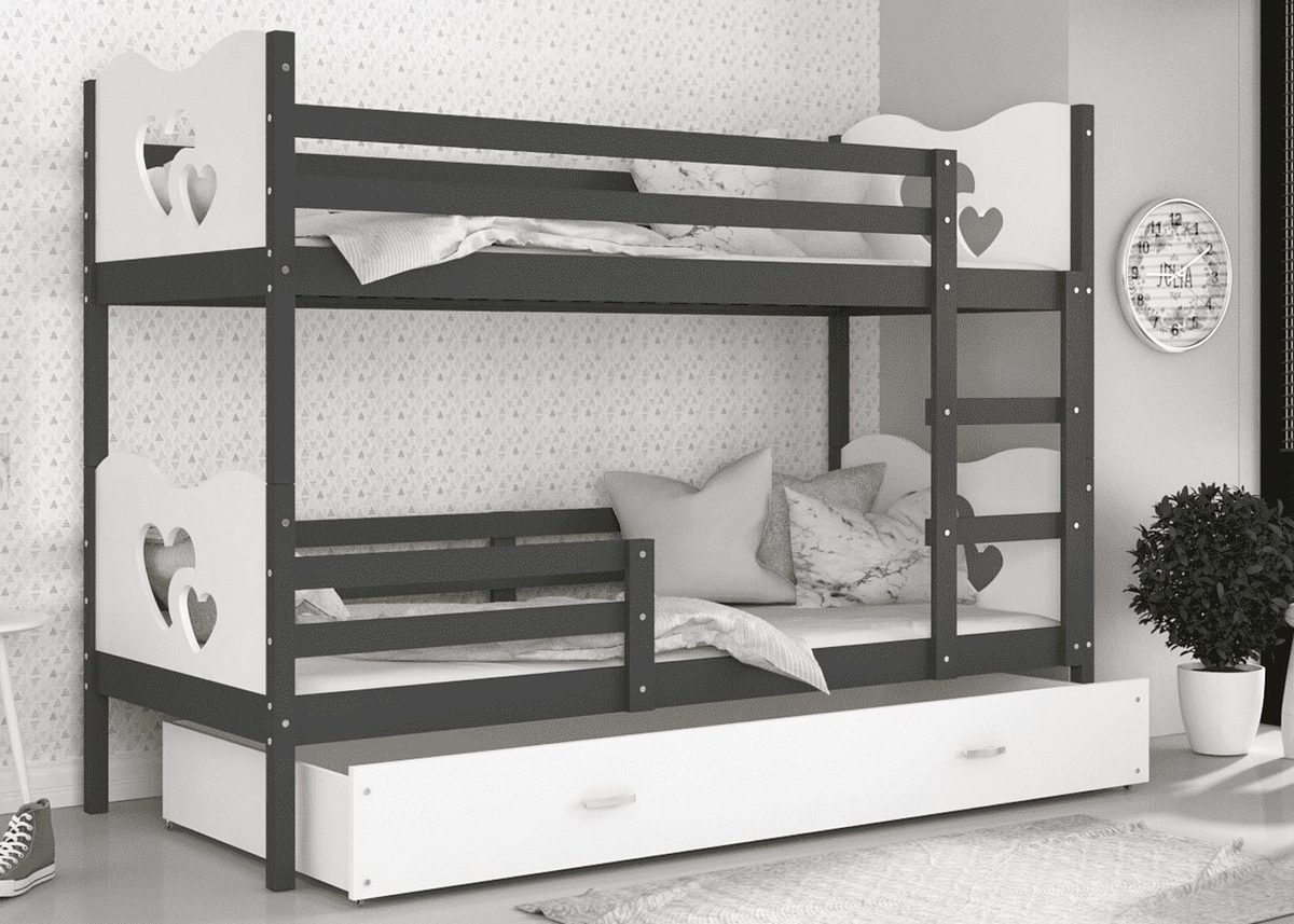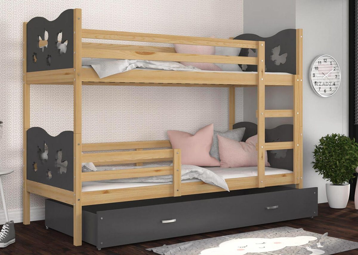 Łóżko piętrowe dla dziecka CUBI to mebel, który charakteryzuje się wygodą, bezpiecznym użytkowaniem i oryginalnym designem. Wytrzymała i trwała konstrukcja gwarantują odporność łóżka a także jego wytrzymałość. Mebel zrobiono z wysokiego gatunku płyty MDF i sosnowego drewna o zaokrąglonych krawędziach i wyprofilowanymi ściankami, które mają za zadanie zagwarantować bezpieczeństwo śpiącym dzieciom. Do łóżka dołączono pojemną wysuwaną na kółkach szufladę przeznaczoną do przechowywania pościeli, drabinkę która ułatwia wejście na wyższy poziom łóżka oraz barierki ochronne, które uniemożliwiają wypadnięcie dziecka, a także stelaż flex wykonany z osadzonych w plastikowych kieszonkach sprężynujących listw. W opcji jest też piankowy materac w pokrowcu o grubości 7 cm. Przez wzgląd na bogactwo estetyki i form w jakich urządzono dziecięce pokoje nasze produkty są dostępne w wielu kolorach oraz wzorach do wyboru. Do łóżka został dodany zestaw przeznaczony do montażu jak również instrukcja.