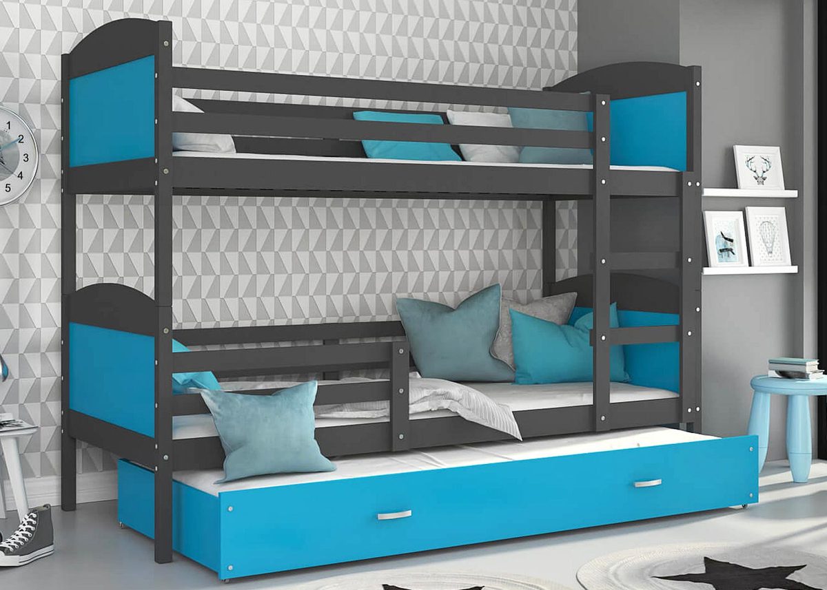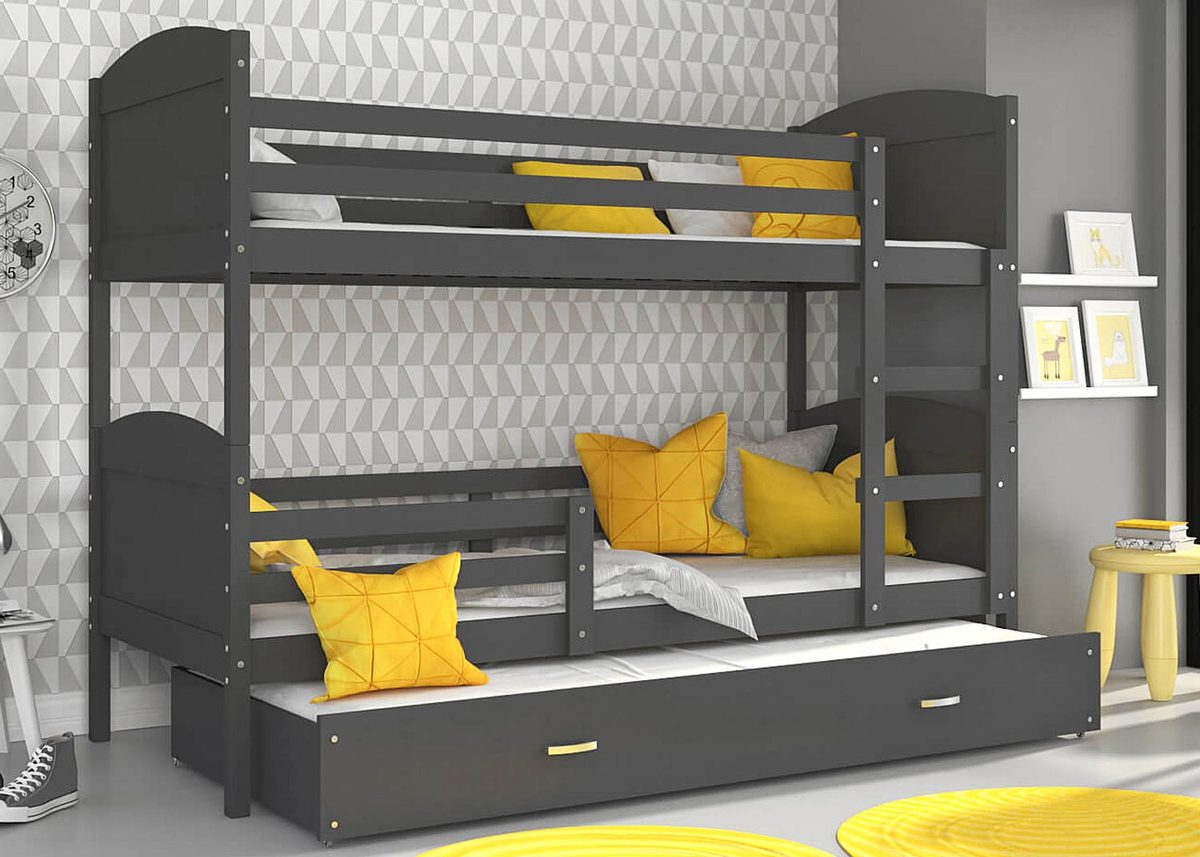 Łóżko piętrowe trzyosobowe CAROL 3 to mebel, który cechuje się wygodą, bezpiecznym użytkowaniem i niepowtarzalnym charakterem. Stabilna i trwała struktura gwarantują solidność łóżka a także jego trwałość. Mebel zrobiono z wysokiego gatunku płyty MDF o zaokrąglonych krawędziach i profilowanymi bokami, które mają na celu zagwarantować bezpieczeństwo śpiącym dzieciom. Do łóżka dołączono pakowną szufladę wysuwaną na kółkach przeznaczoną do przechowywania pościeli oraz do spania, drabinkę ułatwiającą wejście na piętro łóżka oraz barierki ochronne, które uniemożliwiają wypadnięcie dziecka, a także stelaż flex zrobiony z sprężynujących listw osadzonych w plastikowych kieszonkach. Do wyboru jest też materac z pianki w pokrowcu o grubości 7 cm. Przez wzgląd na bogactwo wykończeń i stylów w jakich zorganizowano dziecięce sypialnie nasze produkty są dostępne w kilku kolorach do wyboru. Do łóżka dołączono zestaw przeznaczony do montażu jak również instrukcja.