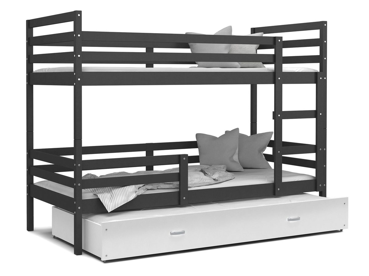 Piętrowe łóżko łóżko trzyosobowe DAVIS 3 to produkt, który charakteryzuje się komfortem, bezpiecznym użytkowaniem i oryginalnym designem. Stabilna i mocna struktura gwarantują solidność łóżka a także jego wytrzymałość. Mebel wyprodukowano z wysokiego gatunku płyty MDF z zaokrąglonymi krawędziami i profilowanymi bokami, które mają na celu zagwarantować bezpieczeństwo śpiącym dzieciom. Łóżko posiada pakową wysuwaną na kółkach szufladę dedykowaną do przechowywania pościeli, drabinkę ułatwiającą wejście na piętro łóżka oraz barierki ochronne, które zapobiegają wypadnięciu dziecka, a także stelaż flex wykonany z sprężynujących listw osadzonych w plastikowych kieszonkach. W opcji jest też piankowy materac w pokrowcu o grubości 7 cm. Przez wzgląd na rozmaitość charakterów i wykończeń w jakich umeblowano sypialnie dziecięce nasze produkty są dostępne w wielu wybarwieniach do wyboru. Do łóżka został dodany zestaw przeznaczony do montażu jak również instrukcja.