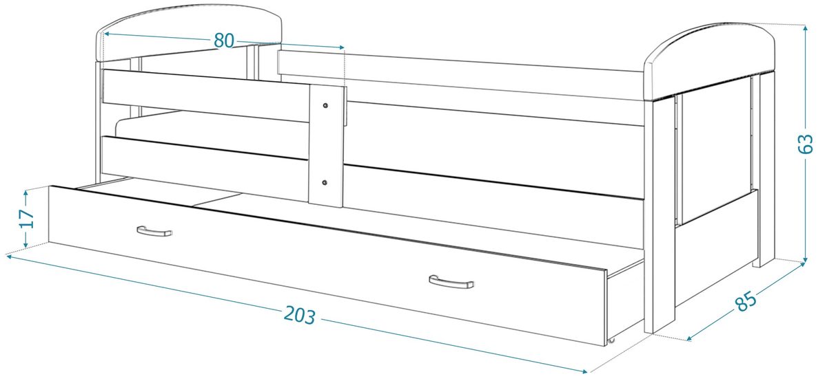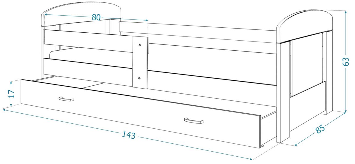 Wytrzymała i trwała konstrukcja gwarantują solidność łóżka a także jego wytrzymałość. Mebel wyprodukowano z najwyższej klasy płyty meblowej z zaokrąglonymi krawędziami i wyprofilowanymi ściankami, które mają za zadanie zagwarantować bezpieczeństwo śpiącym dzieciom. W celu zwiększenia bezpieczeństwa korzystania z produktu został on pomalowany bezwonnym wodnym lakierem przeznaczonym do produktów dziecięcych. Łóżko wyposażono w stelaż flex zrobiony z osadzonych w plastikowych kieszonkach sprężynujących listw, który zapewnia właściwą amortyzację materaca wraz z ciałem dziecka.. W opcji jest też piankowy materac w pokrowcu o grubości 7 cm. Przez wzgląd na rozmaitość wykończeń i stylów w jakich umeblowano sypialnie dziecięce nasze produkty występują w wielu kolorach do wyboru. Do łóżka został dodany zestaw przeznaczony do montażu, który jest łatwy i szybki, jak również instrukcja. Łóżko dla dziecka z grafiką Filip Sz to produkt, który cechuje się komfortem, bezpieczeństwem użytkowania i innowacyjnym charakterem.