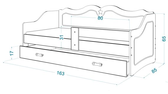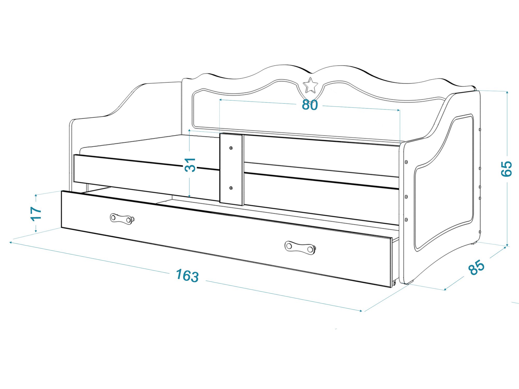 Jednym z największych atutów łóżka jest wysuwana szuflada na kółkach. To dodatkowe miejsce, które można wykorzystać na pościel, koce, zabawki czy drobiazgi dziecka. Dzięki temu utrzymanie porządku w pokoju staje się łatwiejsze niż kiedykolwiek. Szuflada została wyposażona w praktyczne uchwyty, które ułatwiają codzienne użytkowanie nawet najmłodszym.