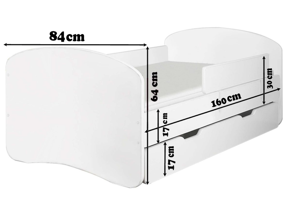 Wysokość: 64 cm | Wysokość powierzchni spania: 34 cm | Szerokość: 84 cm | Długość: 160 cm | Wysokość szuflady: 17 cm