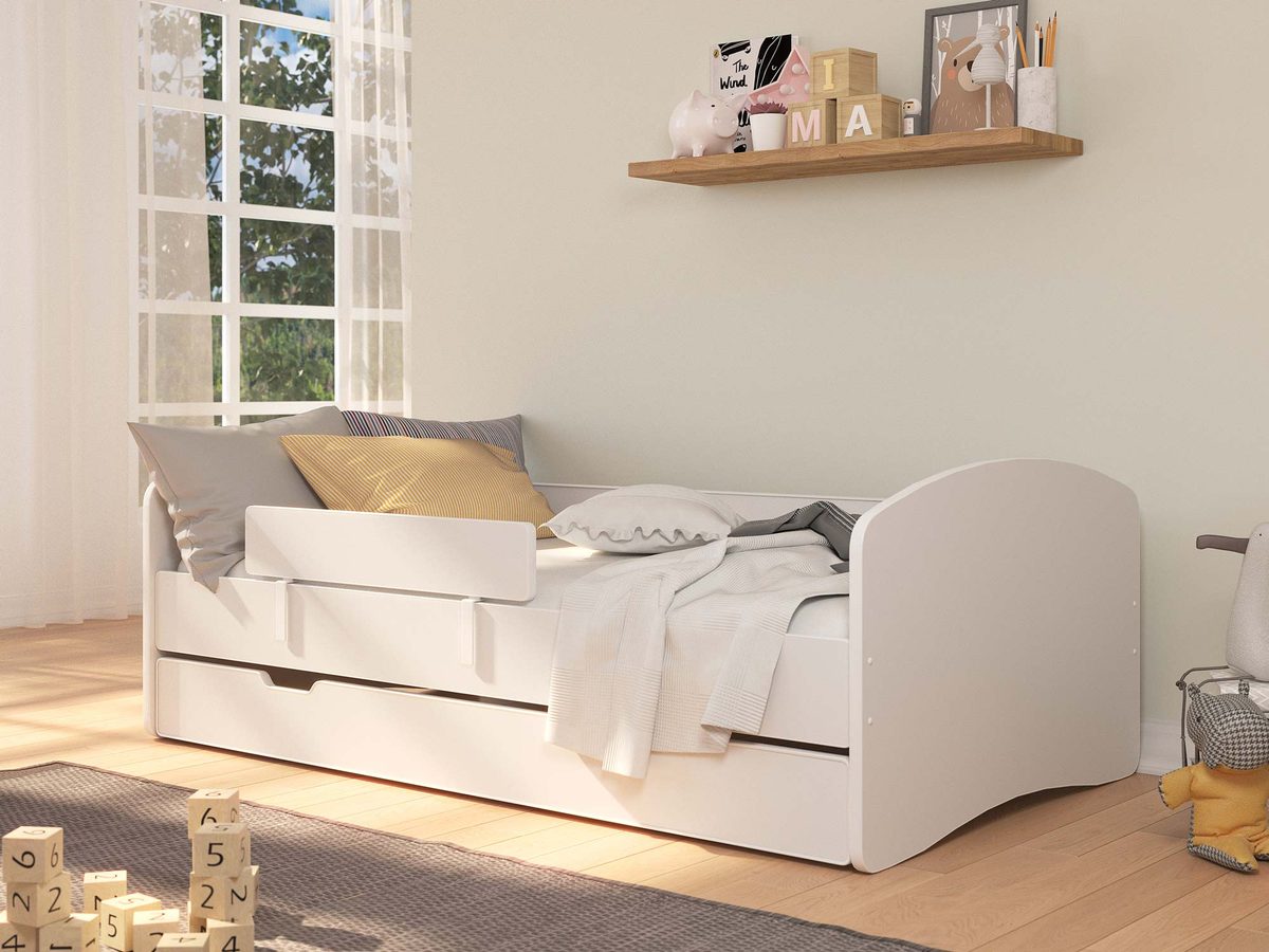 Co najważniejsze prezentowane łóżko DERVIS zadba o bezpieczny sen każdego dziecka. Przede wszystkim zastosowana barierka zapobiega spadnięciu dziecka z łóżka, nawet przy najbardziej ruchliwym użytkowniku. Co więcej, w meblu zastosowano zaokrąglone obrzeża, co w przypadku uderzenia znacznie zminimalizuje obrażenia. Dodatkowo, mebel w klasycznym białym kolorze, dostępny w kilku rozmiarach będzie prezentować się niezwykle schludnie zarówno w pokoju dziewczynki jak i chłopca. Ponadto, wbudowany pojemny schowek to doskonałe rozwiązanie na zaoszczędzenie przestrzeni, co w pokoju dziecięcym jest wyjątkowo przydatne. Co więcej zastosowany materac piankowy to gwarancja spokojnego i wygodnego snu. Dodatkowo materac posiada pokrowiec z certyfikowanej tkaniny TEXFIL.