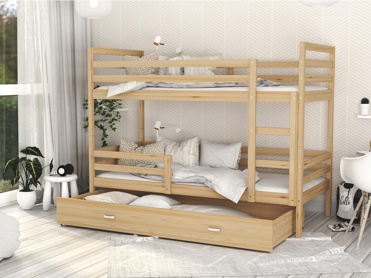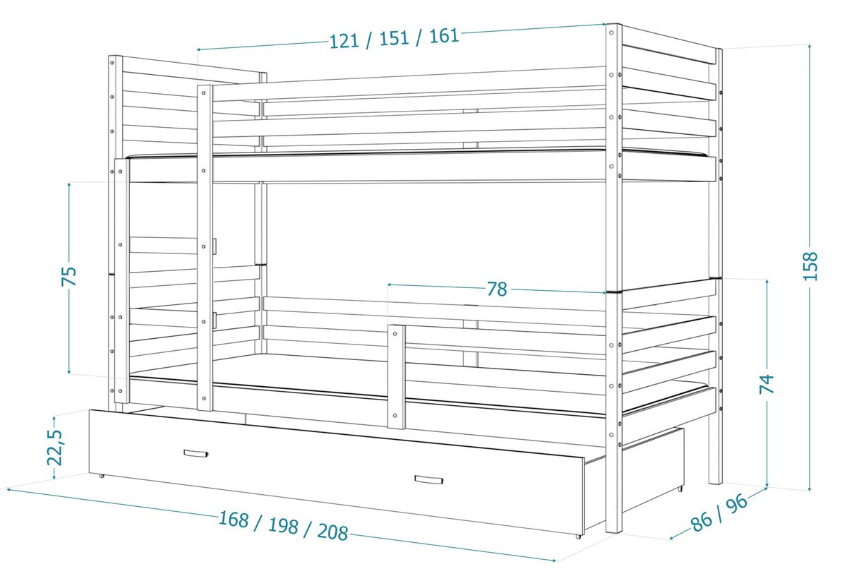 Piętrowe łóżko dziecięce DAVIS to mebel, który charakteryzuje się komfortem, bezpieczeństwem użytkowania i oryginalnym designem. Stabilna i trwała konstrukcja gwarantują odporność łóżka a także jego wytrzymałość. Mebel wykonano z najwyższej klasy drewna sosnowego i płyt MDF z zaokrąglonymi krawędziami i wyprofilowanymi ściankami, które mają za zadanie zapewnić bezpieczeństwo śpiącym dzieciom. Łóżko zostało wyposażone w pojemną wysuwaną na kółkach szufladę przeznaczoną do przechowywania pościeli, drabinkę która ułatwia wejście na piętro łóżka oraz barierki ochronne, które zapobiegają wypadnięciu dziecka, a także stelaż flex wykonany z sprężynujących listw osadzonych w plastikowych kieszonkach. W opcji jest też piankowy materac w pokrowcu o grubości 7 cm. Przez wzgląd na różnorodność charakterów i wykończeń w jakich urządzono sypialnie dziecięce nasze produkty są dostępne w wielu wybarwieniach do wyboru. Do łóżka został dodany zestaw przeznaczony do montażu jak również instrukcja.