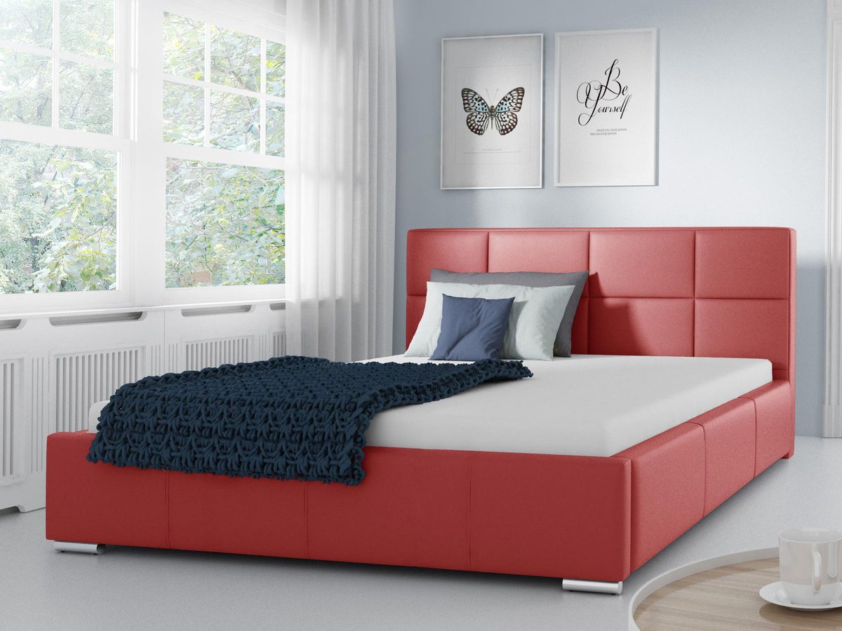 Tapicerowane łóżko w czerwieni z prostym wezgłowiem i szarym pledem