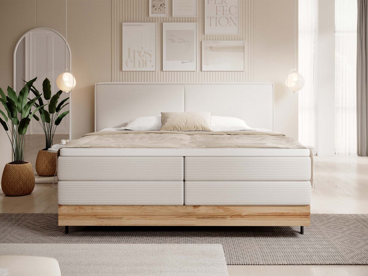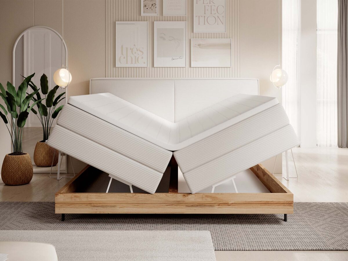 Pod elegancką formą kryje się sprawdzony system box springs: warstwowa konstrukcja odpowiada za elastyczność i prawidłowe podparcie ciała, a dwukomorowe pojemniki na pościel (po obu stronach) pomagają utrzymać porządek bez rezygnacji z estetyki. NEBIA to wybór, który cieszy oko i dba o kręgosłup – codziennie.