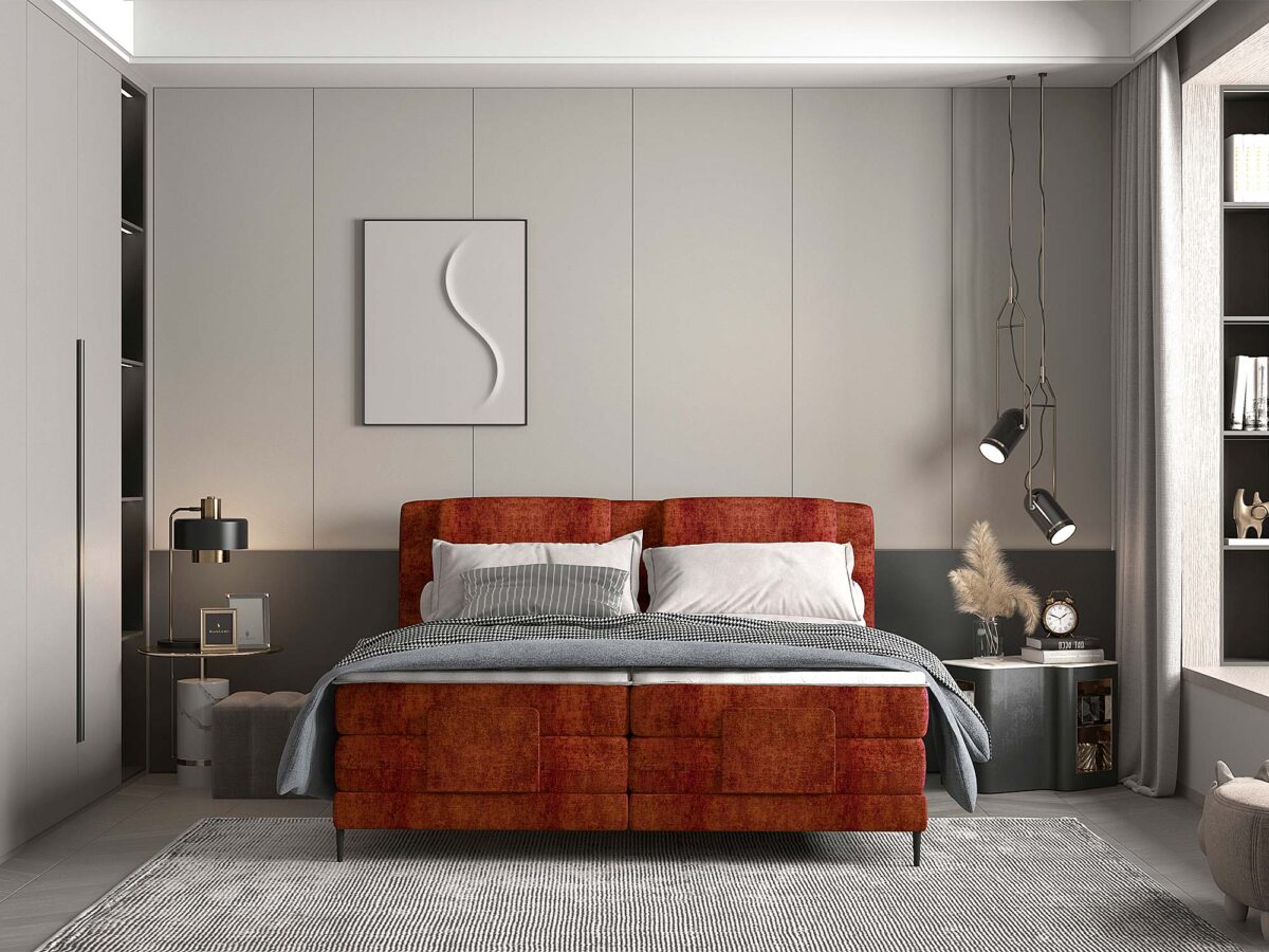 Łóżko kontynentalne ceglane tapicerowane w eleganckim wnętrzu