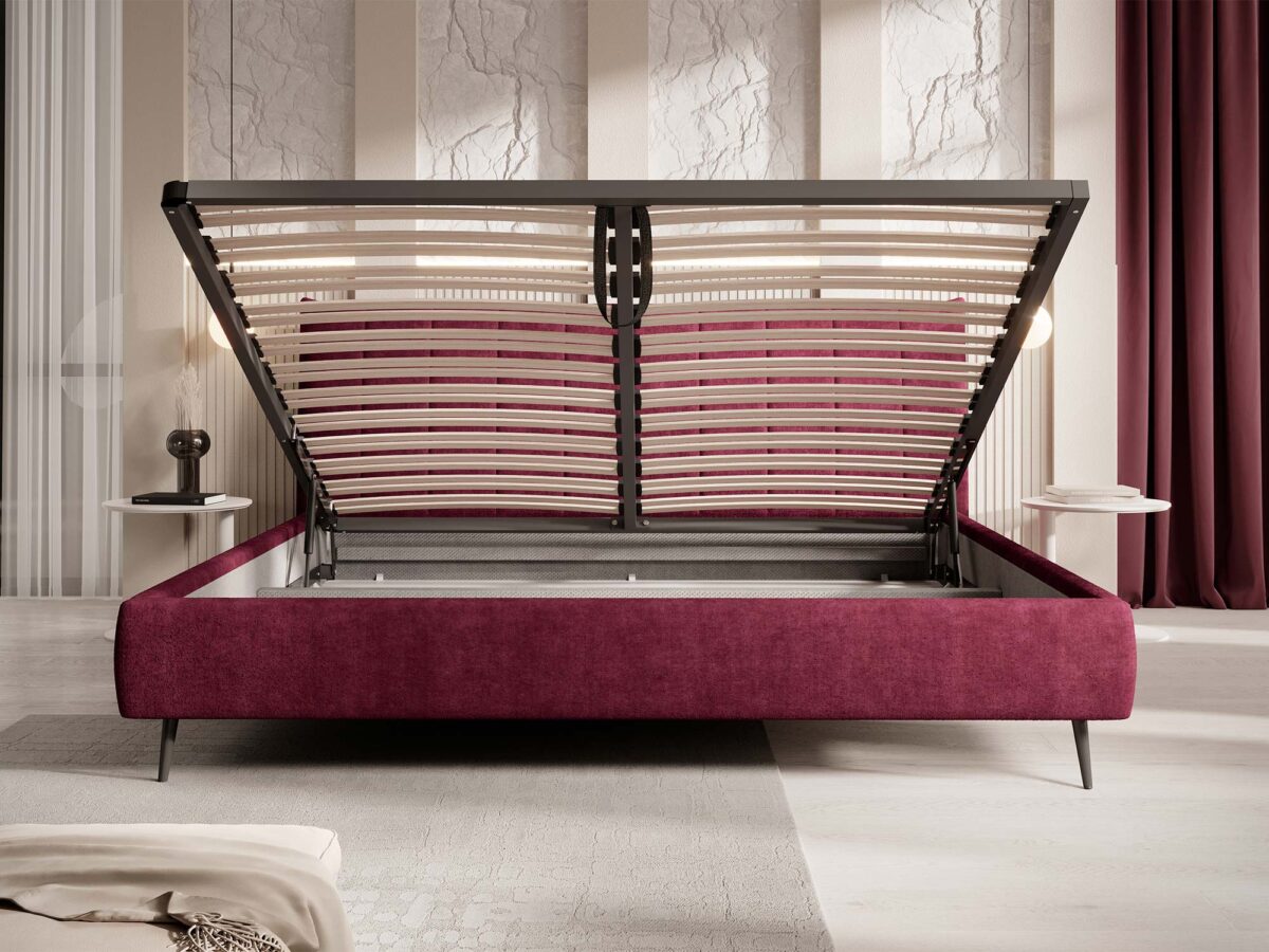 Serce modelu Elia to funkcjonalność: pojemnik na pościel na całej powierzchni łóżka otwierany przy pomocy podnośników gazowych. Uniesiesz stelaż płynnie i bez wysiłku – nawet przy cięższym materacu – a wnętrze pojemnika bez trudu pomieści kołdry, poduszki, sezonowe tekstylia czy dodatkowy komplet bielizny pościelowej. To realny zysk miejsca, szczególnie w mieszkaniach, gdzie każdy centymetr ma znaczenie.