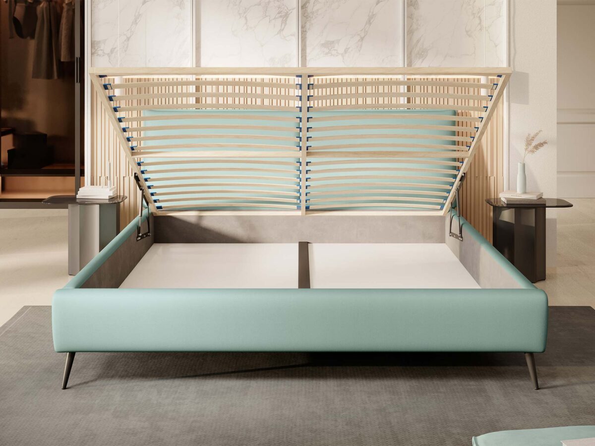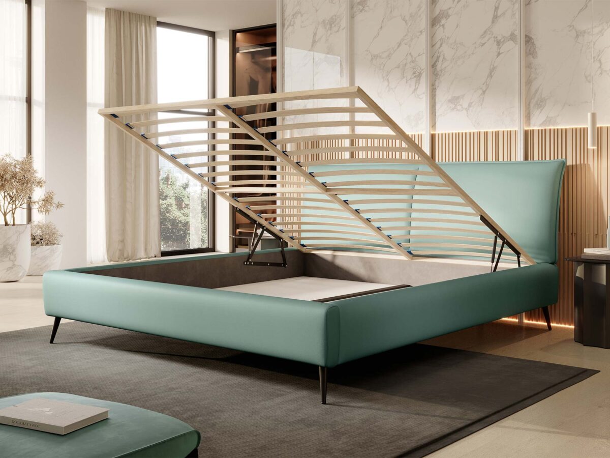 Praktyczność dopełnia przestronny pojemnik na pościel, dostępny po uniesieniu stelaża (mechanizm otwierania zgodny z zastosowaną wersją). Bez problemu przechowasz w nim kołdry, poduszki i sezonowe tekstylia. Pojemnik ma pełny format odpowiadający wybranej powierzchni spania, dlatego wykorzystujesz maksimum dostępnej przestrzeni pod materacem.